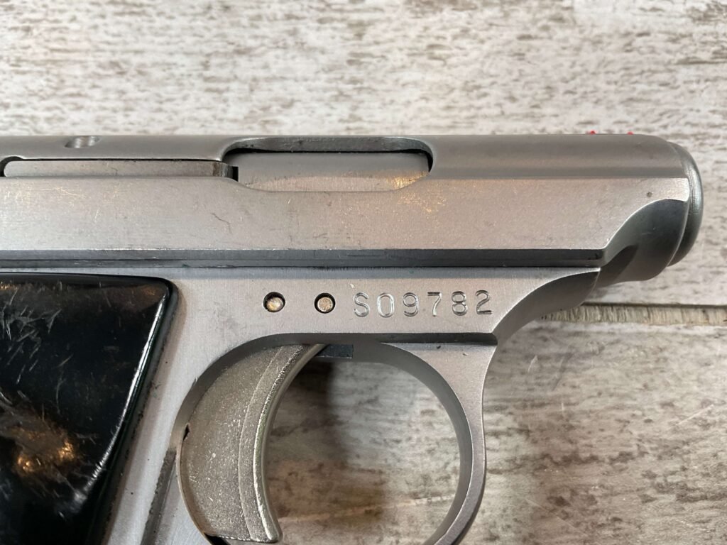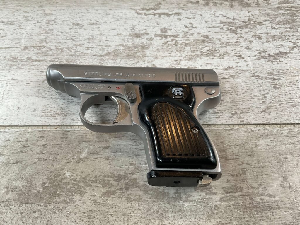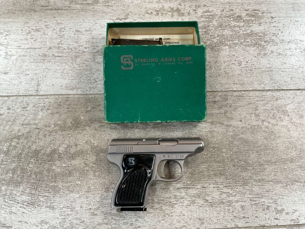 STERLING ARMS .25 AUTO MODEL 300 SEMI AUTO VEST/POCKET PISTOL IN ORIGINAL BOX #S 09782, 2″ BBL, EXC STAINLESS STEEL FINISH, 6 ROUND MAGAZINE, EXC BLACK PLASTIC GRIPS W/STERLIN ARMS LOGO, EXC BRIGHT BORE & RIFLING, GREAT LITTLE .25 AUTO SHOOTER!!