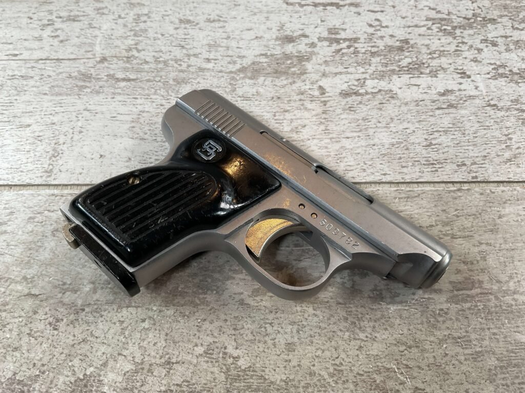 The Sterling Arms Model 300 is a compact, semi-automatic vest or pocket pistol chambered in .25 ACP (Automatic Colt Pistol). Here’s a simplified description focusing on the specifics of the model and its accessories: