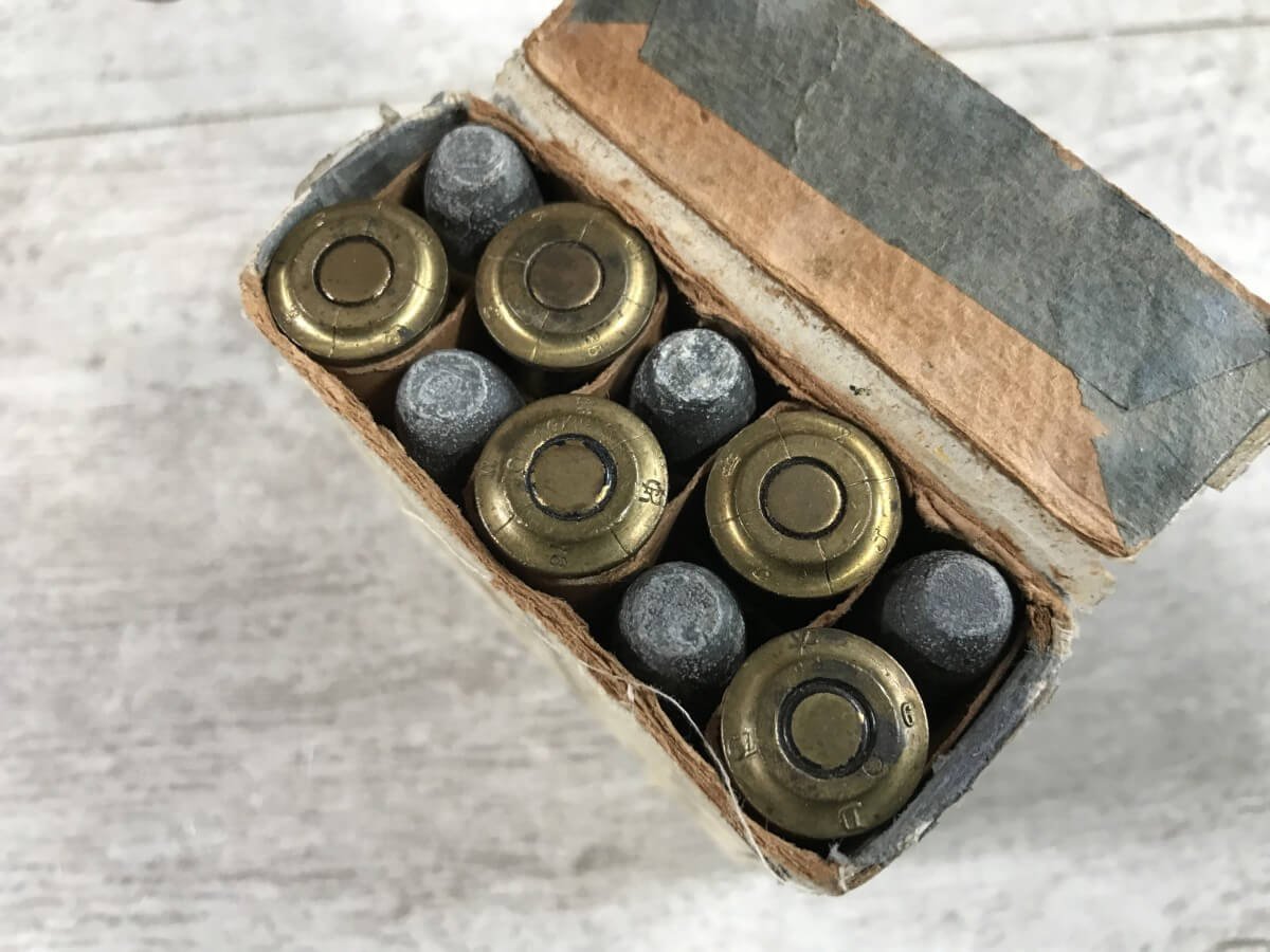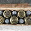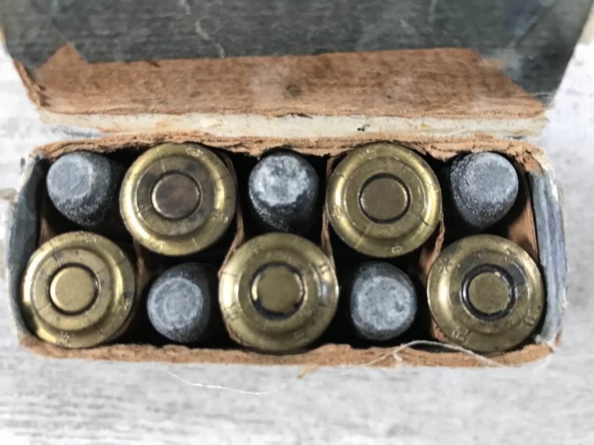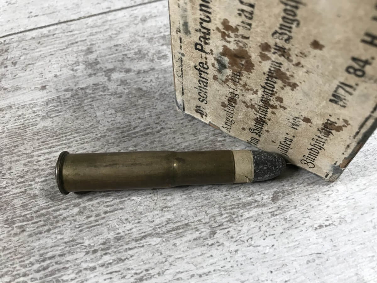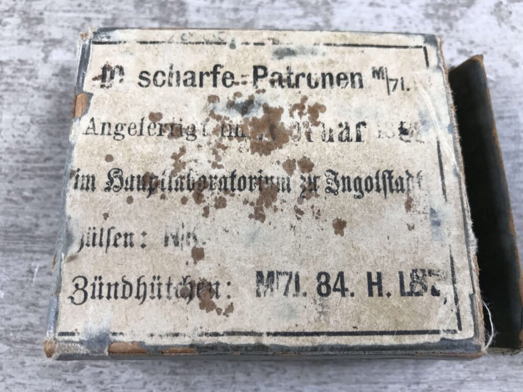 SKU#909 11MM MAUSER PAPER PATCHED AMMO, RARE, MARKED “CROWN” “10 1878”, “9 1879”, “85”, “86”, FULL BOX, FOR 1888 AMBERG MAUSER 71/84, VERY RARE AND HIGHLY COLLECTIBLE