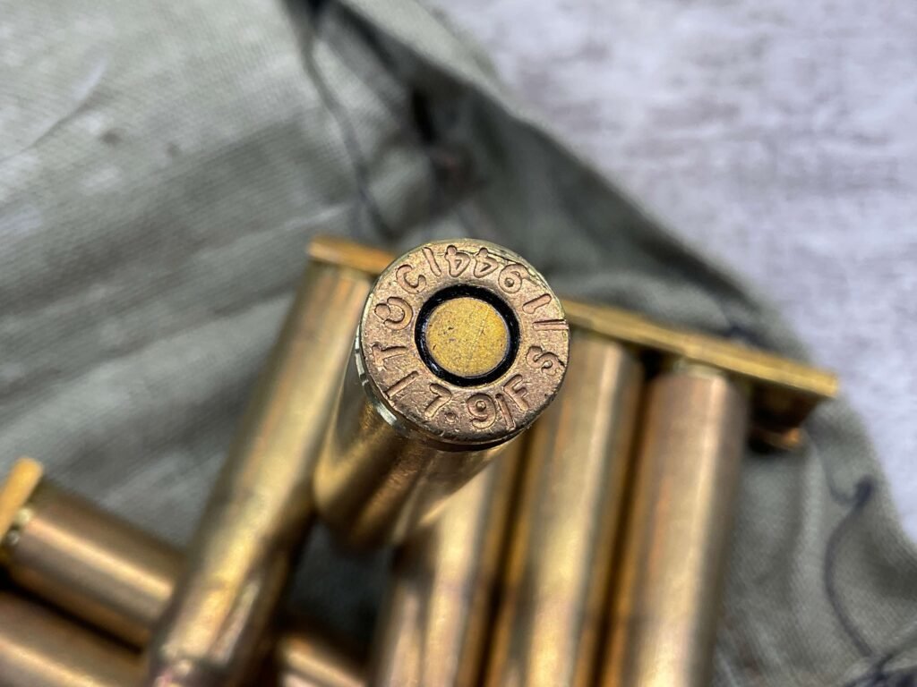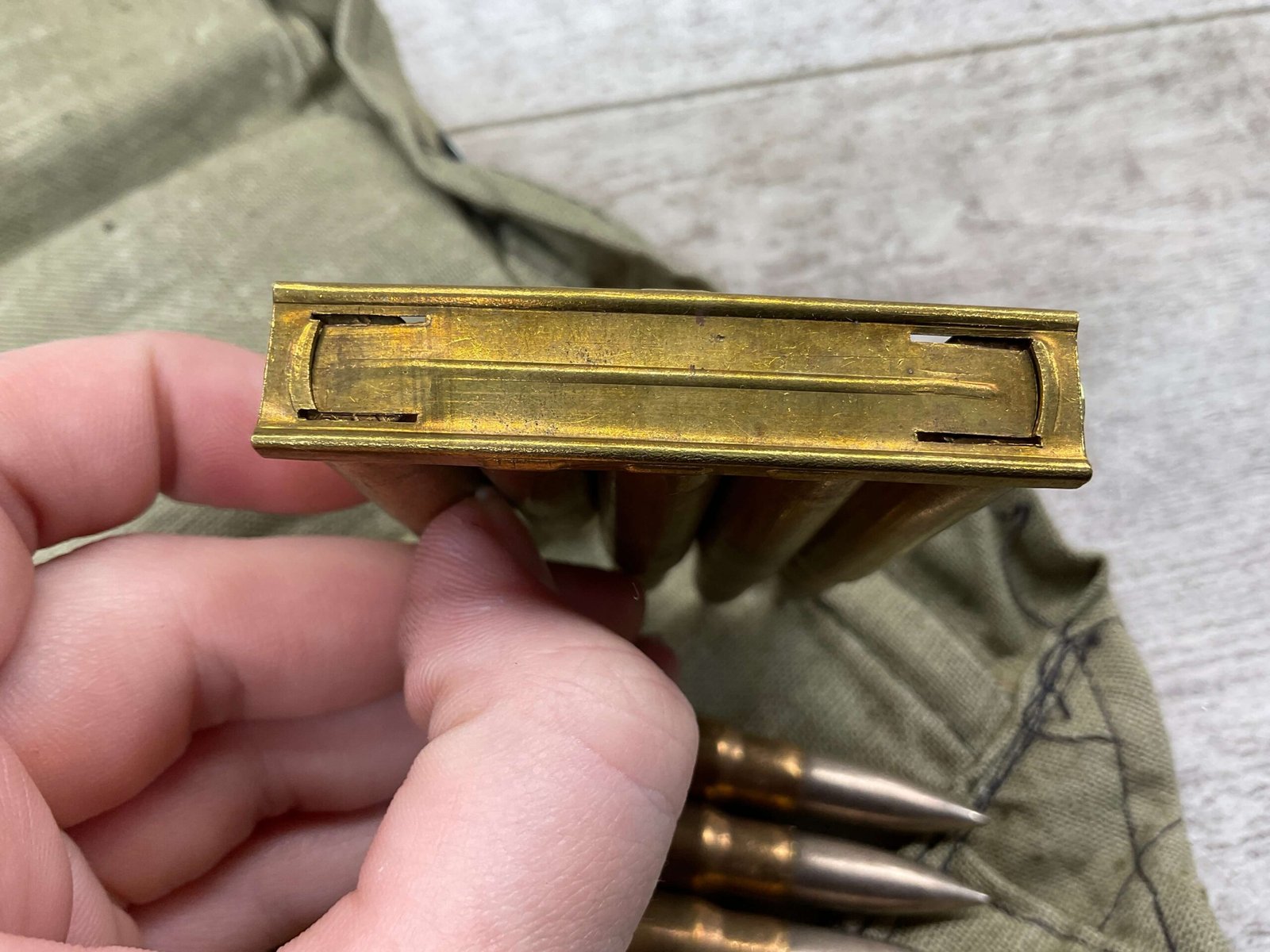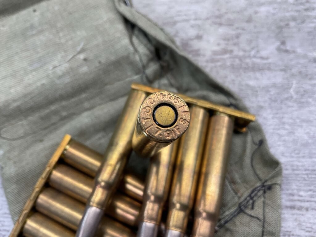 8MM MAUSER TURKISH SURPLUS 70RD BANDOLIER ON CLIPS, EXC CONDITION, 70RD BRASS 8MM AMMO ON 5RD STRIPPER CLIPS, 14 STRIPPER CLIPS, 70ROUNDS TOTAL, GREAT FOR DISPLAY OR SHOOTING, CORROSIVE AMMO