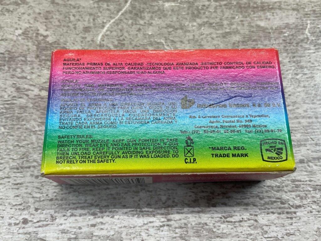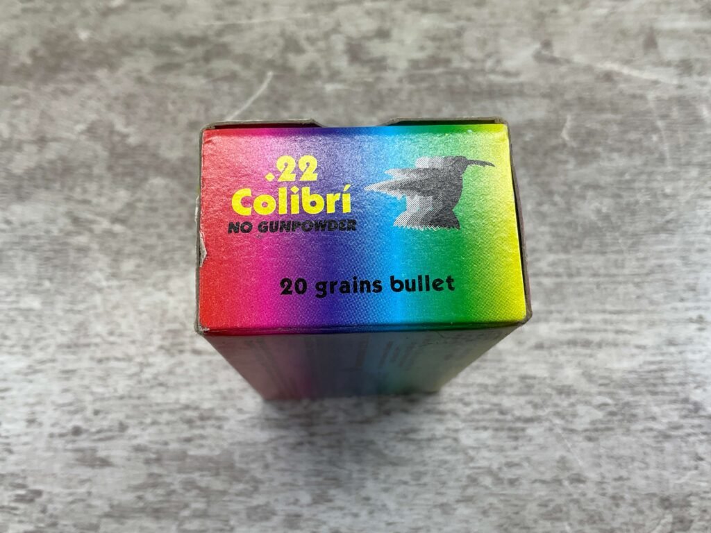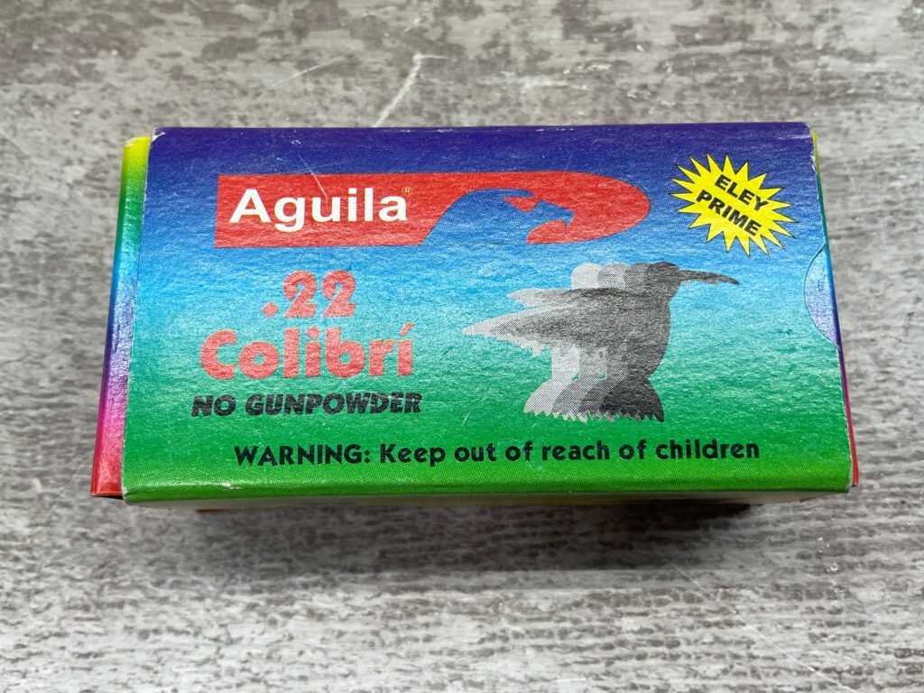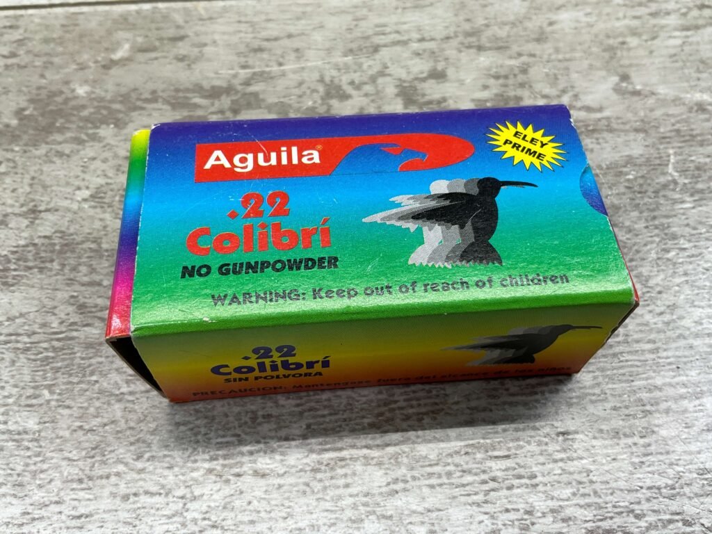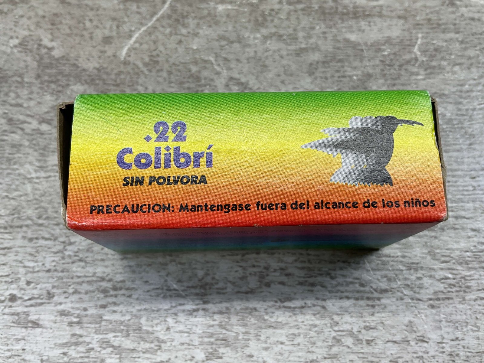 AGUILA .22 COLIBRI NO GUNPOWDER AMMO, QTY 37 OF 50, 20 GRAINS BULLET, BOX IS IN BEAUTIFUL CONDITION WITH RAINBOW COLORS, NO RIPS/TEARS/CRACKS, MADE IN MEXICO, COOL COLLECTORS FIND!