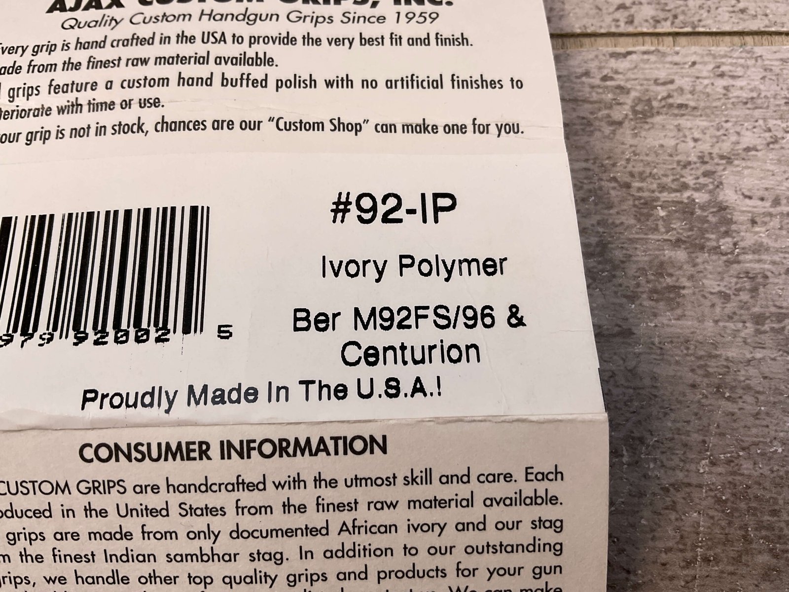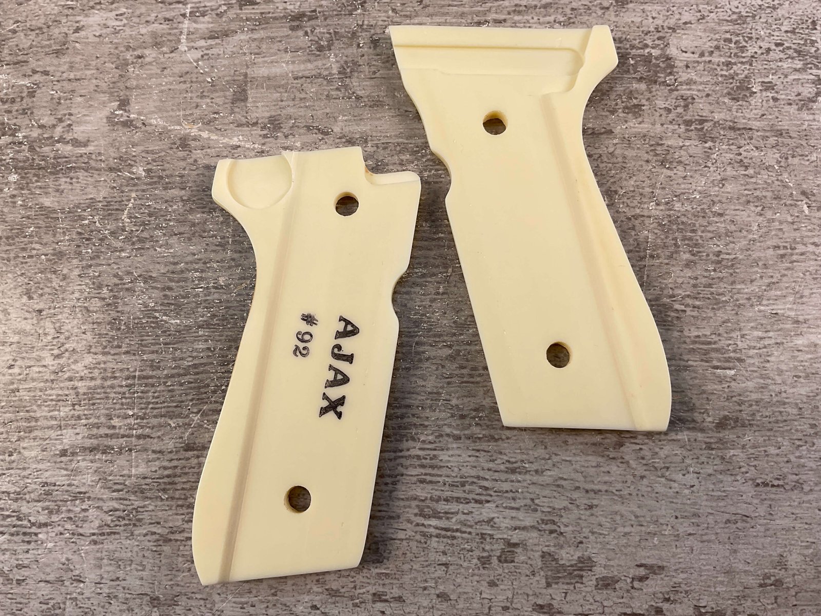 AJAX CUSTOM GRIPS BERETTA M92FS/96 & CENTURION IVORY POLYMER COLORED GRIPS, #92-IP, NO SCREW, IN EXC. CONDITION!