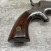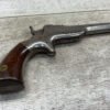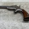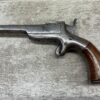 ALLEN & WHEELOCK SIDE-SWING .32RF SINGLE SHOT PISTOL, ANTIQUE #100 .32 RIMFIRE, POOR HEAVILY FROSTED 4″ OCTAGON BARREL, SIDE SWING, FINISH TURNED GREY PATINA, ORIGINAL SMOOTH WALNUT GRIPS W/ SERIAL STAMPED, CURRENTLY NON-FUNCTIONING, NOT A REPRODUCTION, OVERALL CONDITION AS SEEN IN PHOTOS.
