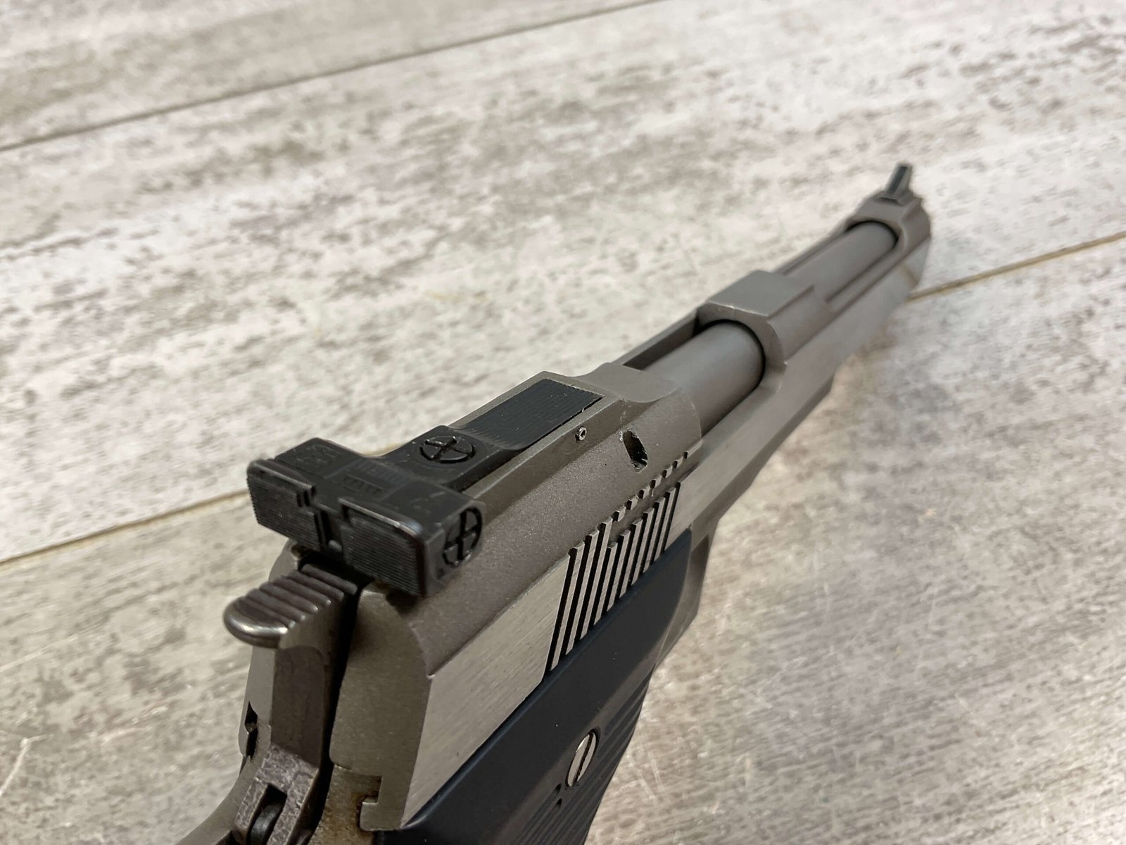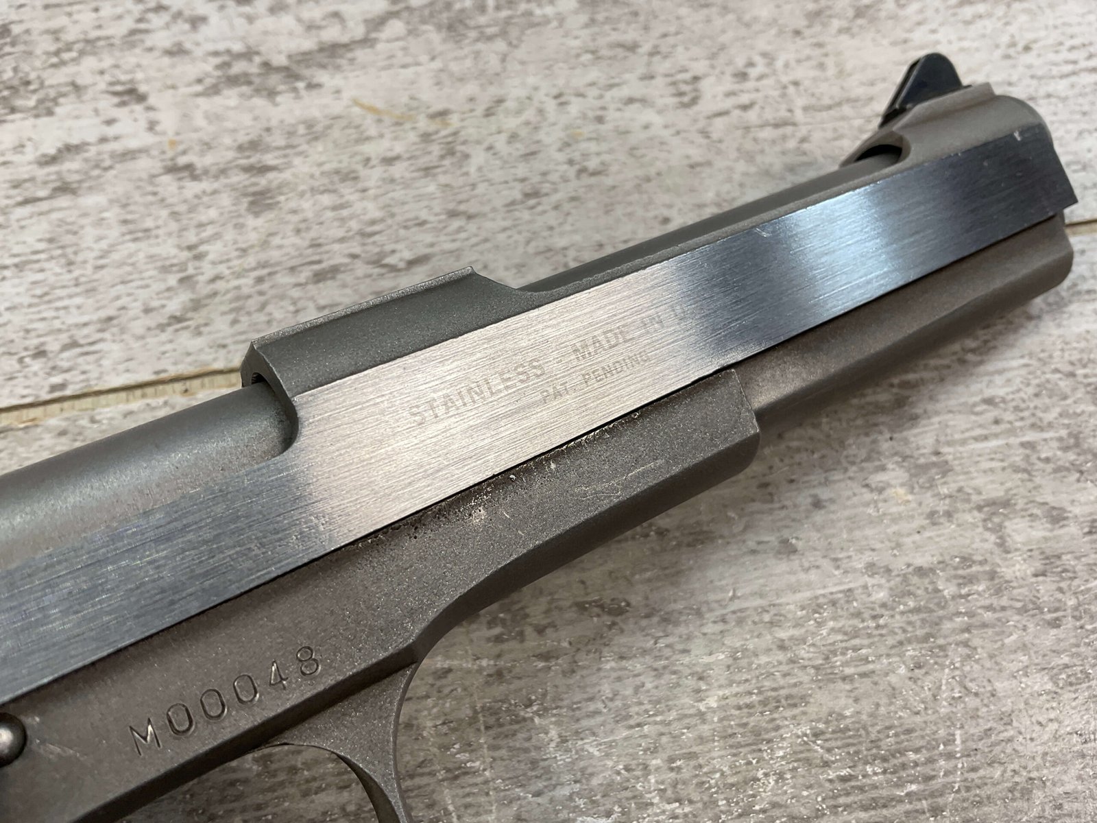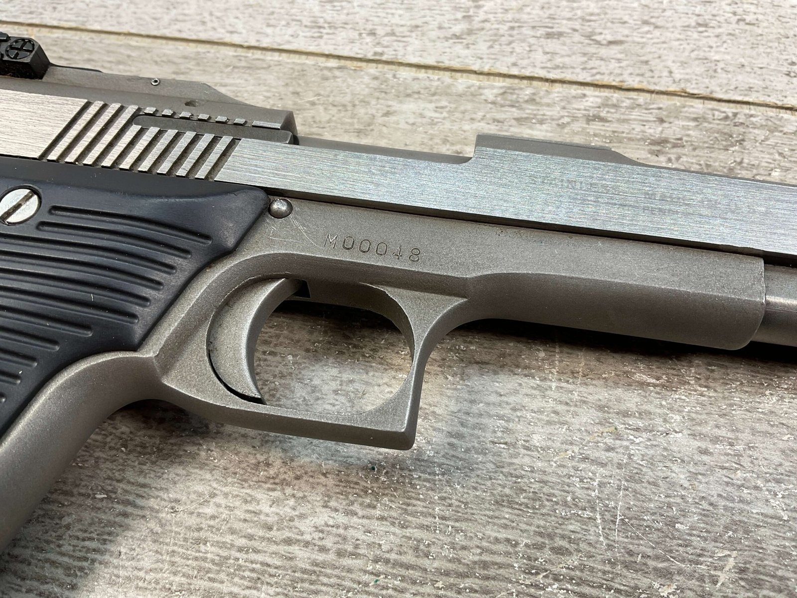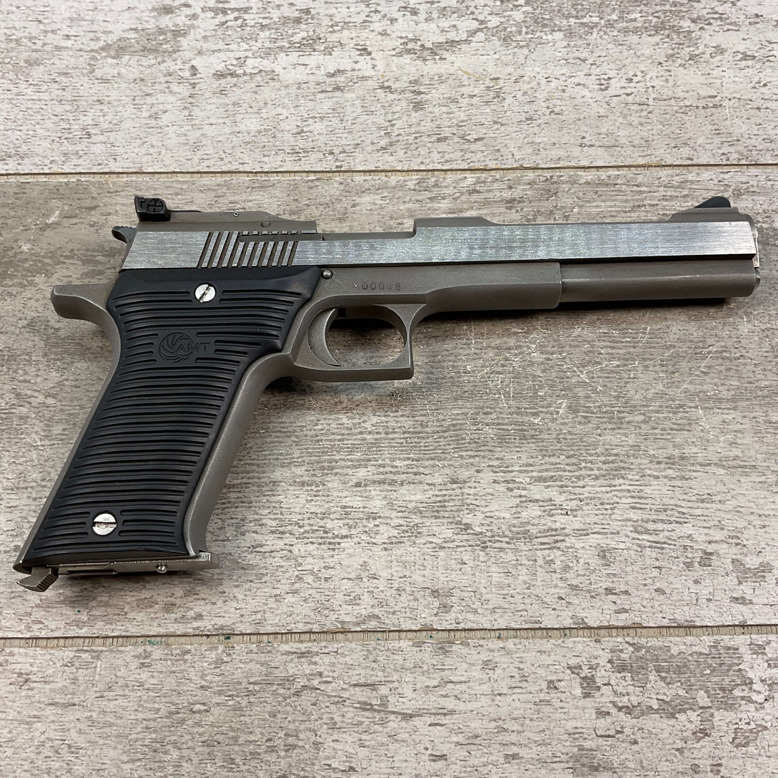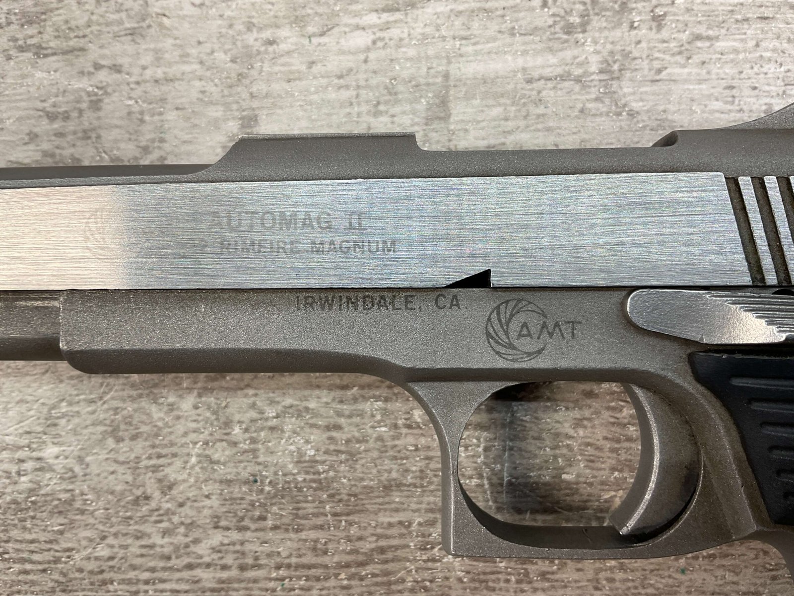 AMT AUTOMAG II .22 RIMFIRE MAGNUM SEMI AUTO PISTOL #M00048, 6″ BARREL, EXC BRIGHT BORE & RIFLING, EXC STAINLESS SLIDE FINISH, LEXAN GROOVED POLYMER GRIPS, 1 – 9 ROUND MAGAZINE, SHOWS VERY LIGHT WEAR FROM USE/AGE, NICE CRISP TRIGGER, MANUAL SAFETY, OVERALL CONDITION AS SEEN IN PHOTOS!!