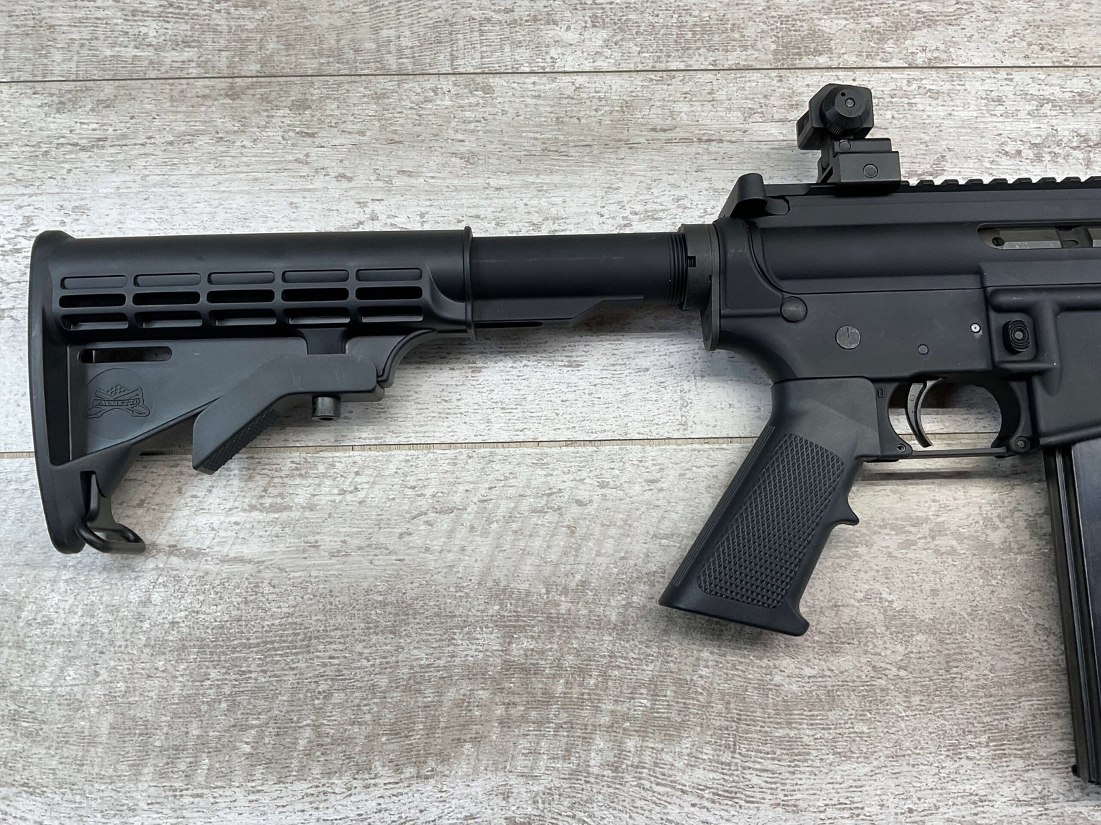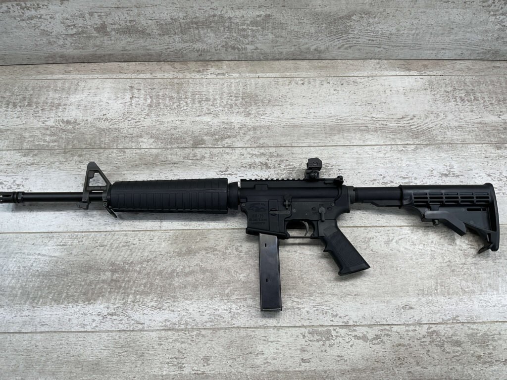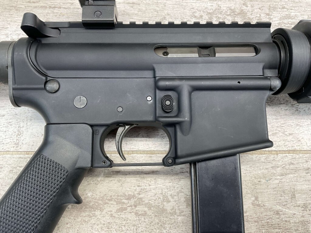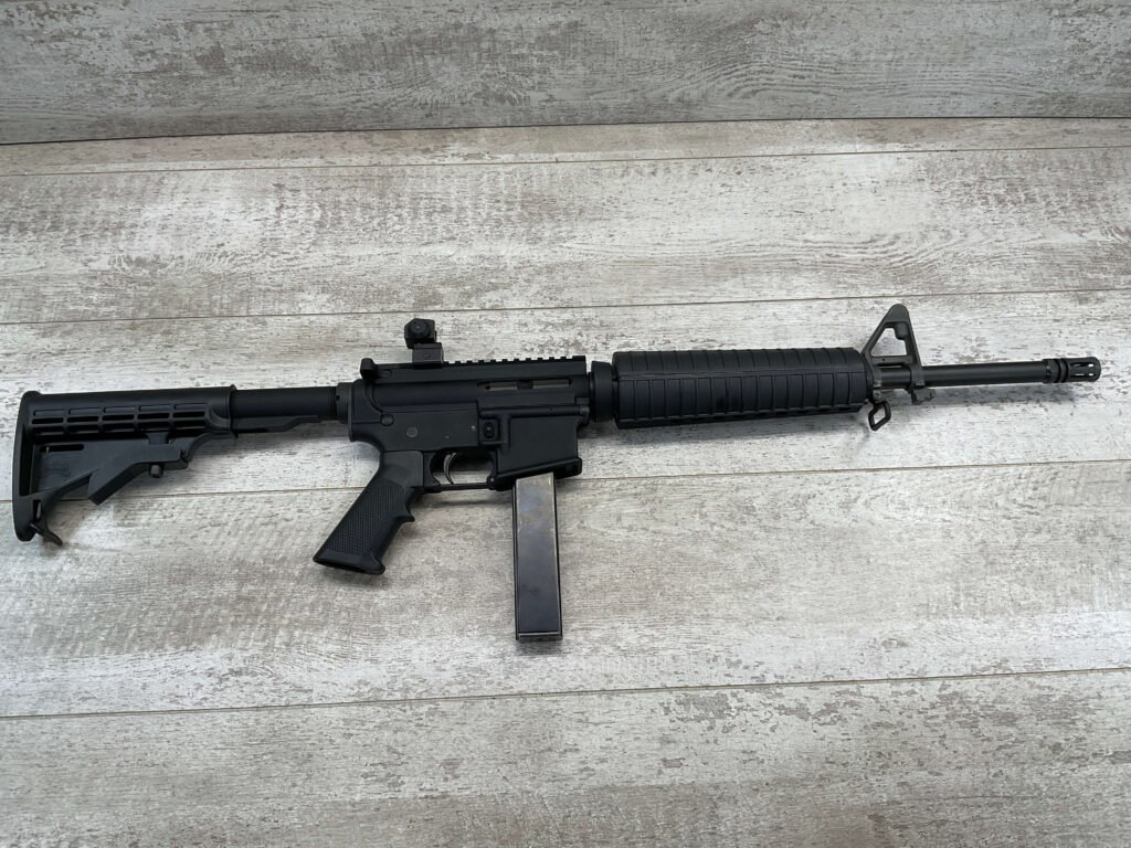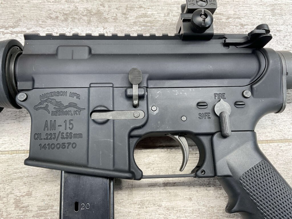 ANDERSON MFG AM-15 .223/5.56 LOWER IN 9MM SEMI AUTO RIFLE #14100570, A4 MID-LENGTH, 1-32 ROUNDS ASC 9MM MAGAZINE, 17″ BARREL, FLASH HIDDER, 8 1/2″ HANDGUARD, PALMETTO ADJ STOCK, BAYONET LUG, EXC BRIGHT BORE W/EXC RIFLING, GREAT SHOOTER!