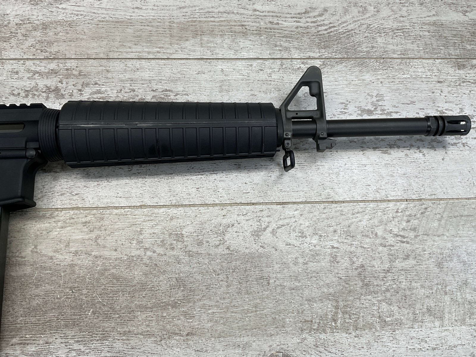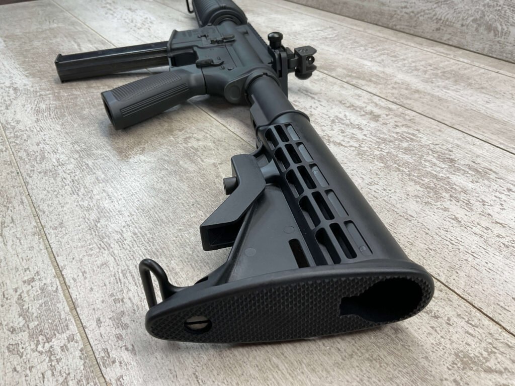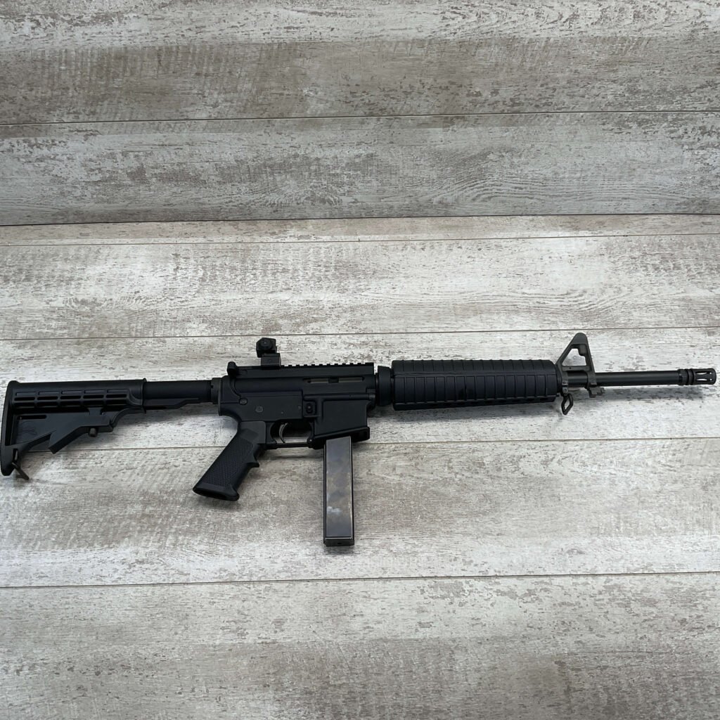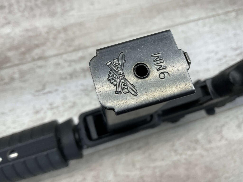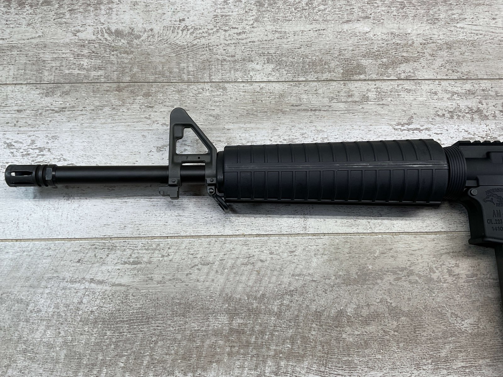 ANDERSON MFG AM-15 .223/5.56 LOWER IN 9MM SEMI AUTO RIFLE #14100570, A4 MID-LENGTH, 1-32 ROUNDS ASC 9MM MAGAZINE, 17″ BARREL, FLASH HIDDER, 8 1/2″ HANDGUARD, PALMETTO ADJ STOCK, BAYONET LUG, EXC BRIGHT BORE W/EXC RIFLING, GREAT SHOOTER!
