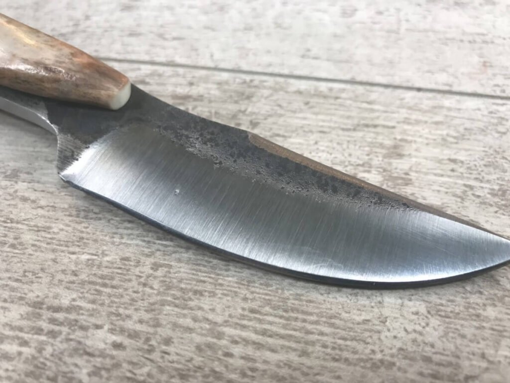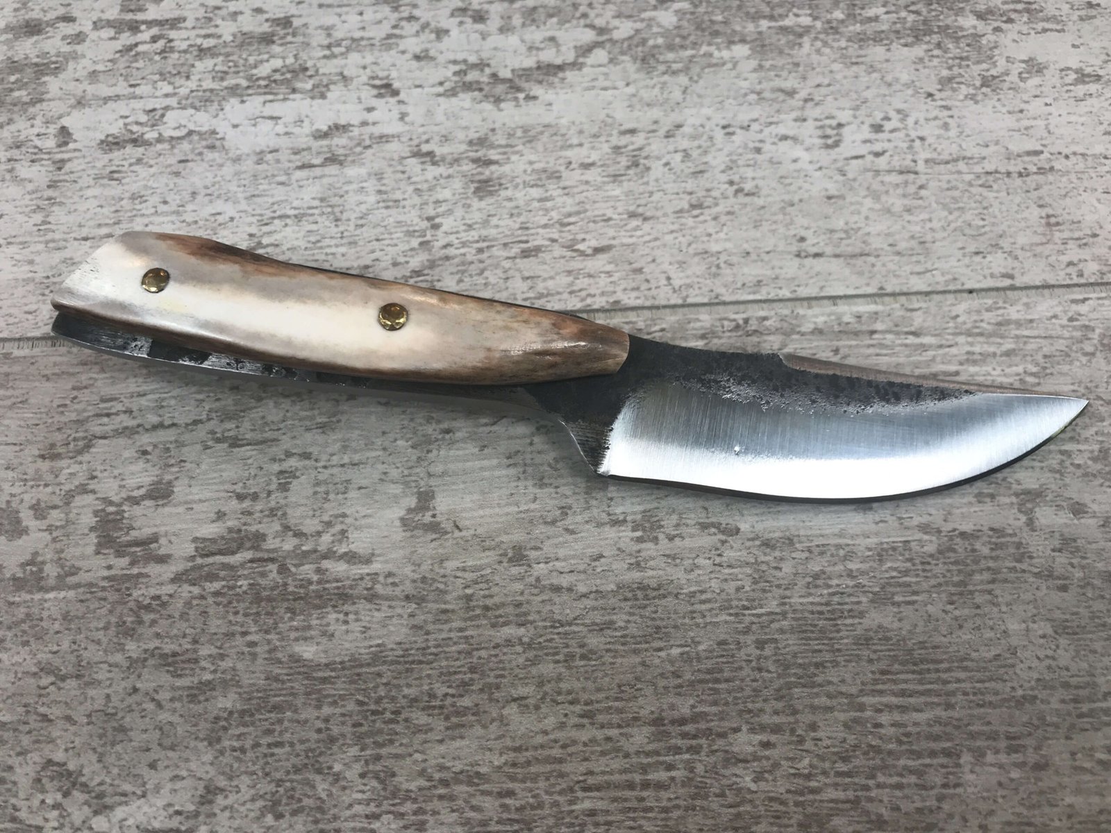 SKU#089 ANTIQUED SMALL SKINNER HAND FORGED 8670 STEEL BLADE (MADE TO RESEMBLE 1800’s BELT KNIFE), FORGING SCALE LEFT TO AGE BLADE, HANDLE MADE FROM WHITETAIL DEER TINES, HANDLE PINS SOLID BRASS ROD HAND PEENED TO DOMED RIVETS, HIGH GRADE LEATHER SHEATH WITH “TEXAS STAR” ON RIVETS, KNIFE BUILD INTENTIONALLY USING AS LITTLE POWER TOOLS AS POSSIBLE, MOST WORK COMPLETED WITH HAMMER, HAND FILES AND STONE TO KEEP CLOSE TO PERIOD ACCURATE, A WORK OF ART, MADE LOCALLY IN WISCONSIN!!