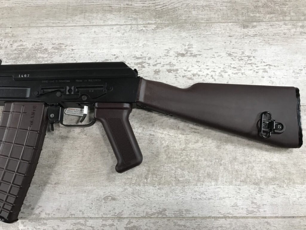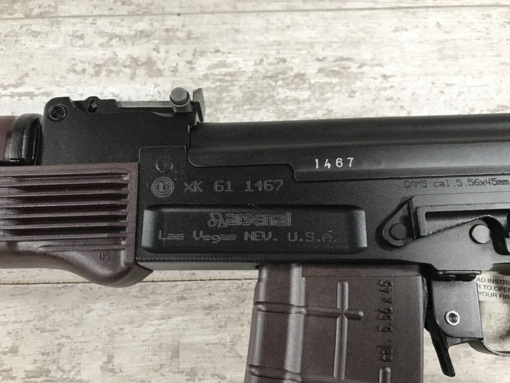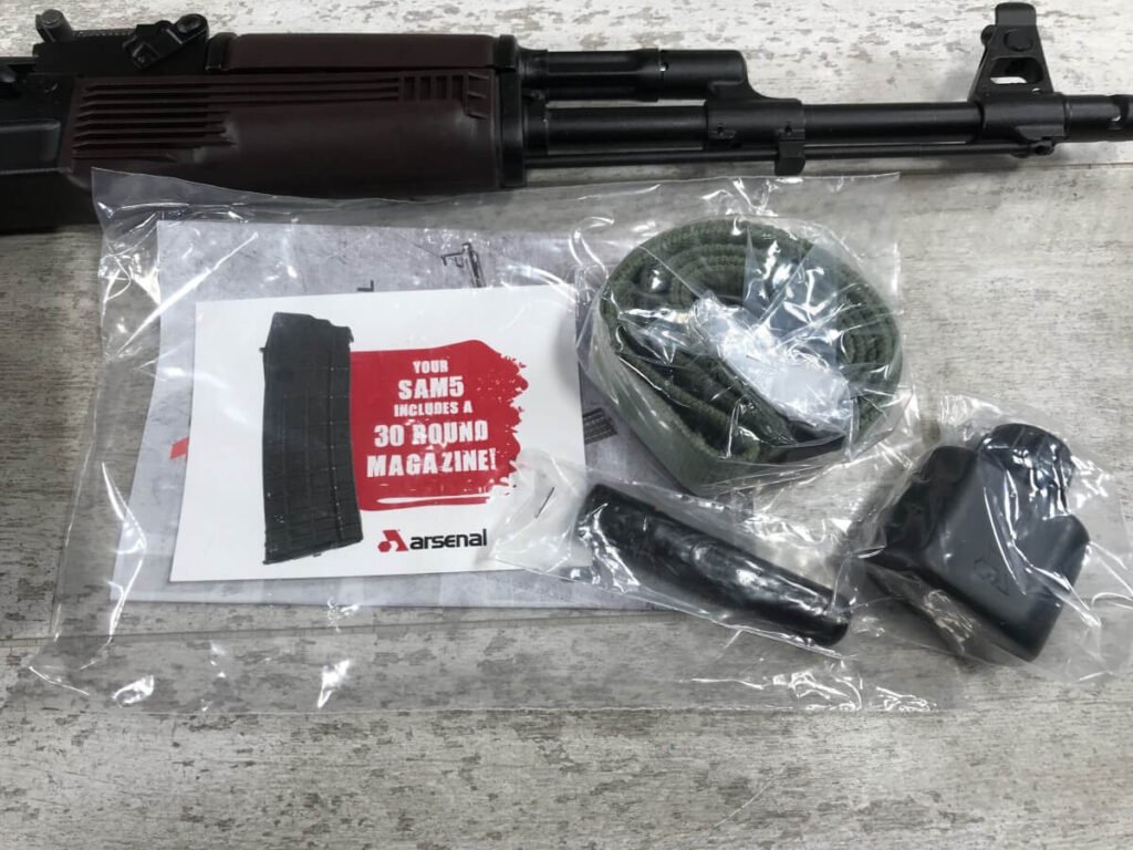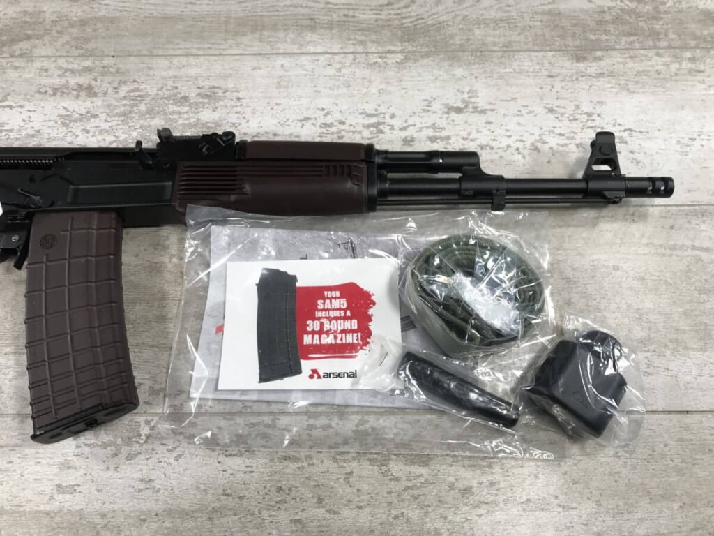 Arsenal SAM5 5.56x45mm (.223 REM) AK47 rifle, milled and forged receiver, 16.3″ chrome lined hammer forged barrel, 14x1mm left-hand muzzle threads, AK-351 muzzle brake, FIME Enhanced Fire Control Group, cleaning rod, bayonet lug, Plum polymer furniture, intermediate length buttstock, scope rail, comes with one Plum 30 round magazine, sling, oil bottle, and cleaning kit. Features 100% new-production parts and components. Bulgarian hot-die hammer forged receiver, bolt, and bolt carrier. Cold hammer-forged 16.3†barrel from Arsenal’s Bulgarian factory, built on Steyr manufacturing technology, hard-chrome plated bore and chamber with left-hand 14mm threads. Includes AK scope rail, Intermediate length US-made 10†trapdoor buttstock (total length of pull 13.4â€.) 922(r) compliant with US or imported magazines. Substantially extended service life over other types of assemblies. Installed on this rifle is the Enhanced Fire Control Group from Fime, the AK enthusiasts favorite. This 5.56×45 rifle combines authentic, high-quality features rarely seen in the American market. From its intermediate-length trapdoor buttstock to its removable muzzle device, every component of the SAM5 is engineered to provide decades of dependable and accurate service. The SAM5 rifle is extremely sought after and a very collectible firearm. Arsenal’s SAM5 receiver is milled from a hot-die hammer forged receiver blank by the Arsenal Co. of Bulgaria. Other milled-receiver AKs are machined from bar stock, but Arsenal’s hot-die hammer forging produces stronger and finer-grained steel. Internal voids and cooling deformations are eliminated by the 5-ton hammer forging process. The forged receiver blank requires over 5.5 hours of milling before assembly. This forging and milling process is complex and time-intensive, but Arsenal’s meticulous attention to detail delivers a receiver of unequalled strength, precision and durability.