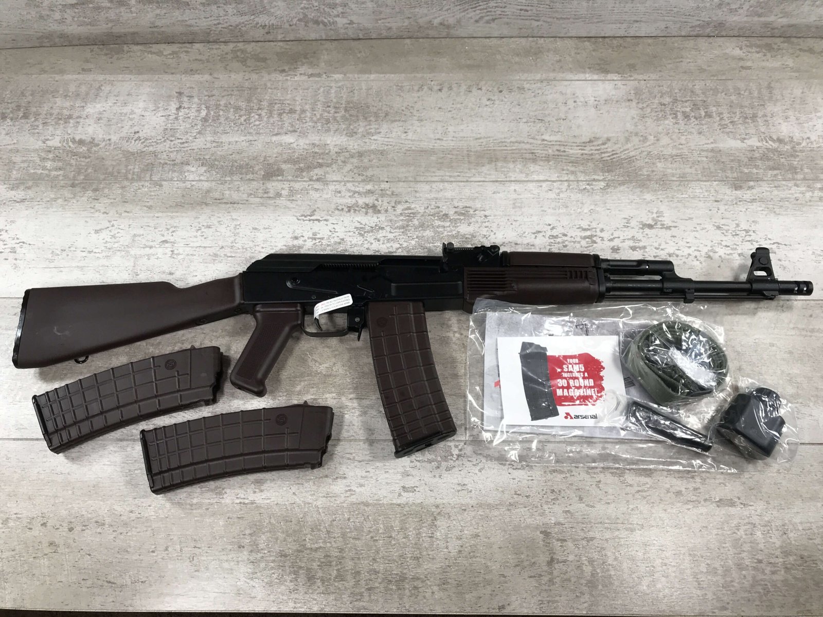 Arsenal SAM5 5.56x45mm (.223 REM) AK47 rifle, milled and forged receiver, 16.3″ chrome lined hammer forged barrel, 14x1mm left-hand muzzle threads, AK-351 muzzle brake, FIME Enhanced Fire Control Group, cleaning rod, bayonet lug, Plum polymer furniture, intermediate length buttstock, scope rail, comes with one Plum 30 round magazine, sling, oil bottle, and cleaning kit. Features 100% new-production parts and components. Bulgarian hot-die hammer forged receiver, bolt, and bolt carrier. Cold hammer-forged 16.3†barrel from Arsenal’s Bulgarian factory, built on Steyr manufacturing technology, hard-chrome plated bore and chamber with left-hand 14mm threads. Includes AK scope rail, Intermediate length US-made 10†trapdoor buttstock (total length of pull 13.4â€.) 922(r) compliant with US or imported magazines. Substantially extended service life over other types of assemblies. Installed on this rifle is the Enhanced Fire Control Group from Fime, the AK enthusiasts favorite. This 5.56×45 rifle combines authentic, high-quality features rarely seen in the American market. From its intermediate-length trapdoor buttstock to its removable muzzle device, every component of the SAM5 is engineered to provide decades of dependable and accurate service. The SAM5 rifle is extremely sought after and a very collectible firearm. Arsenal’s SAM5 receiver is milled from a hot-die hammer forged receiver blank by the Arsenal Co. of Bulgaria. Other milled-receiver AKs are machined from bar stock, but Arsenal’s hot-die hammer forging produces stronger and finer-grained steel. Internal voids and cooling deformations are eliminated by the 5-ton hammer forging process. The forged receiver blank requires over 5.5 hours of milling before assembly. This forging and milling process is complex and time-intensive, but Arsenal’s meticulous attention to detail delivers a receiver of unequalled strength, precision and durability.