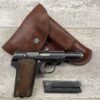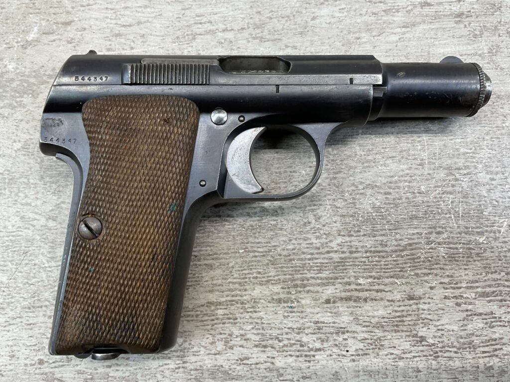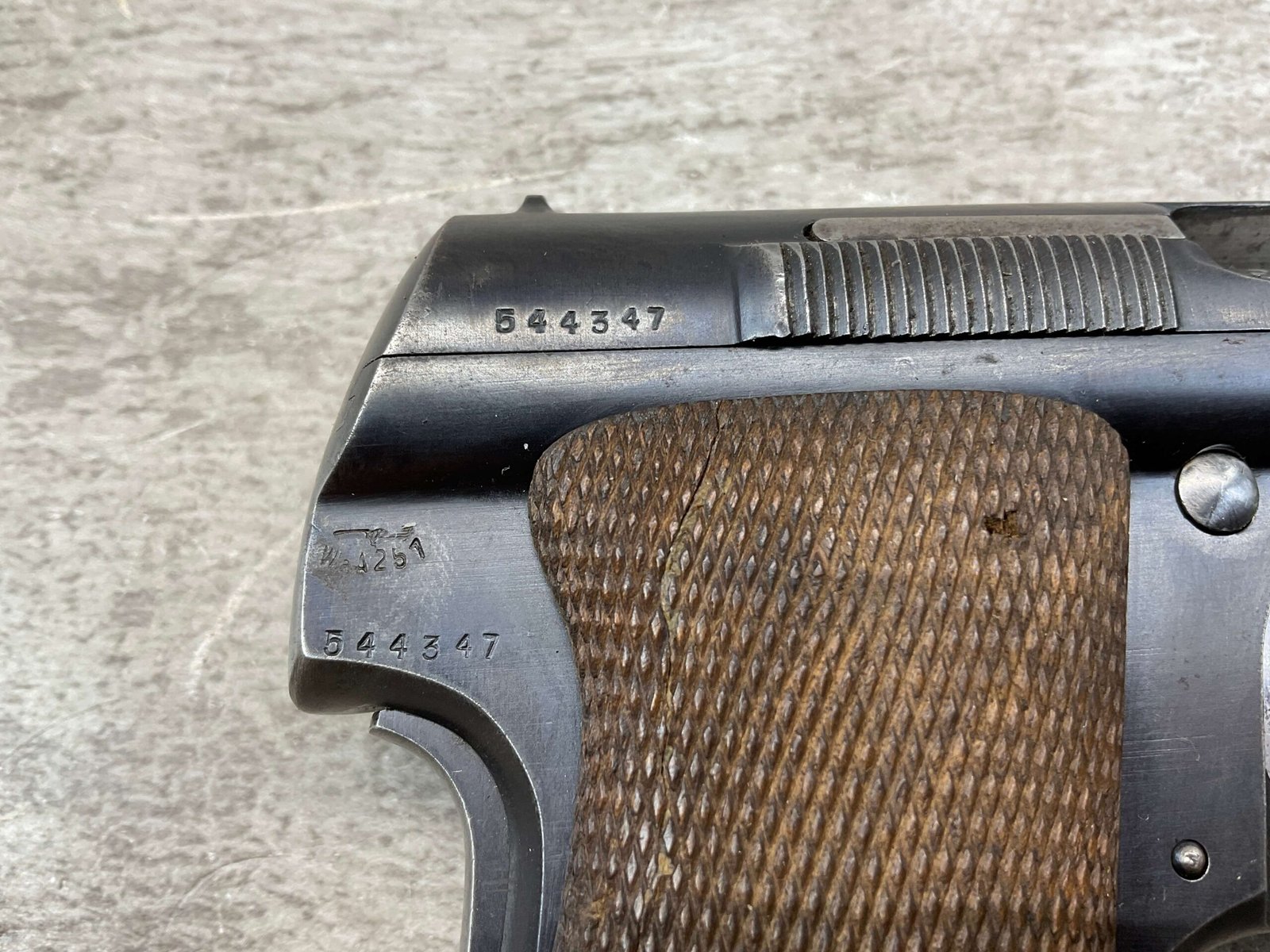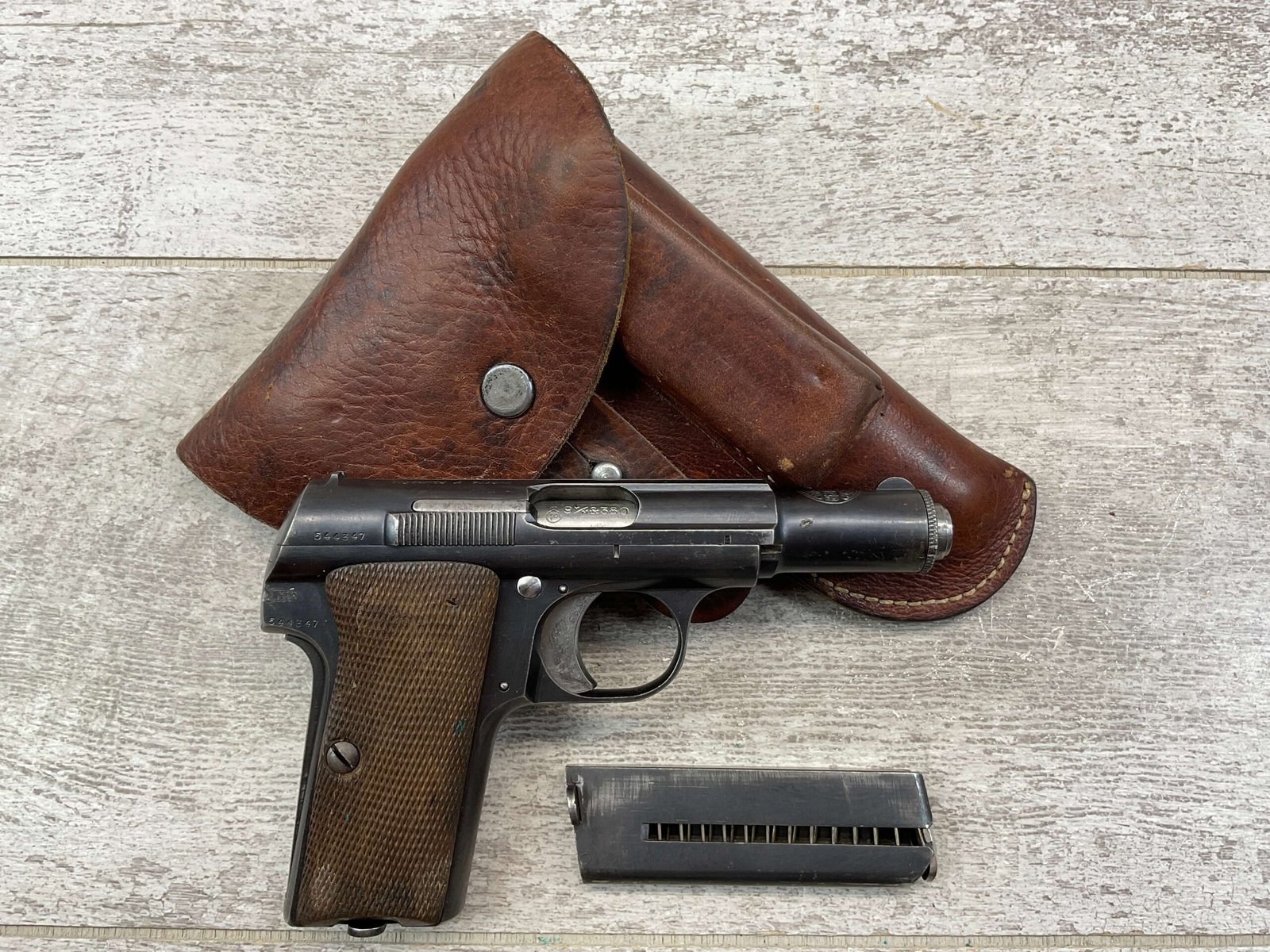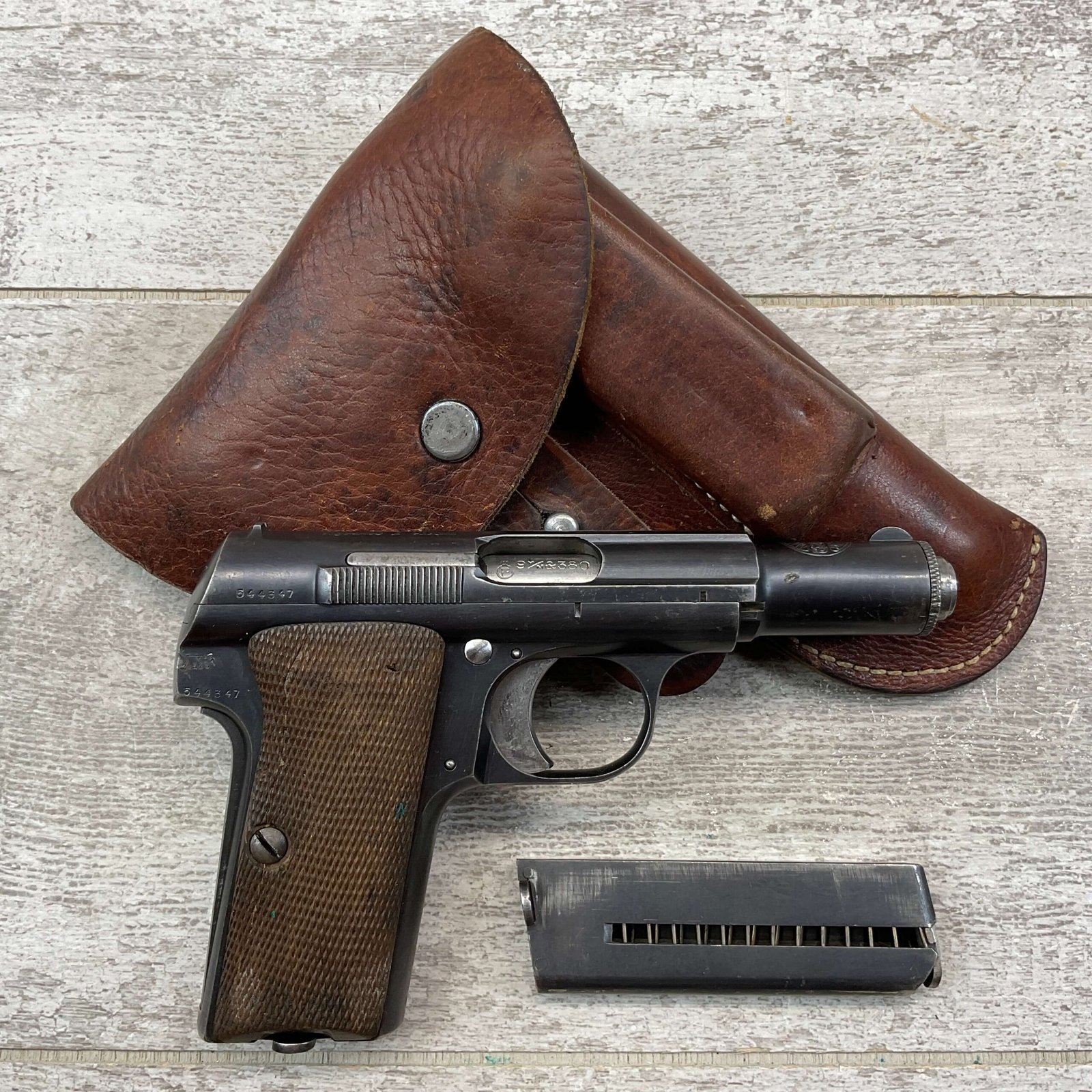 ASTRA 300 7.65MM WWII NAZI MARKED PISTOL RIG #544347, FRAME IS MARKED WaA251, TOP OF SLIDE MARKED “UNCETA Y COMPANIA S.A. / GUERNICA ESPANA”, SPANISH PROOFS ON LEFT REAR OF FRAME, VERY GOOD CHECKERED WOOD GRIPS W/MORE WEAR ON RIGHT GRIP, BRIGHT BORE W/LIGHT FROST THROUGHOUT & EXC RIFLING, BROWN LEATHER HOLSTER, ALL MATCHING, TWO ORIGINAL ASTRA LOGO MAGAZINES, 95+%