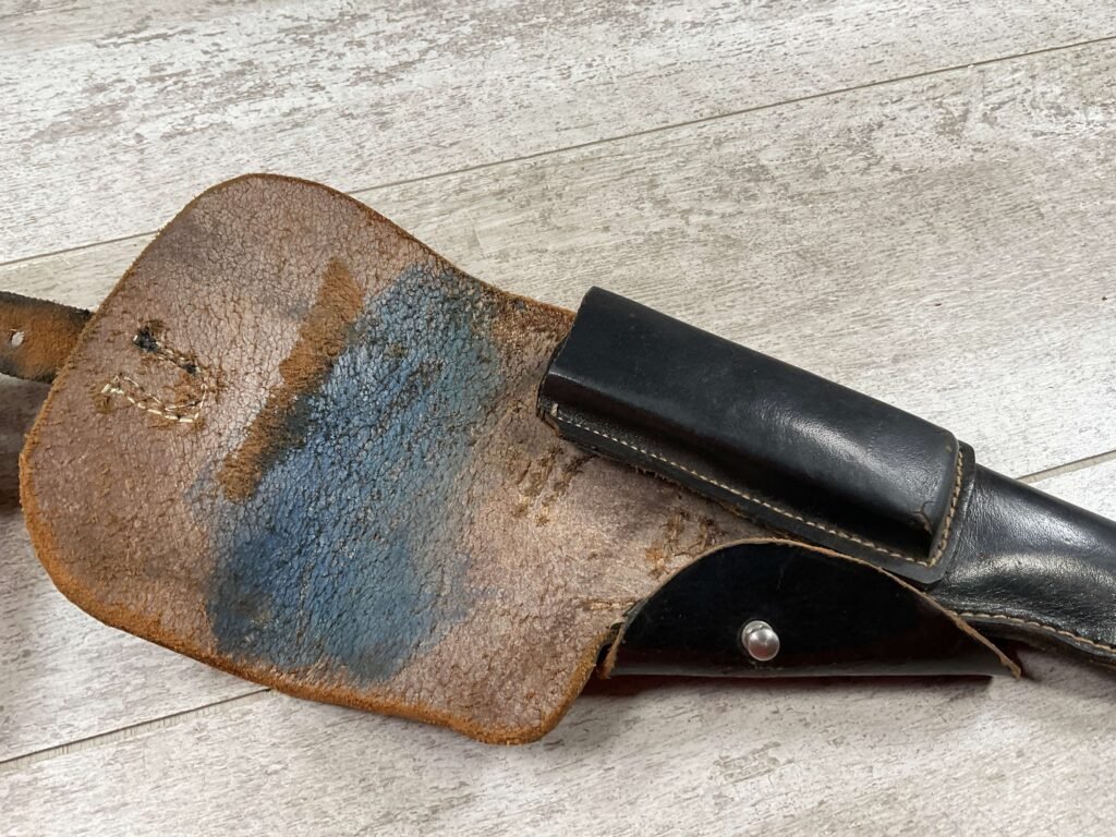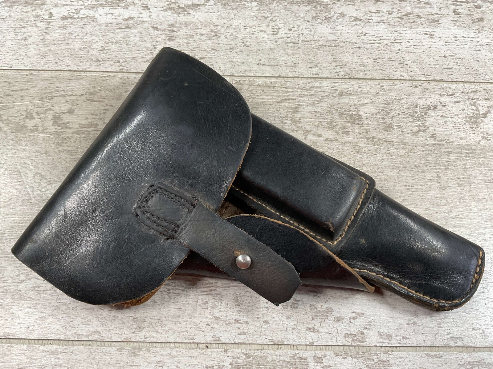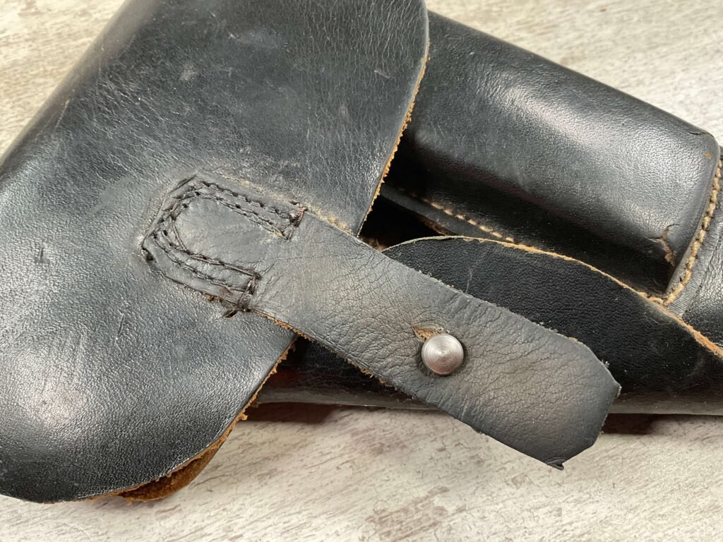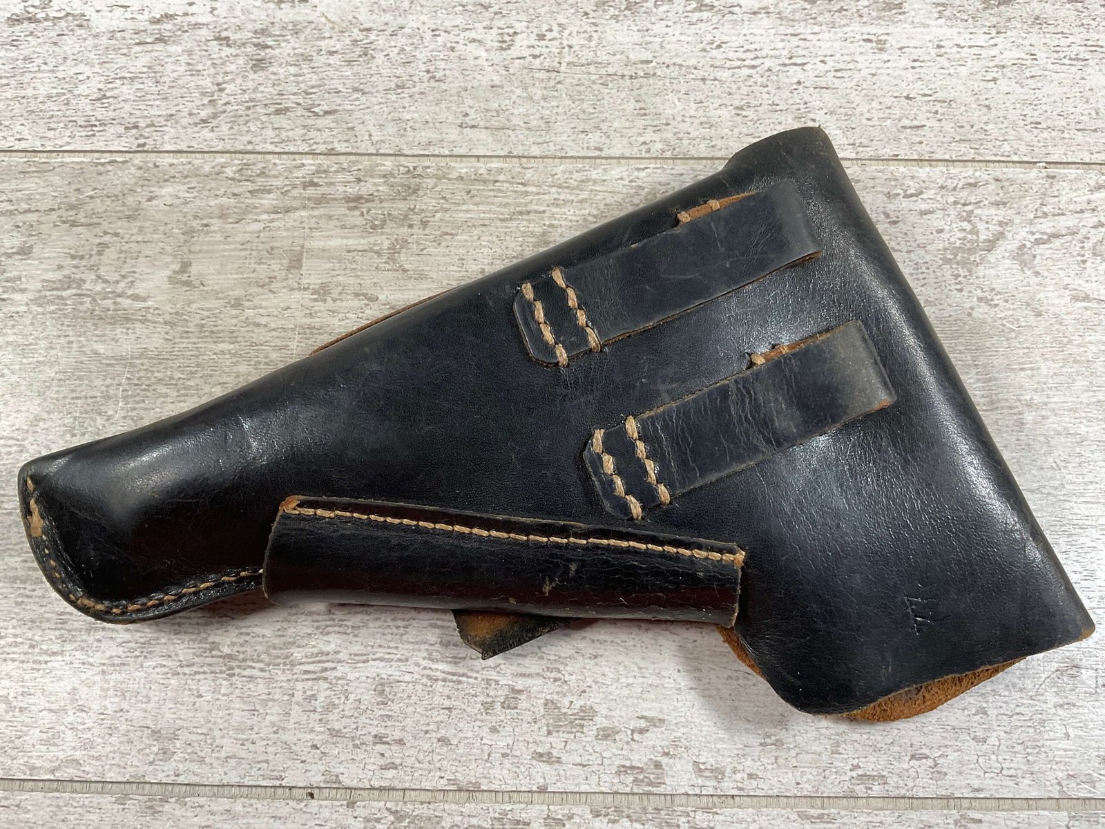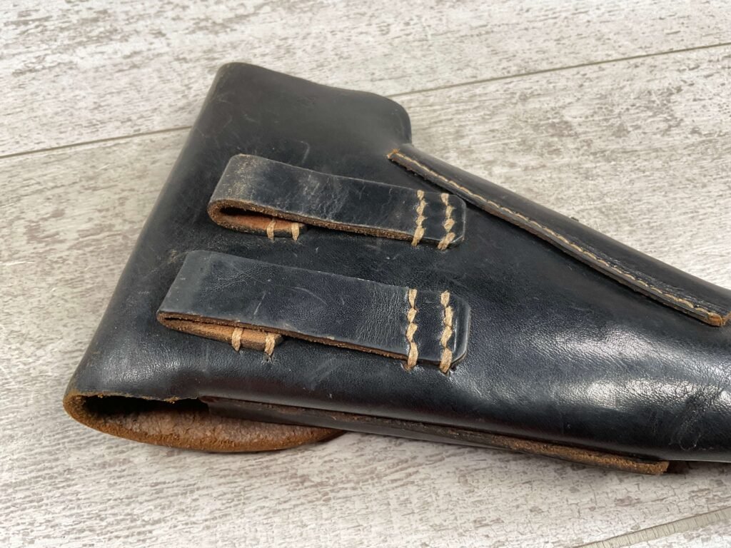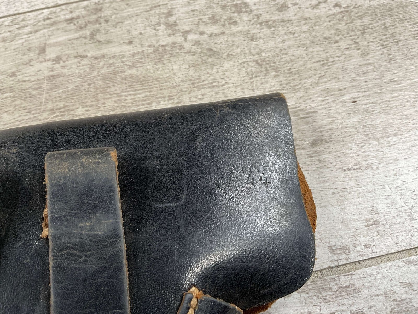 ASTRA 600 BLACK HOLSTER, “akk/44” STAMPED ON BACK NEXT TO THE BELT LOOPS, RELEASE STRAP HAS BEEN REPLACED, EXC STITCHING W/MINOR WEAR, EXC OVERALL CONDITION