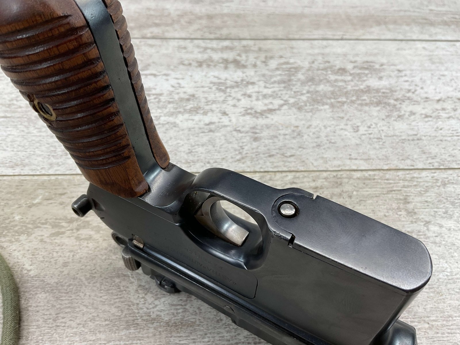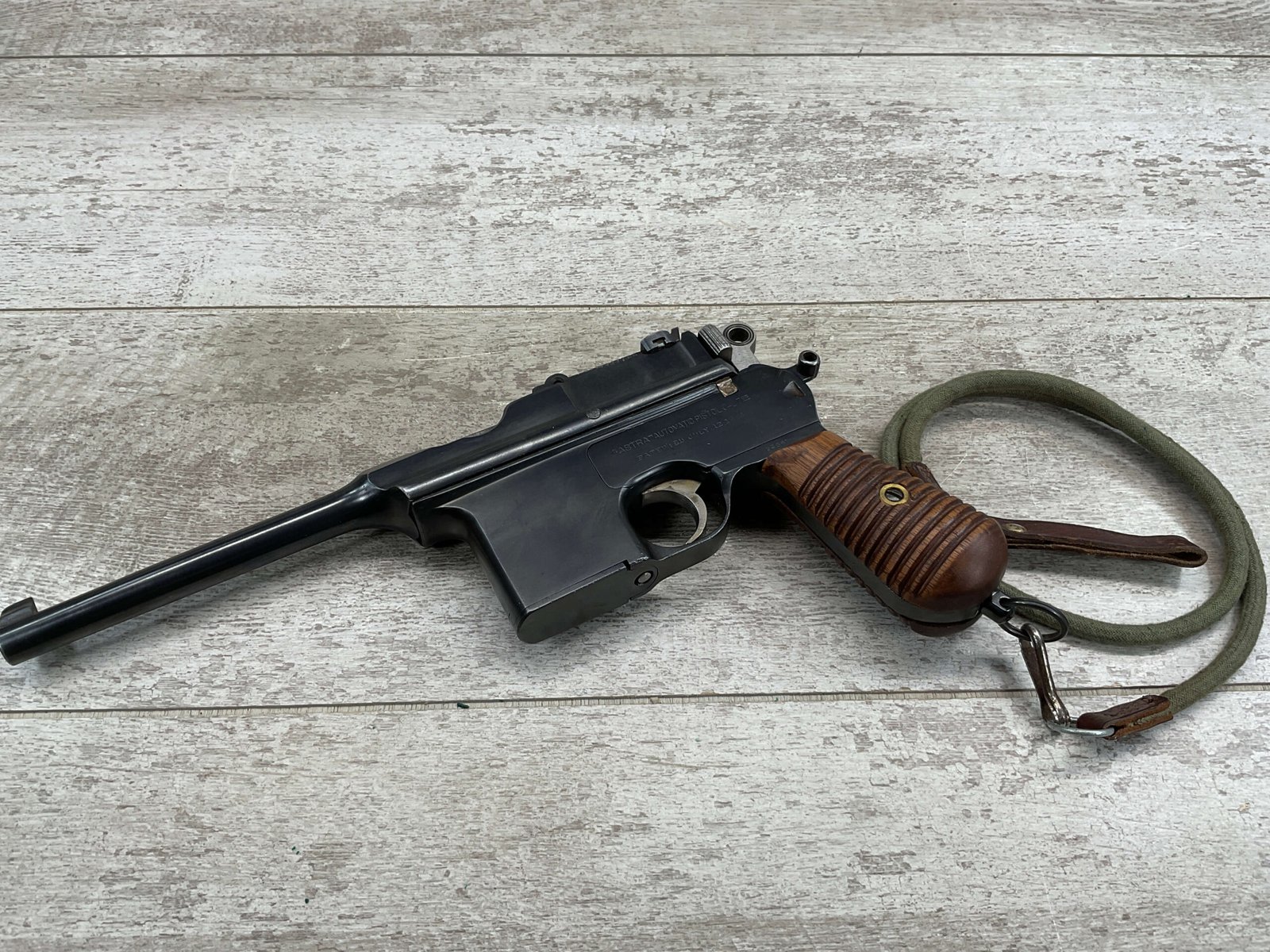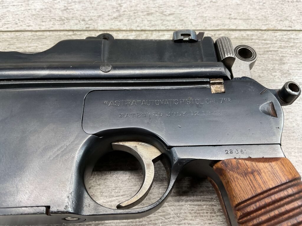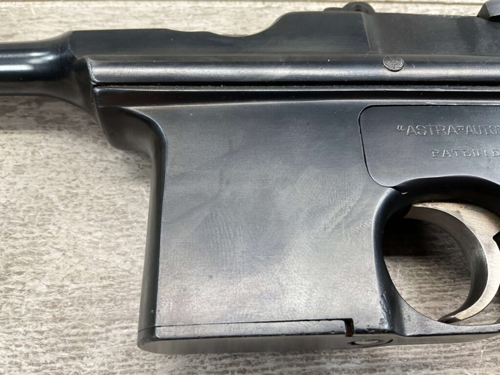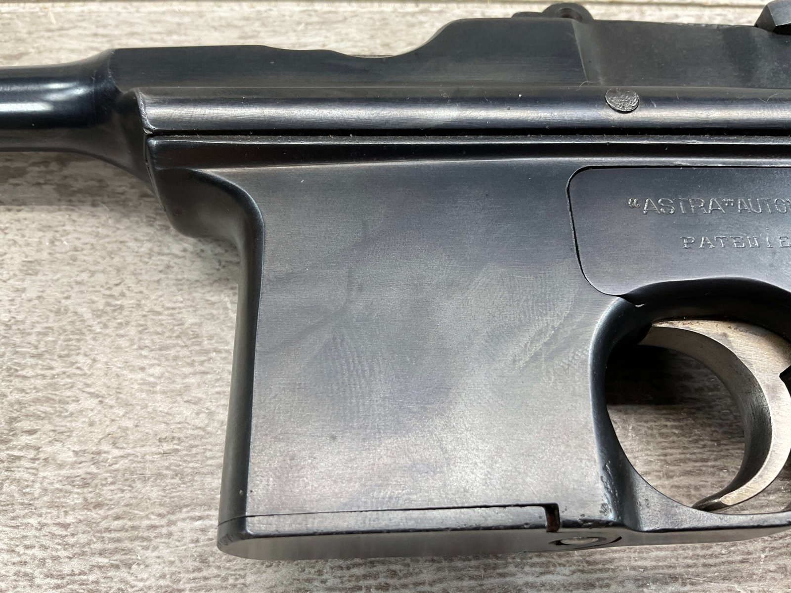 ASTRA 900 FLATSIDE BROOMHANDLE 7.63 PISTOL W/LEATHER HOLSTER #23667, 7.63MM, NON MATCHING, 98% BLUE, EXC BORE & RIFLING, EXC REPLACEMENT GRIPS, 5.5″ BBL, “ASTRA AUTOMATIC PISTOL CAL 7.63” LEFT SIDE PANEL OF FRAME, STANDARD PROOFS, LANYARD RING & LANYARD, LIGHT IMPORT BETWEEN GRIP & TRIGGER GUARD, “US” EMBOSSED BOWN LEATHER HOLSTER IN EXC CONDITION, 98%+ OVERALL
