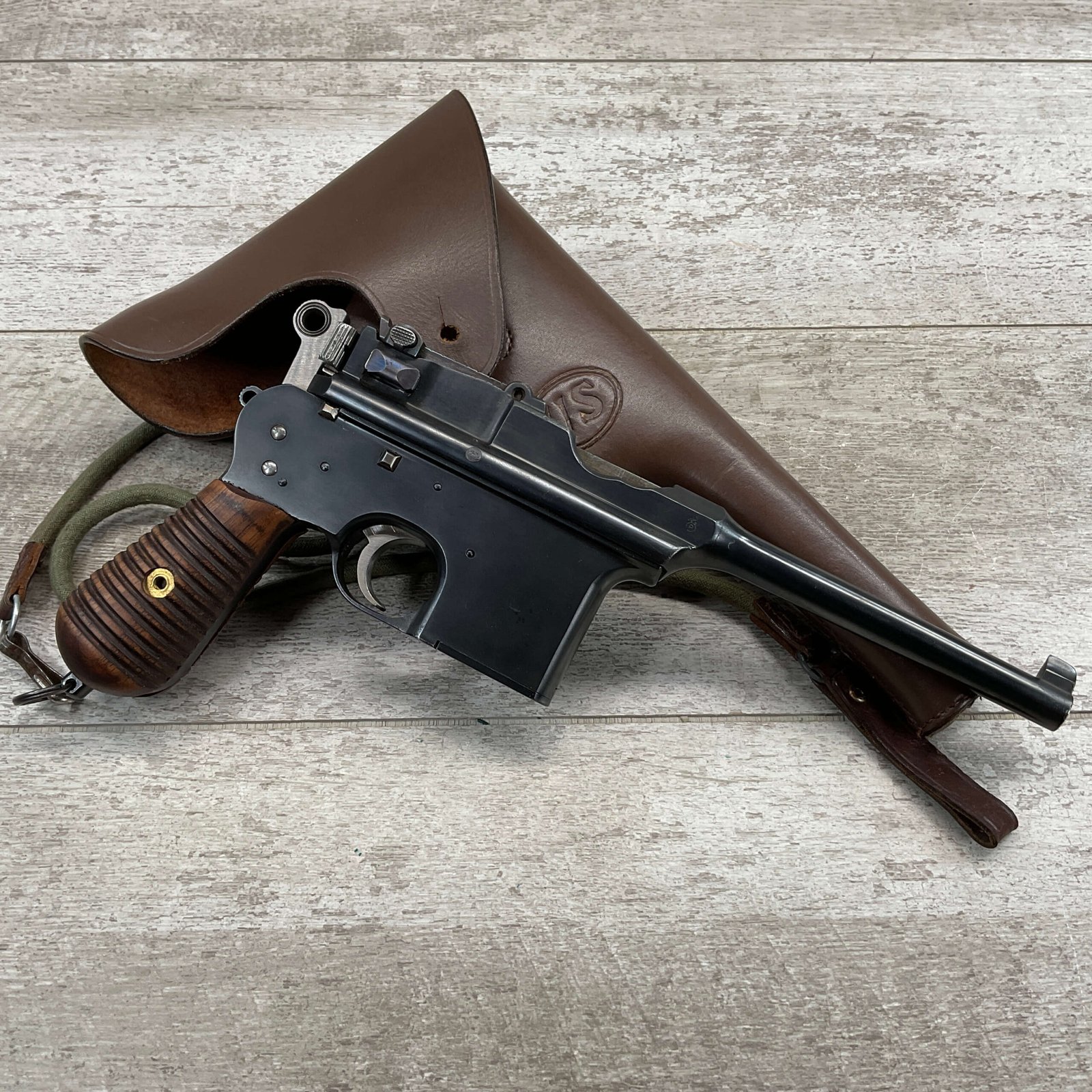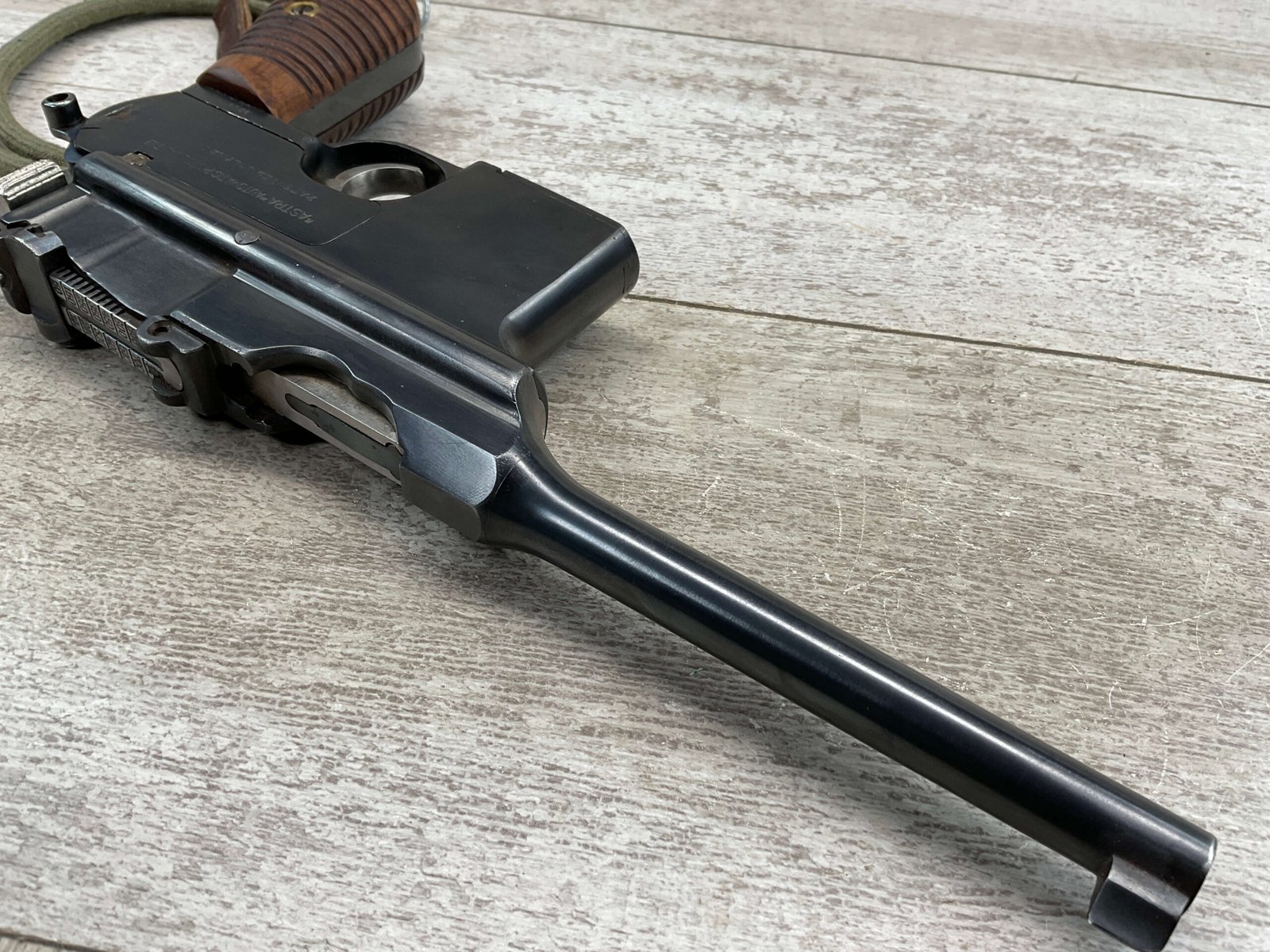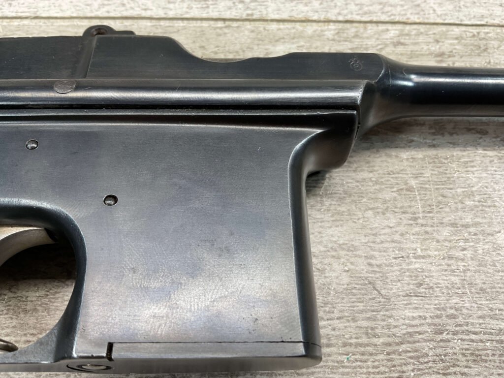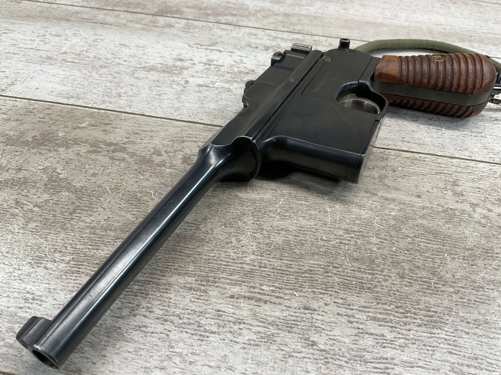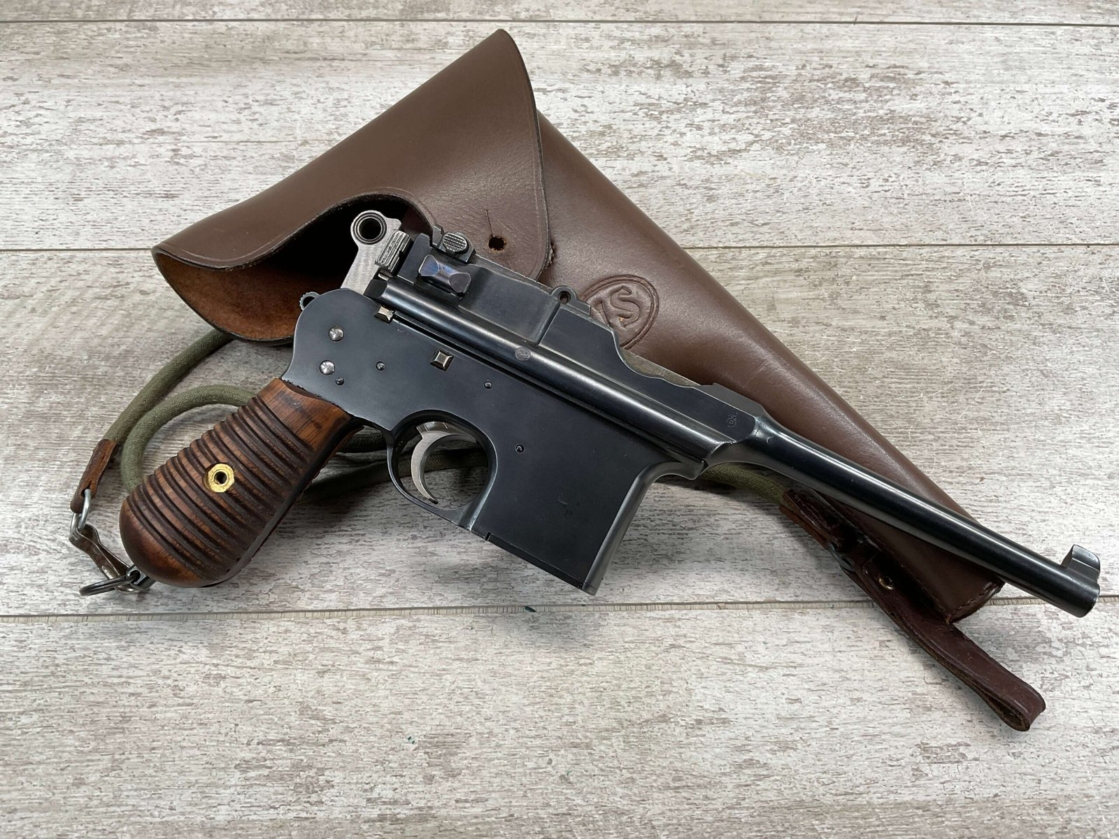 ASTRA 900 FLATSIDE BROOMHANDLE 7.63 PISTOL W/LEATHER HOLSTER #23667, 7.63MM, NON MATCHING, 98% BLUE, EXC BORE & RIFLING, EXC REPLACEMENT GRIPS, 5.5″ BBL, “ASTRA AUTOMATIC PISTOL CAL 7.63” LEFT SIDE PANEL OF FRAME, STANDARD PROOFS, LANYARD RING & LANYARD, LIGHT IMPORT BETWEEN GRIP & TRIGGER GUARD, “US” EMBOSSED BOWN LEATHER HOLSTER IN EXC CONDITION, 98%+ OVERALL