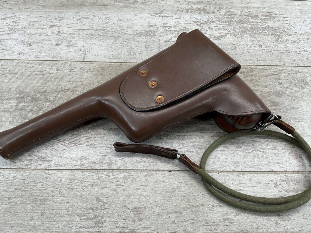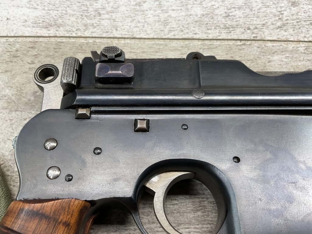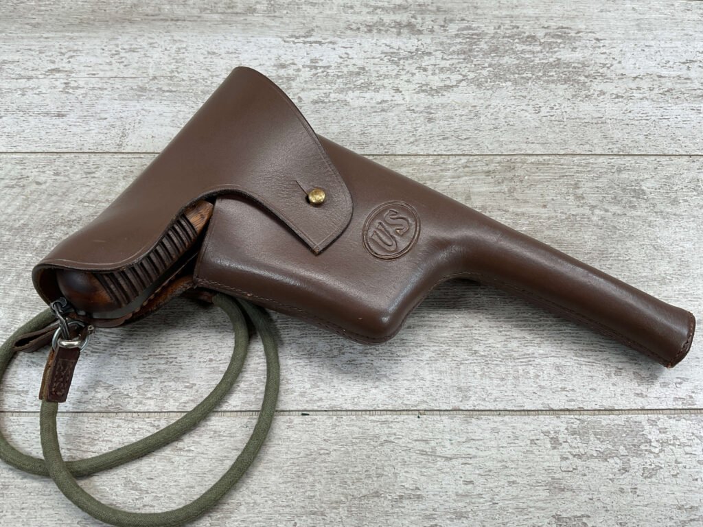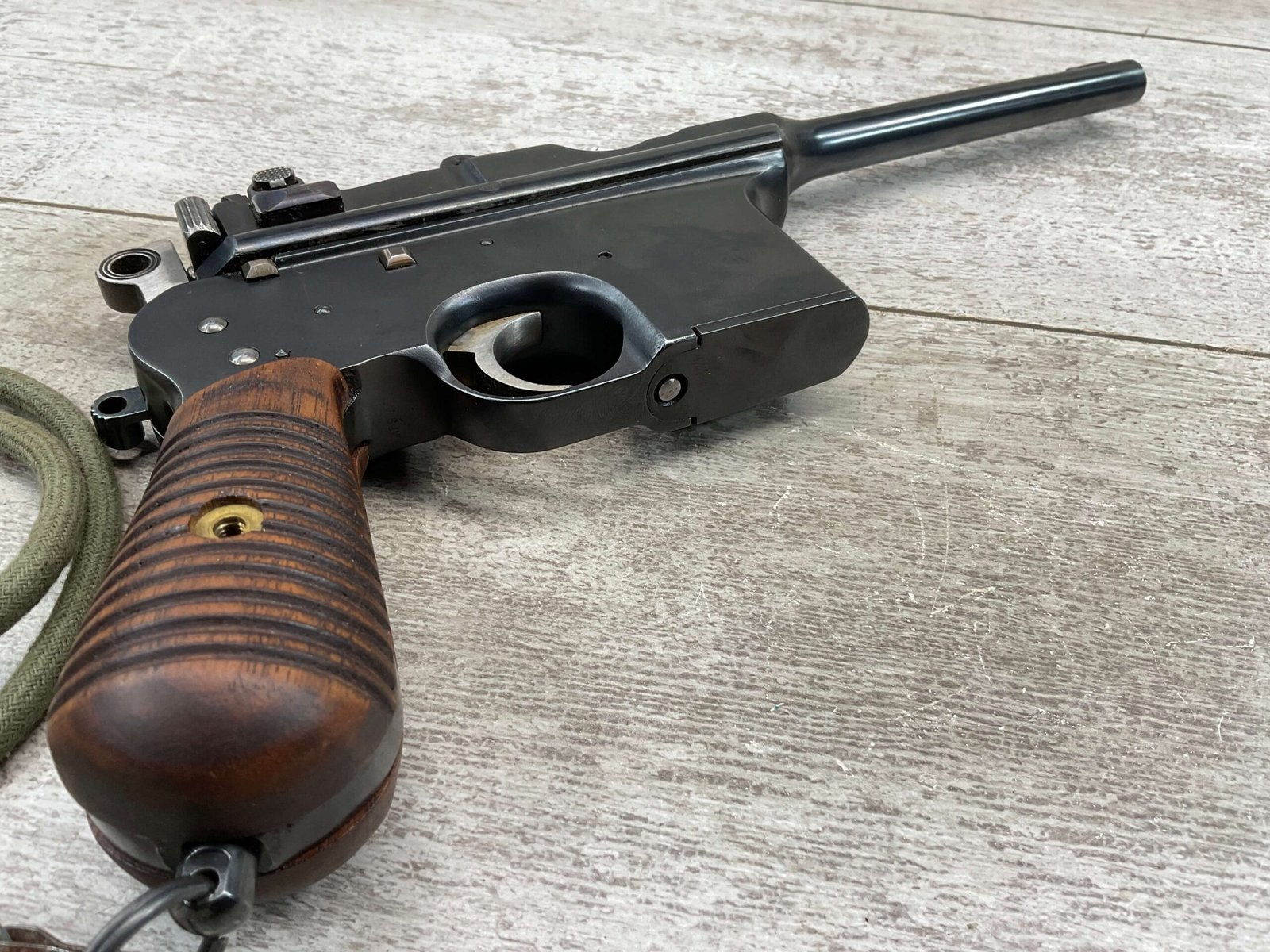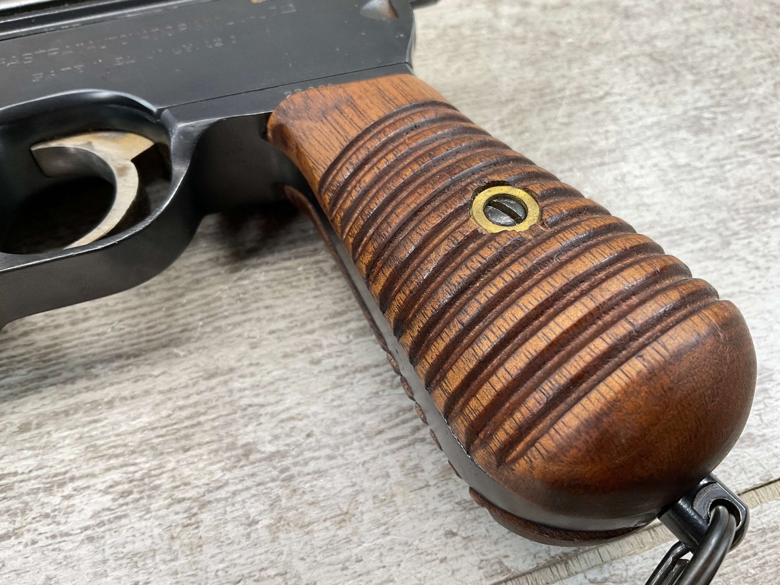 ASTRA 900 FLATSIDE BROOMHANDLE 7.63 PISTOL W/LEATHER HOLSTER #23667, 7.63MM, NON MATCHING, 98% BLUE, EXC BORE & RIFLING, EXC REPLACEMENT GRIPS, 5.5″ BBL, “ASTRA AUTOMATIC PISTOL CAL 7.63” LEFT SIDE PANEL OF FRAME, STANDARD PROOFS, LANYARD RING & LANYARD, LIGHT IMPORT BETWEEN GRIP & TRIGGER GUARD, “US” EMBOSSED BOWN LEATHER HOLSTER IN EXC CONDITION, 98%+ OVERALL
