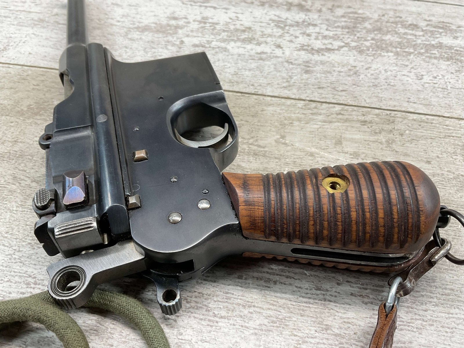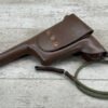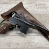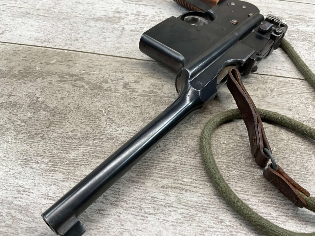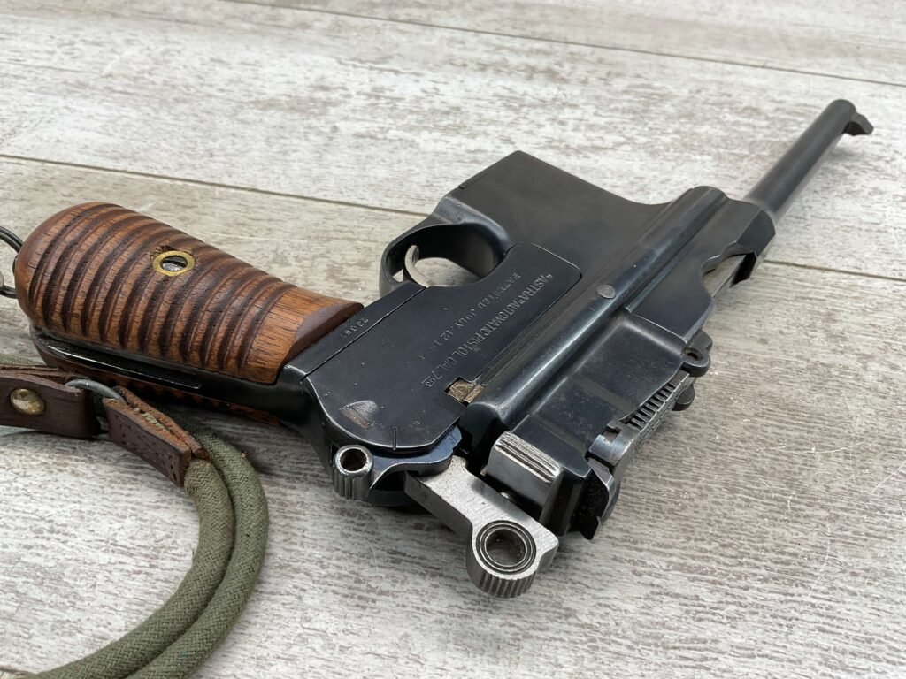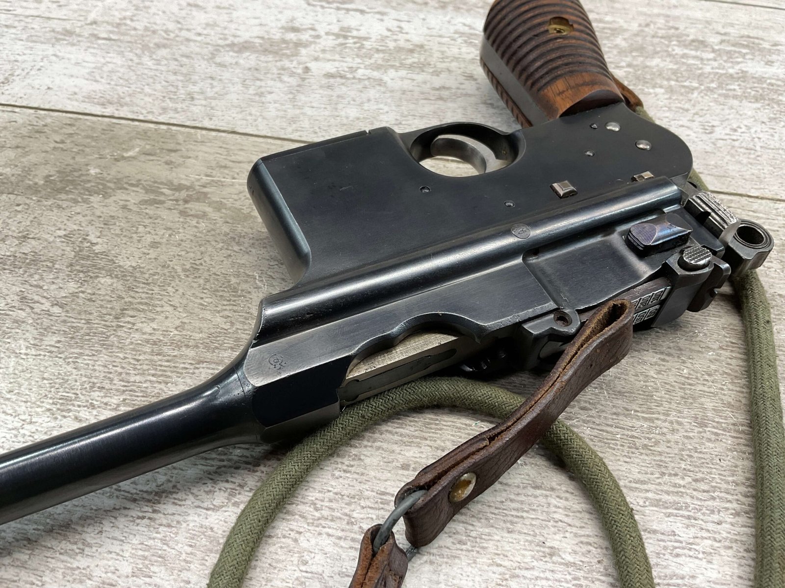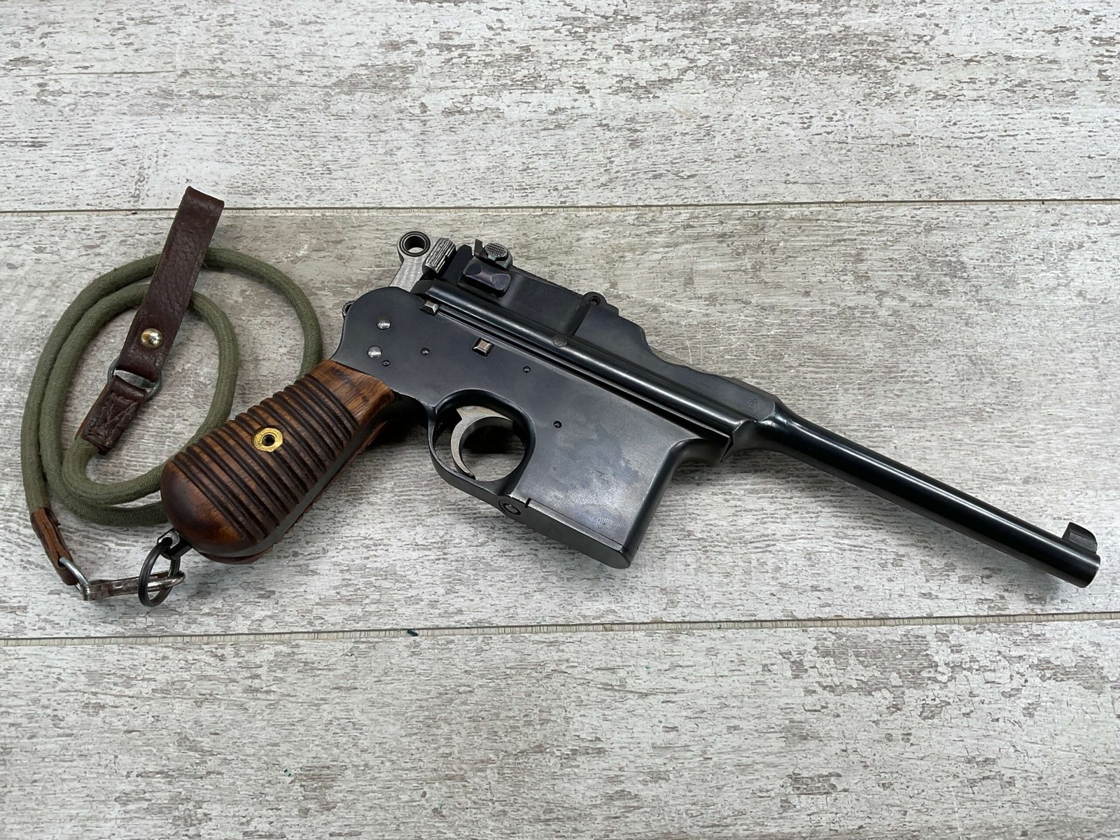 ASTRA 900 FLATSIDE BROOMHANDLE 7.63 PISTOL W/LEATHER HOLSTER #23667, 7.63MM, NON MATCHING, 98% BLUE, EXC BORE & RIFLING, EXC REPLACEMENT GRIPS, 5.5″ BBL, “ASTRA AUTOMATIC PISTOL CAL 7.63” LEFT SIDE PANEL OF FRAME, STANDARD PROOFS, LANYARD RING & LANYARD, LIGHT IMPORT BETWEEN GRIP & TRIGGER GUARD, “US” EMBOSSED BOWN LEATHER HOLSTER IN EXC CONDITION, 98%+ OVERALL