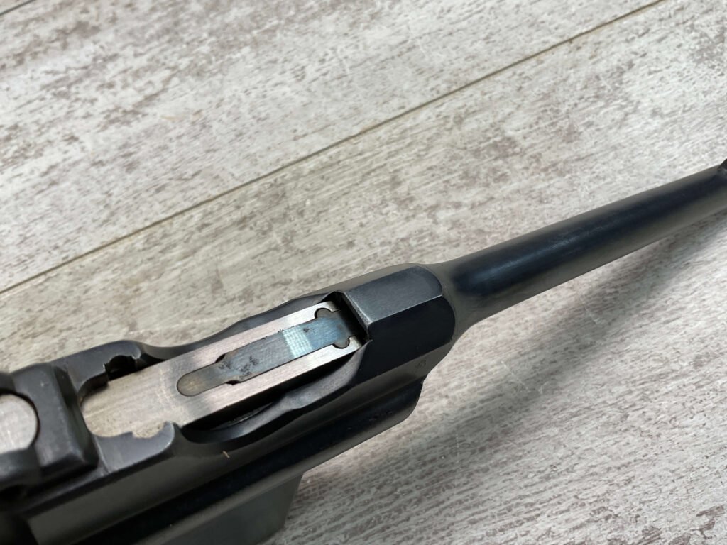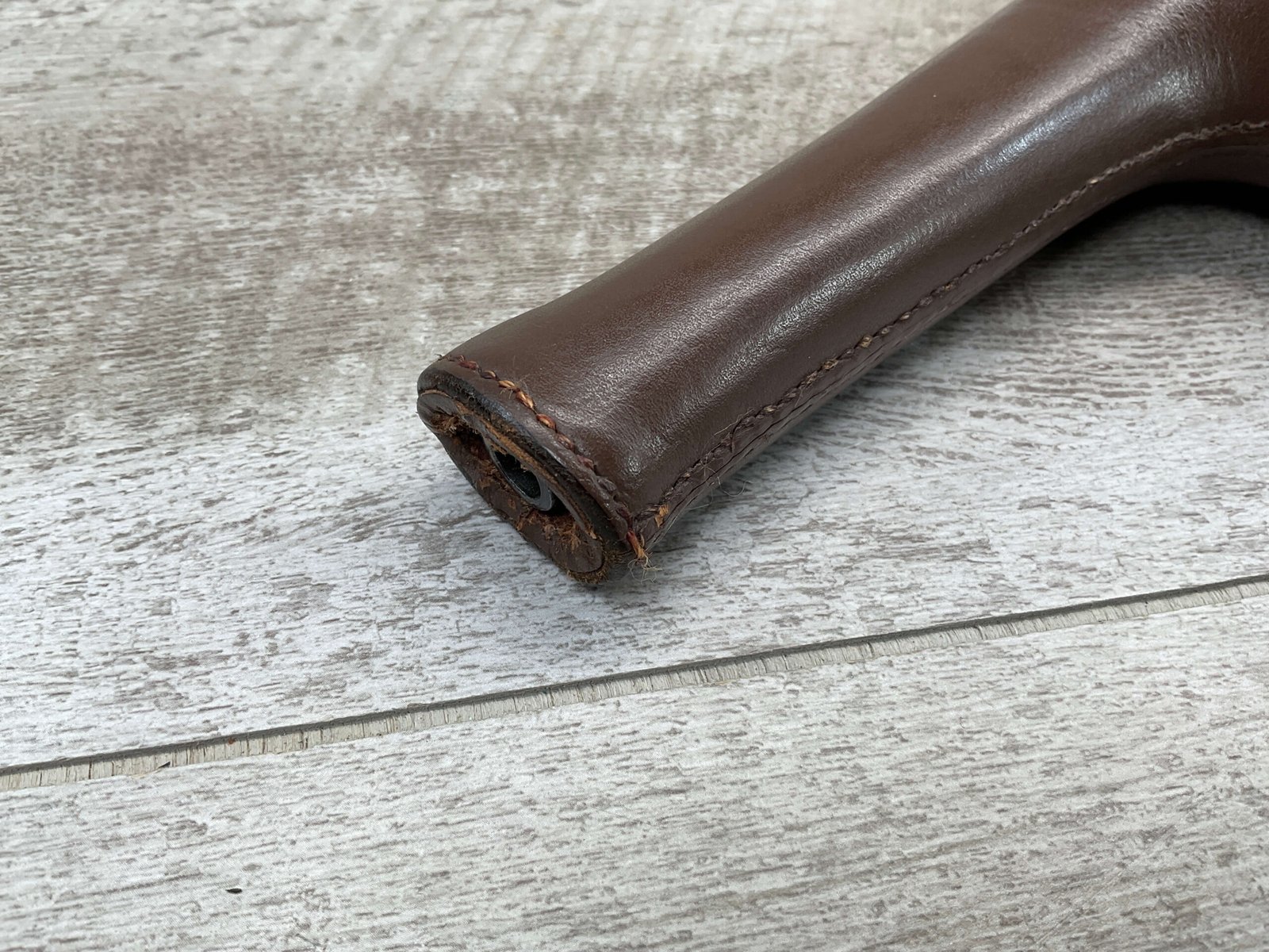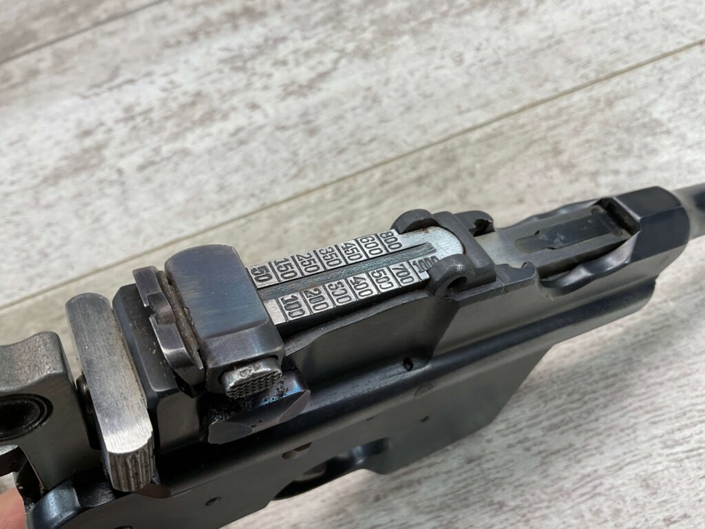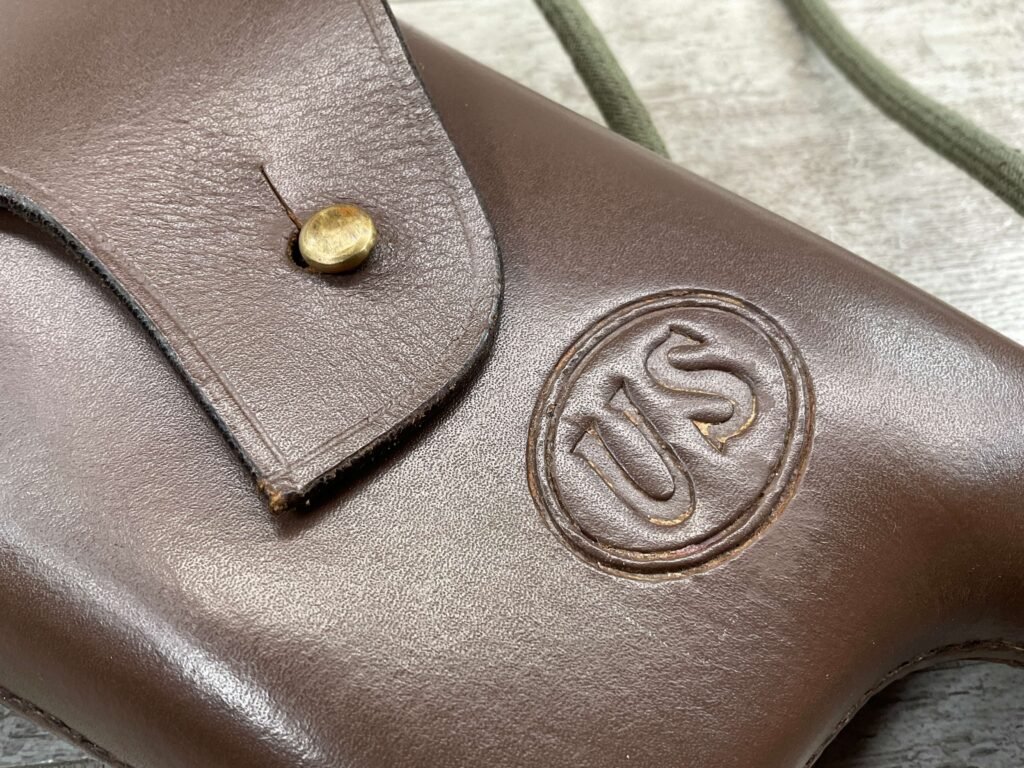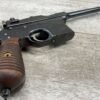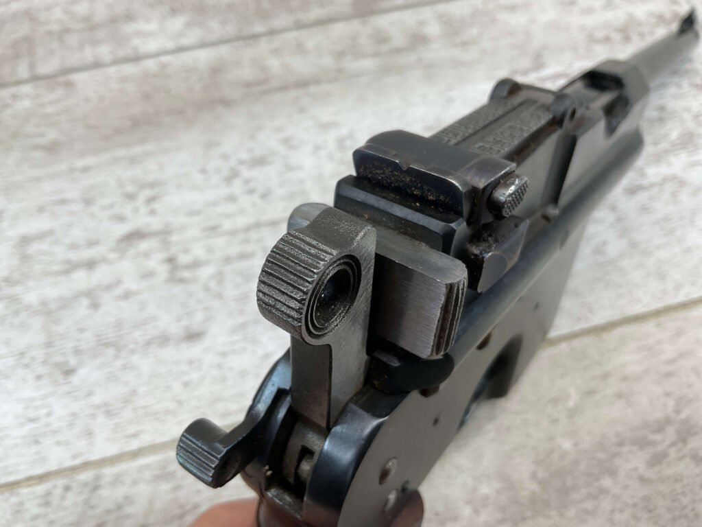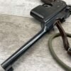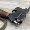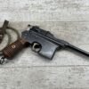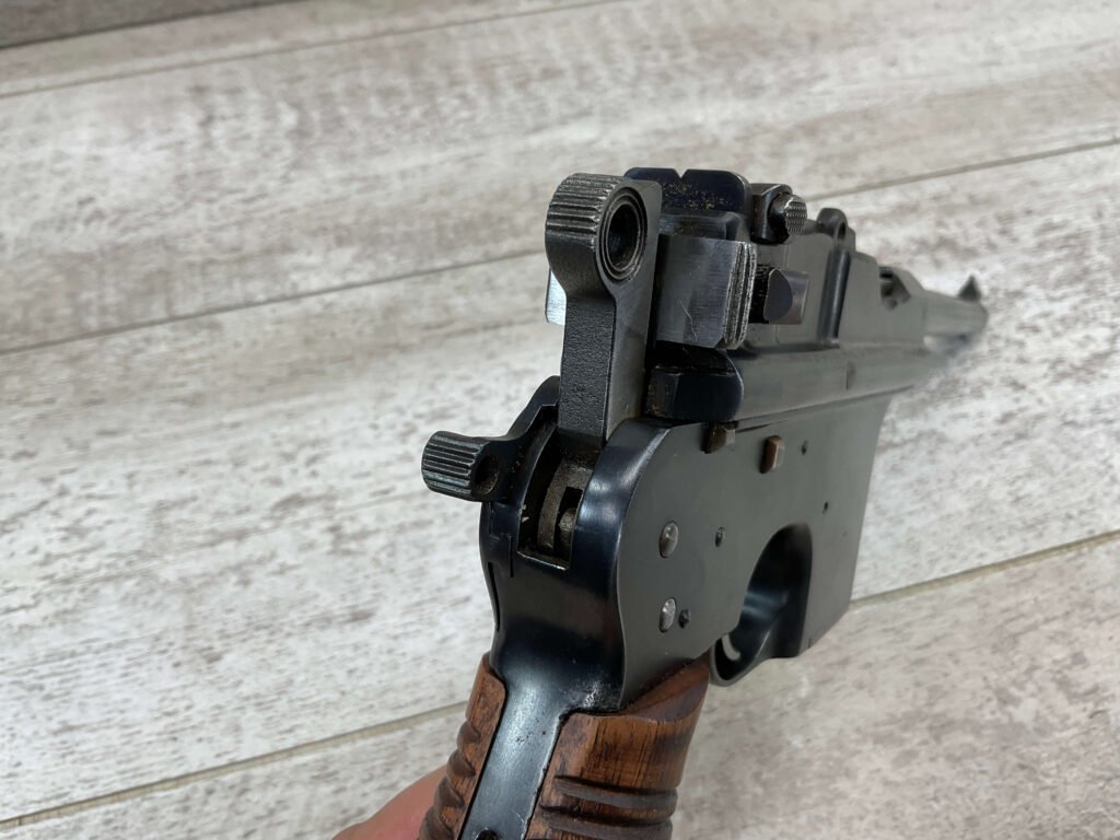 ASTRA 900 FLATSIDE BROOMHANDLE 7.63 PISTOL W/LEATHER HOLSTER #23667, 7.63MM, NON MATCHING, 98% BLUE, EXC BORE & RIFLING, EXC REPLACEMENT GRIPS, 5.5″ BBL, “ASTRA AUTOMATIC PISTOL CAL 7.63” LEFT SIDE PANEL OF FRAME, STANDARD PROOFS, LANYARD RING & LANYARD, LIGHT IMPORT BETWEEN GRIP & TRIGGER GUARD, “US” EMBOSSED BOWN LEATHER HOLSTER IN EXC CONDITION, 98%+ OVERALL