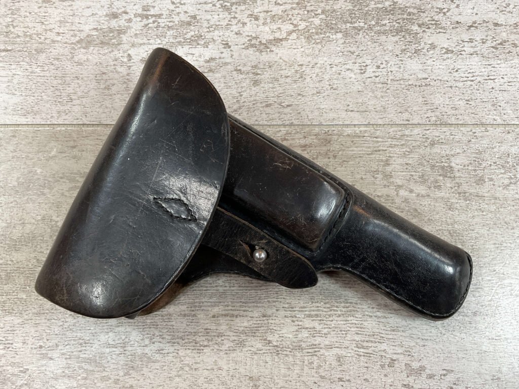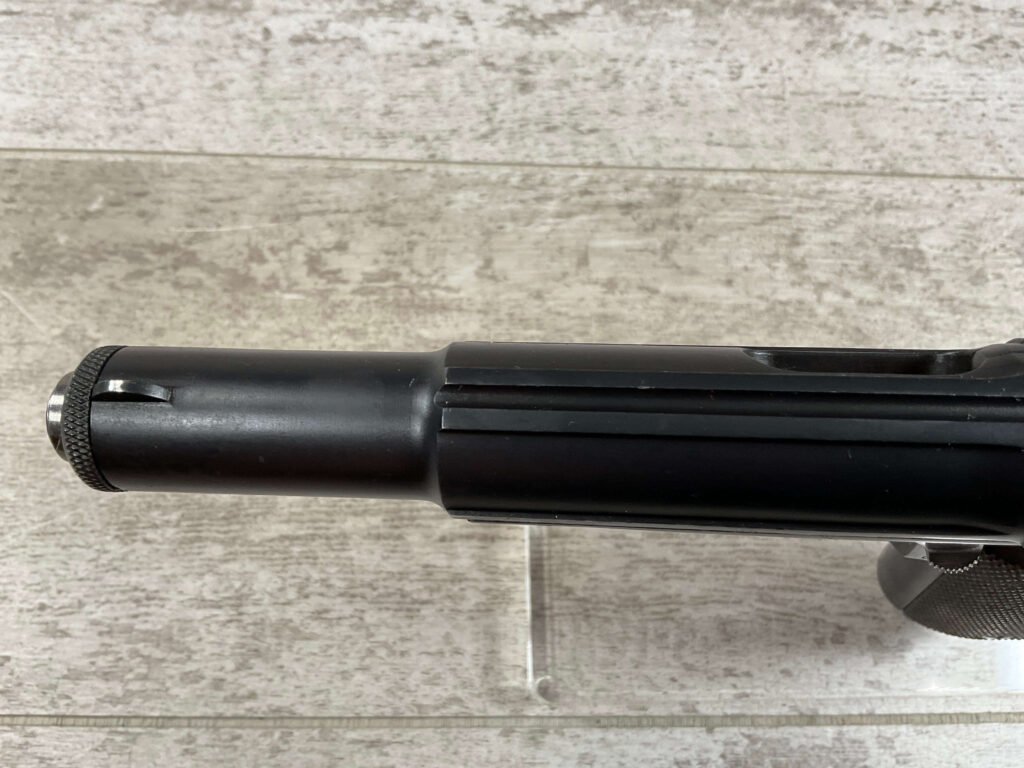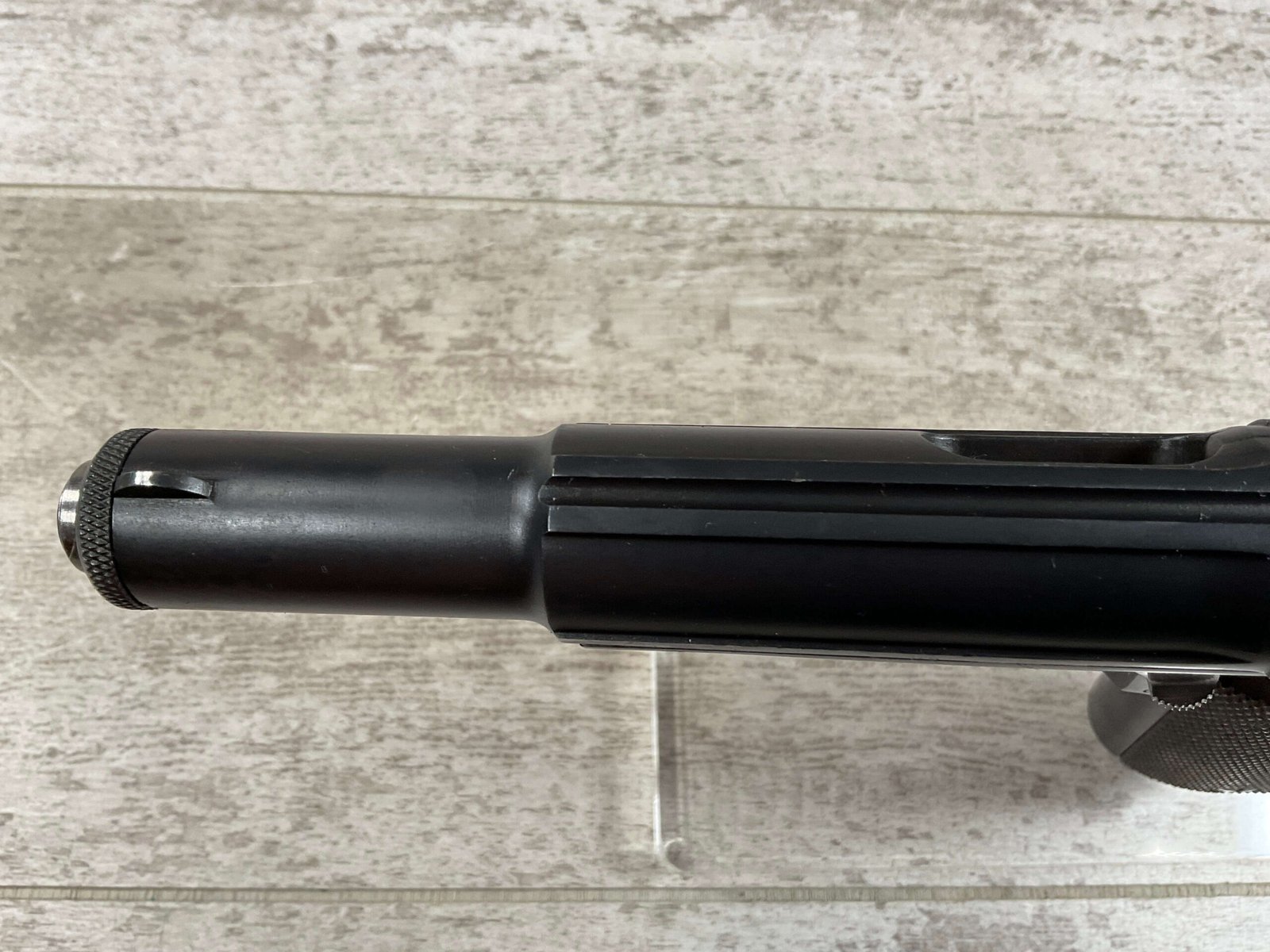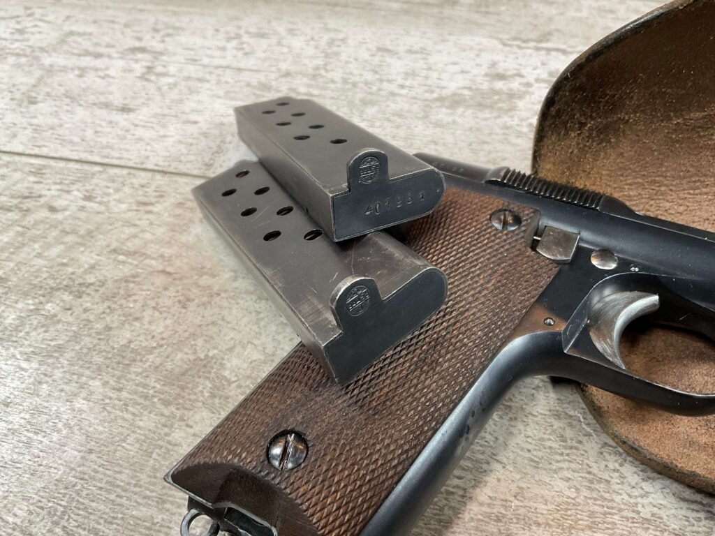 ASTRA MODEL 600 SEMI AUTO PISTOL W/HOLSTER #40193, 9MM LARGO, 6″ BBL, 95% BLUED FINISH, FIXED BLADE FRONT SIGHT, “U” SHAPED REAR SIGHT, NO IMPORT MARKS, LANYARD LOOP, ALL MATCHING, 2 ASTRA MARKED MAGAZINES (ONE MATCHING), EXC WOODEN GRIPS, BLACK LEATHER HOLSTER WITH TWO LOOPS, FRONT MAG POUCH, EXC OVERALL, 95+%