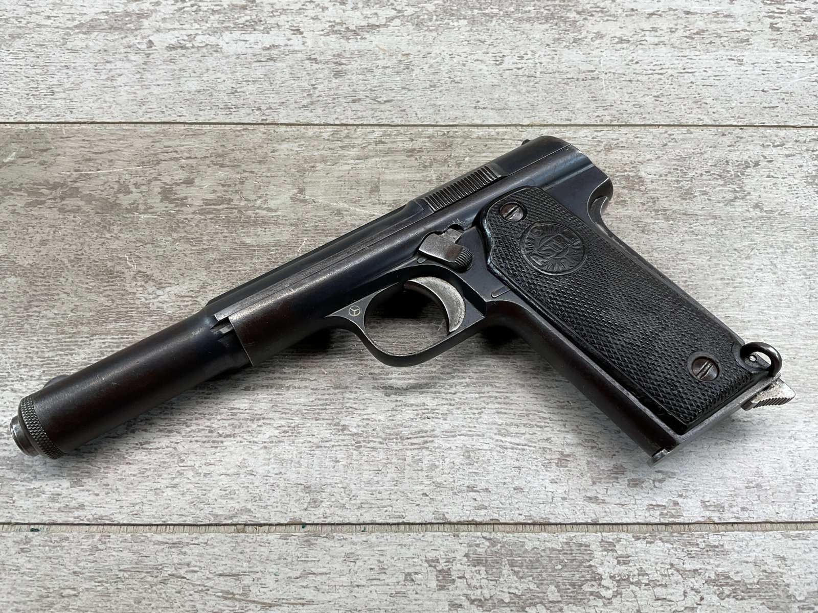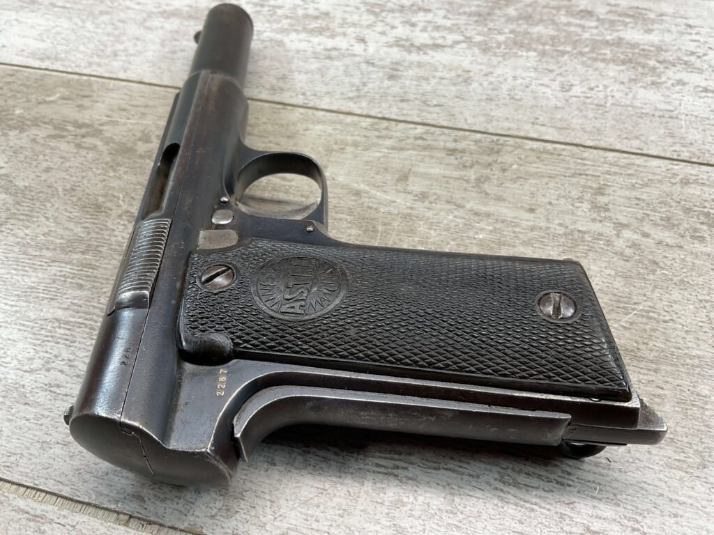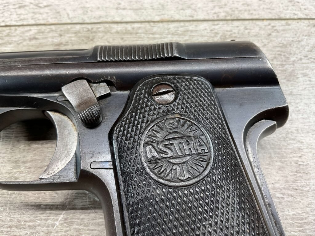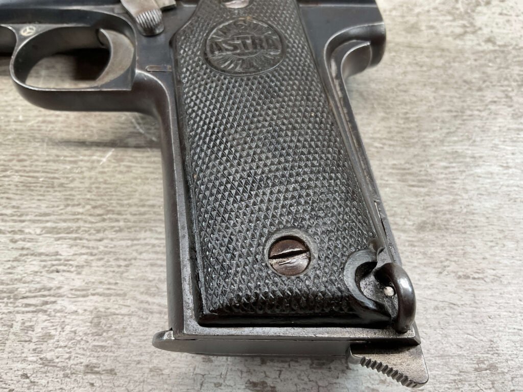 ASTRA MODELO 1921 (400) SEMI-AUTO PISTOL #2287, 9MM LARGO/9×23, GOOD SOLID DIAMOND CHECKERED WOODEN GRIPS, LIGHT HIGH EDGE WEAR W/ AREAS TURNING GREY PATINA, FAIR BORE W/OK RIFLING & FROSTING IN THE GROOVES, ALL MATCHING, ORIGINAL FACTORY MAGAZINE, OVERALL 85%+