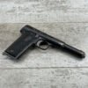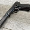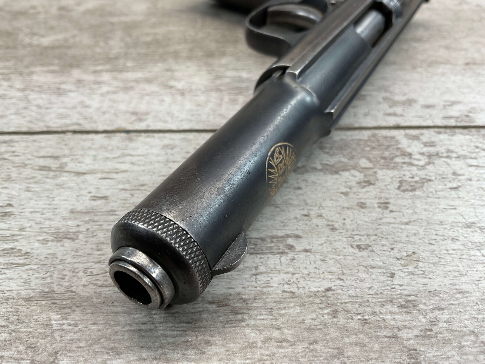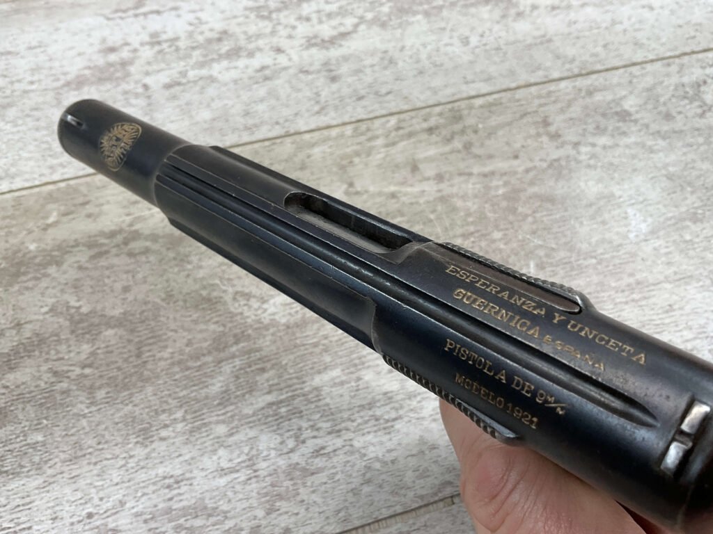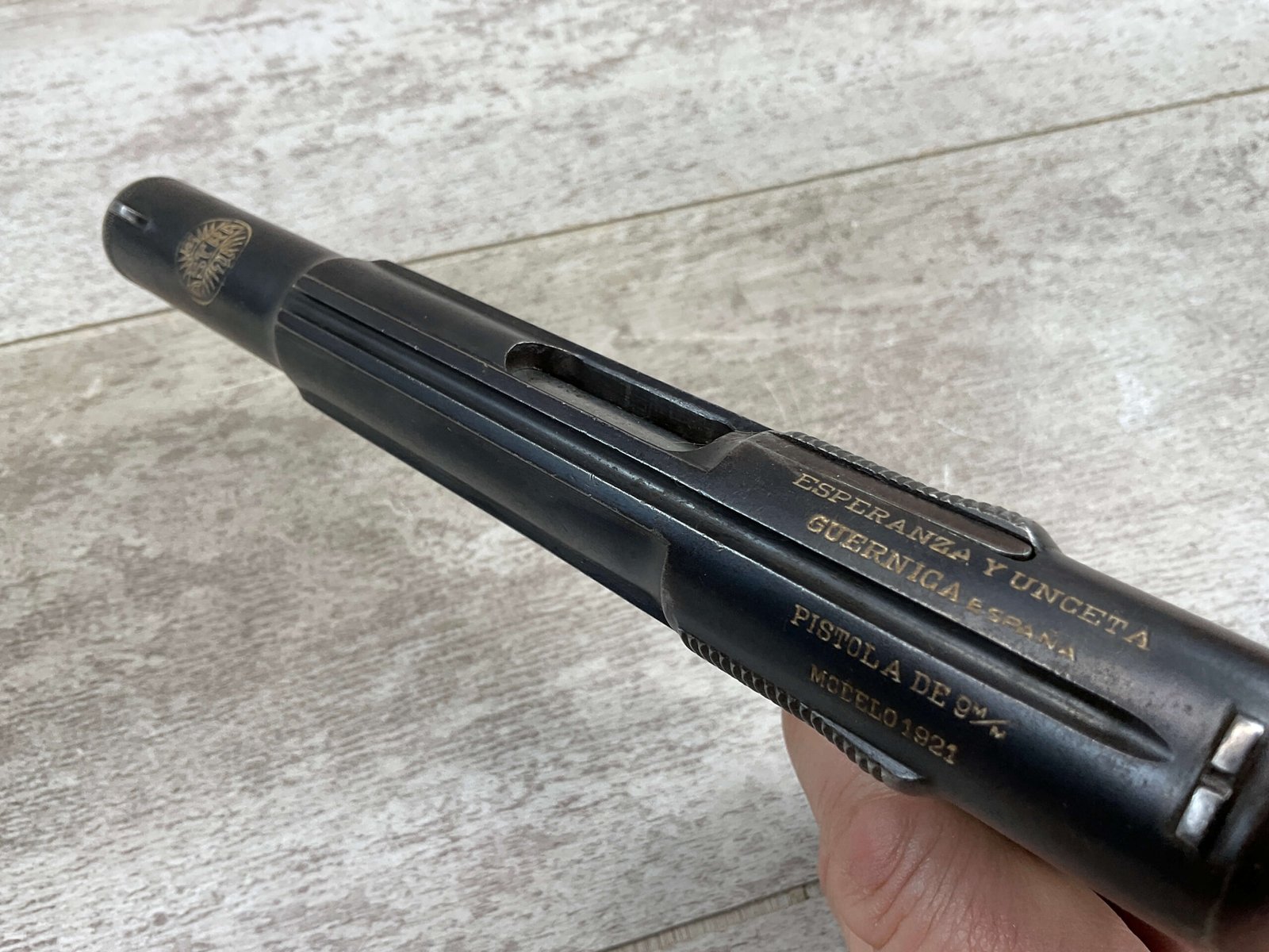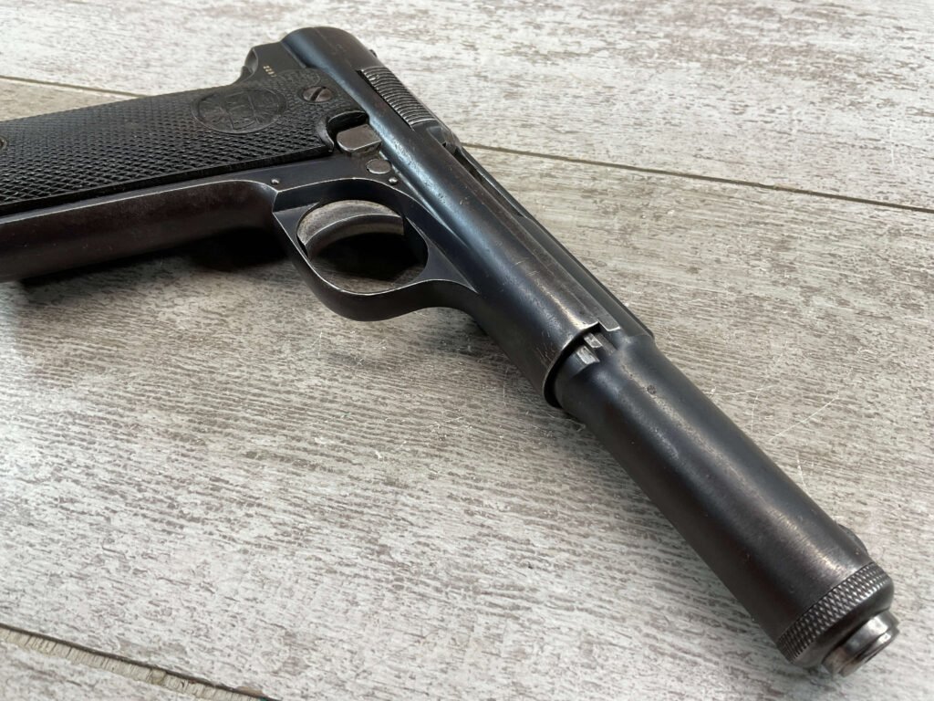ASTRA MODELO 1921 (400) SEMI-AUTO PISTOL #2287, 9MM LARGO/9×23, GOOD SOLID DIAMOND CHECKERED WOODEN GRIPS, LIGHT HIGH EDGE WEAR W/ AREAS TURNING GREY PATINA, FAIR BORE W/OK RIFLING & FROSTING IN THE GROOVES, ALL MATCHING, ORIGINAL FACTORY MAGAZINE, OVERALL 85%+