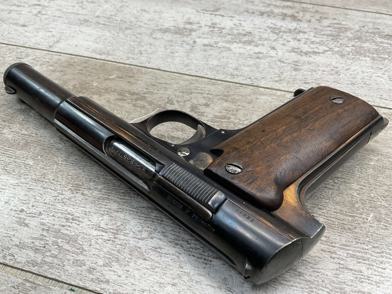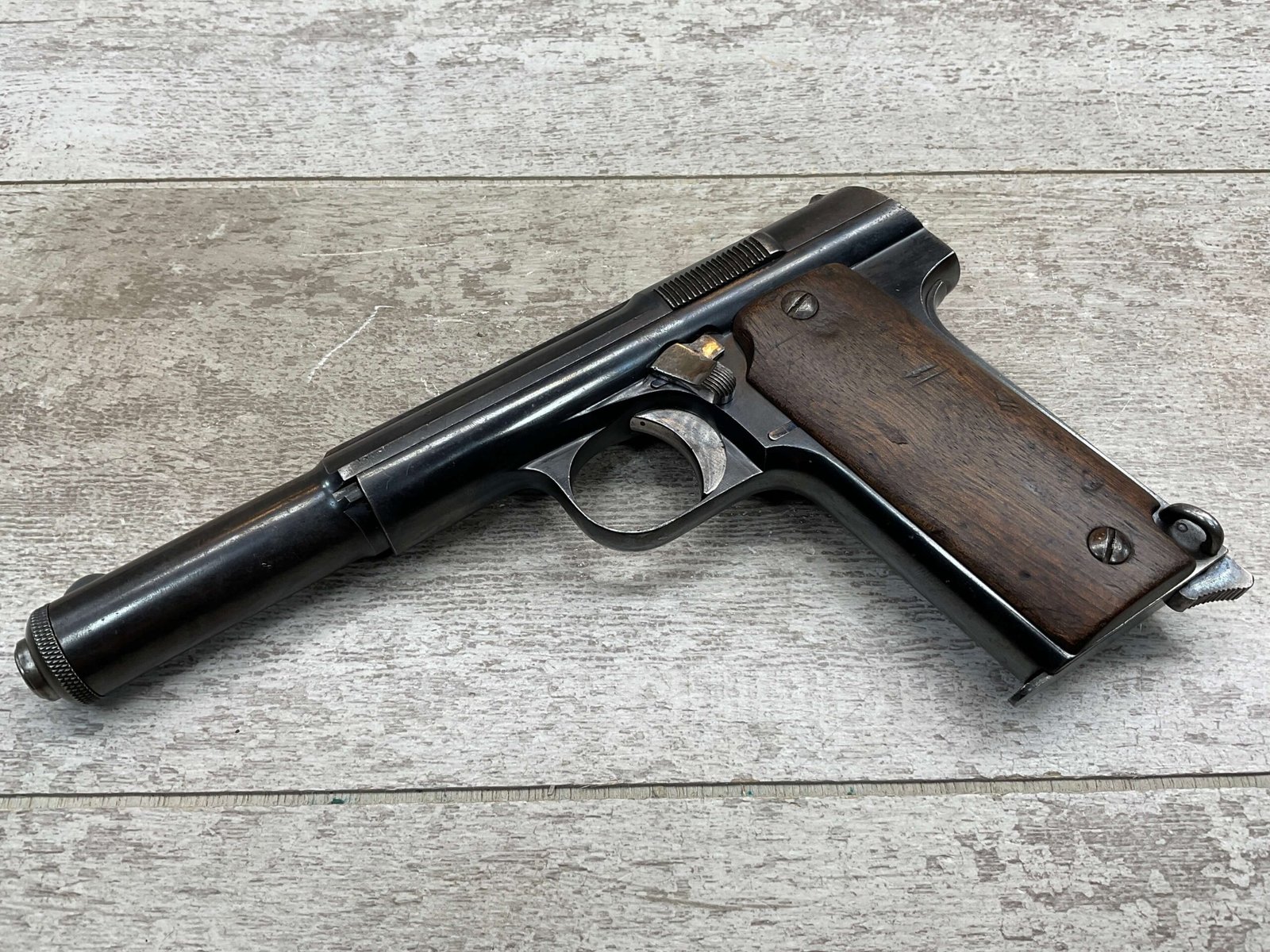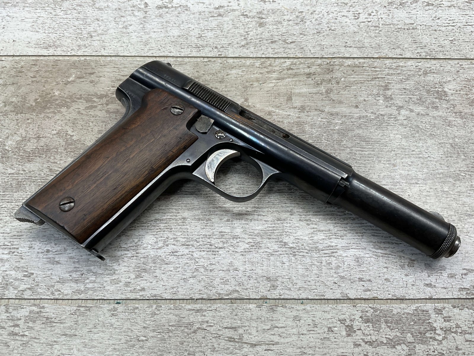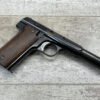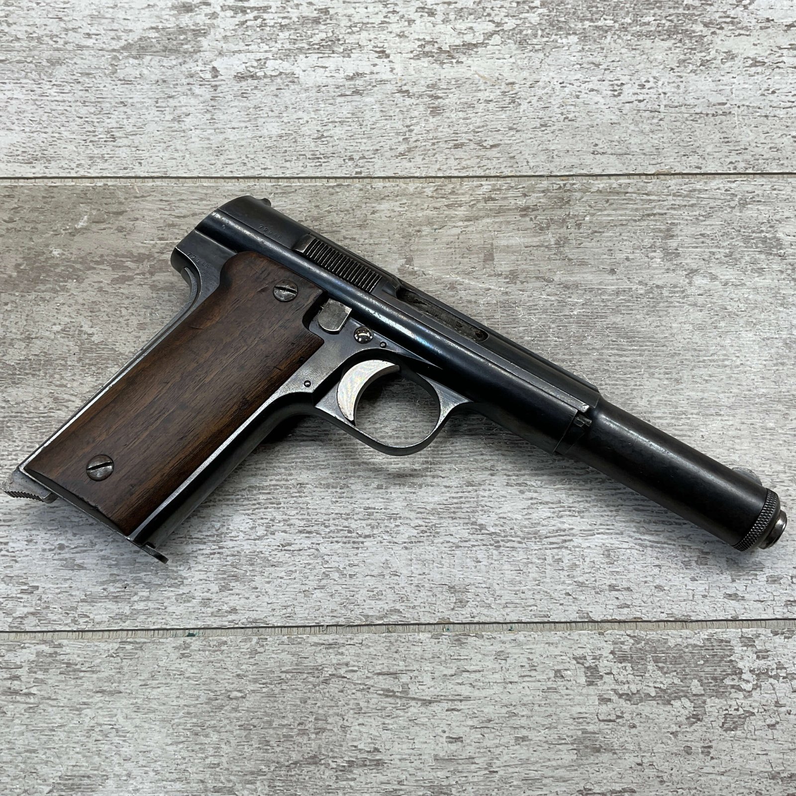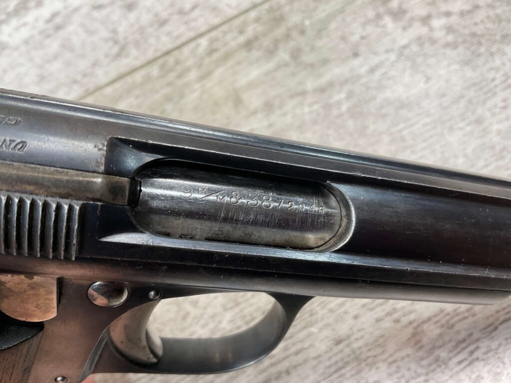 ASTRA MODELO 1921 (400) SEMI-AUTO PISTOL #72946, 1937-38 MFR, 1 OF 15,350 THAT WENT TO VARIOUS SPANISH ARMORIES, 9MM & 38 MARKED BBL (.38ACP), VG SMOOTH WALNUT GRIPS, NORMAL WEAR AND W/VERY LIGHT OXIDATION AROUND REAR SIGHT, LIGHT HIGH EDGE WEAR, DARKER BORE W/GOOD RIFLING & FROSTING THROUGHOUT, ALL MATCHING, 1 UNMARKED MAGAZINE, OVERALL 80+%