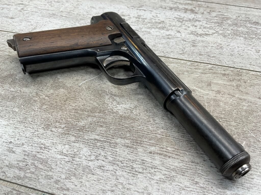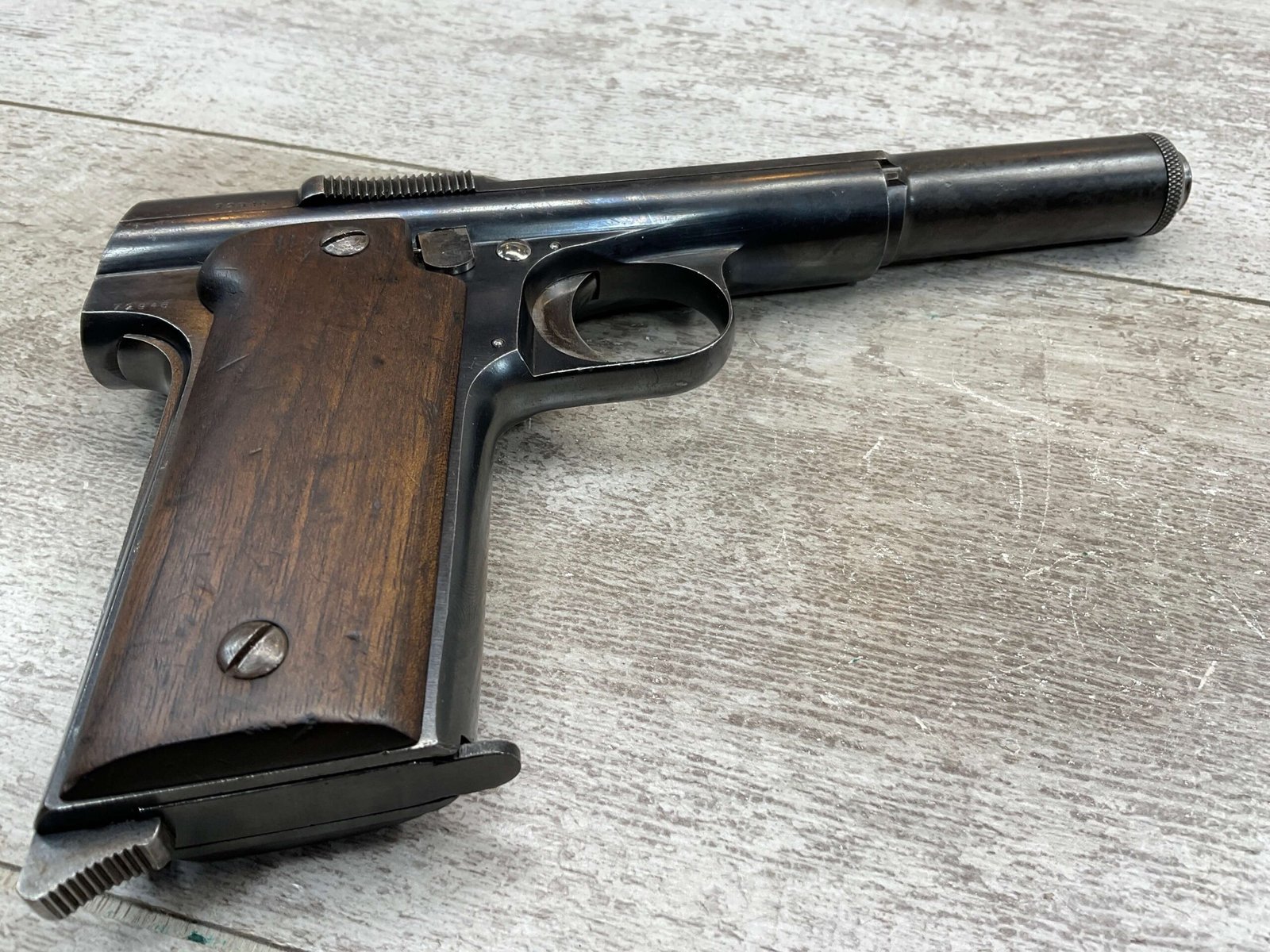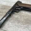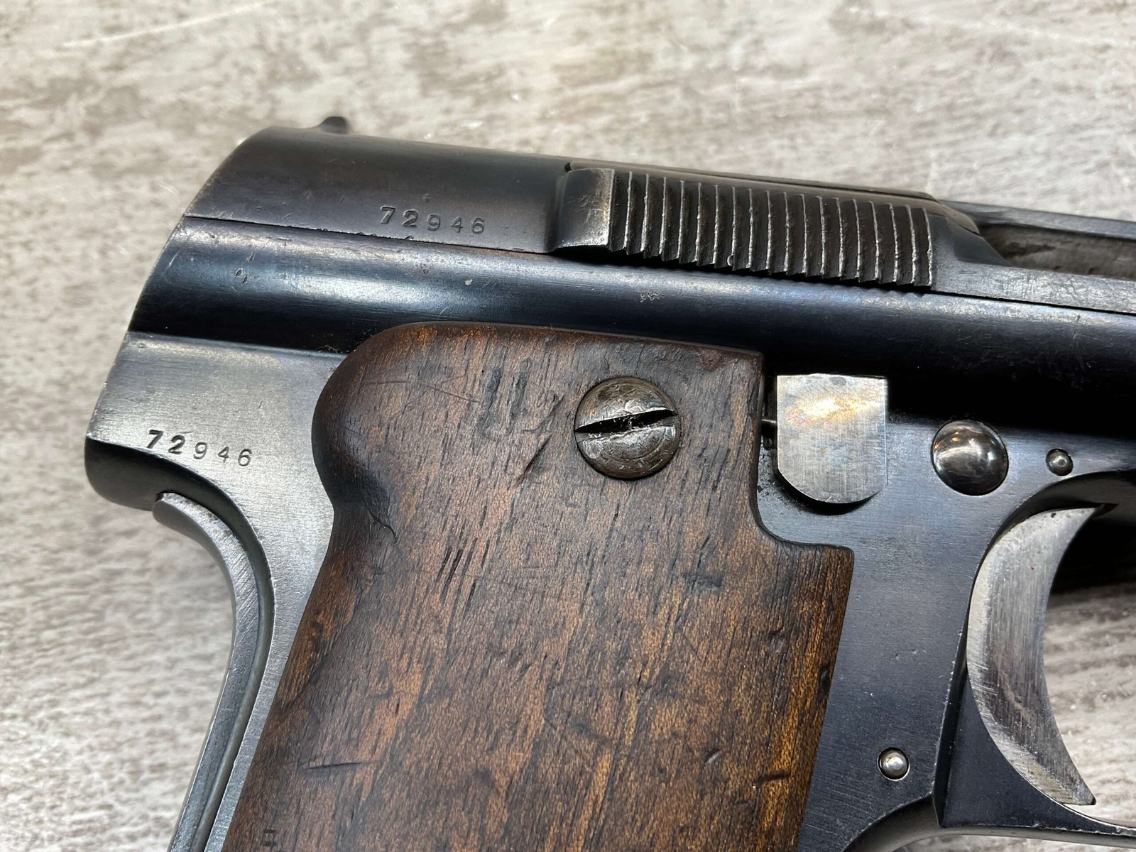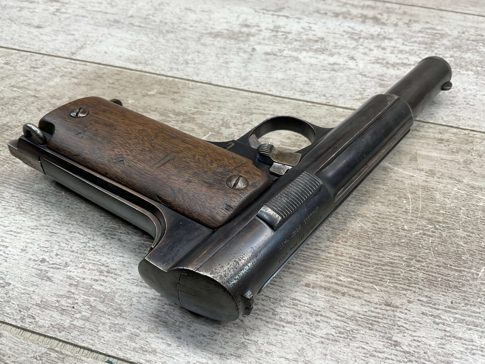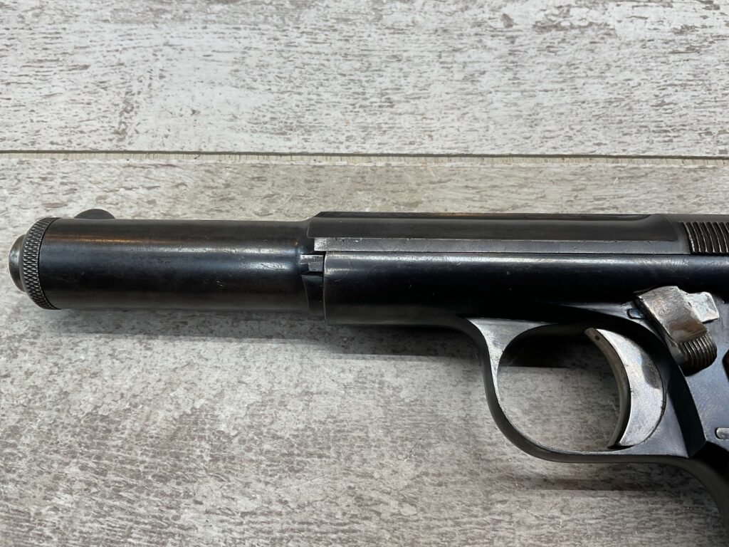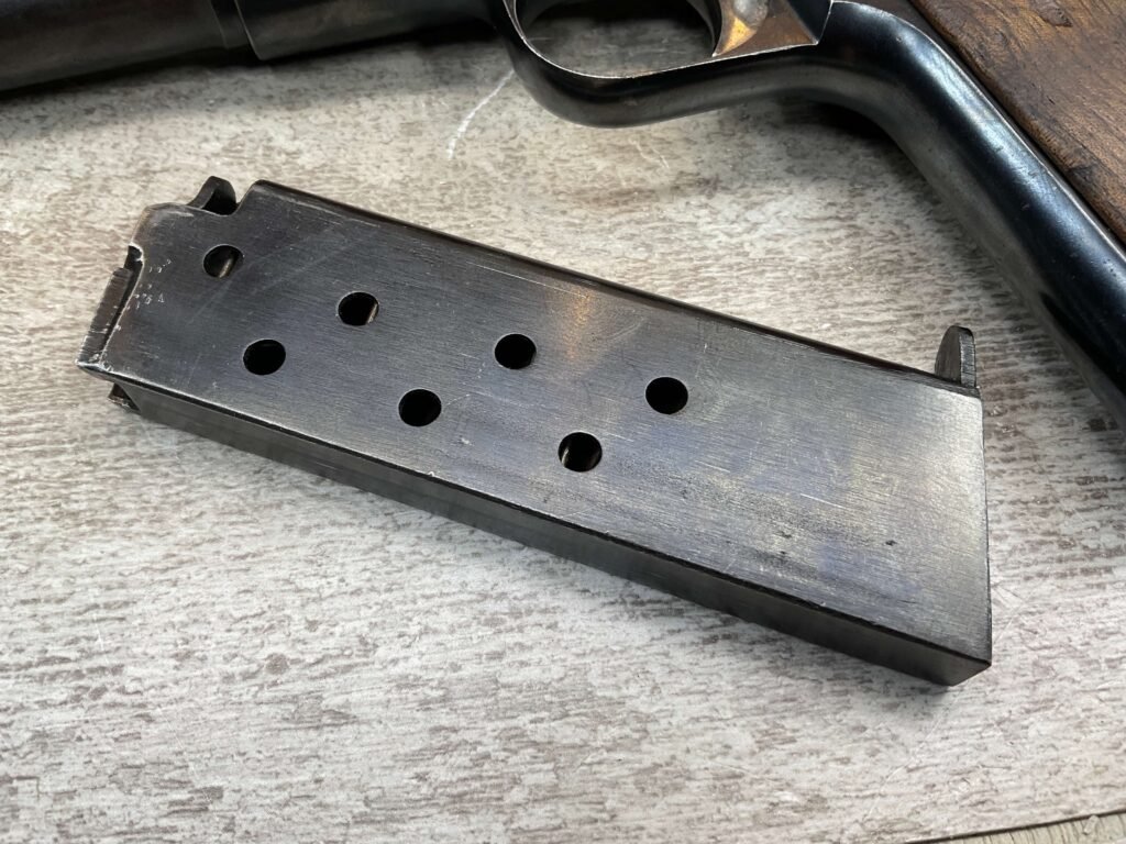 ASTRA MODELO 1921 (400) SEMI-AUTO PISTOL #72946, 1937-38 MFR, 1 OF 15,350 THAT WENT TO VARIOUS SPANISH ARMORIES, 9MM & 38 MARKED BBL (.38ACP), VG SMOOTH WALNUT GRIPS, NORMAL WEAR AND W/VERY LIGHT OXIDATION AROUND REAR SIGHT, LIGHT HIGH EDGE WEAR, DARKER BORE W/GOOD RIFLING & FROSTING THROUGHOUT, ALL MATCHING, 1 UNMARKED MAGAZINE, OVERALL 80+%