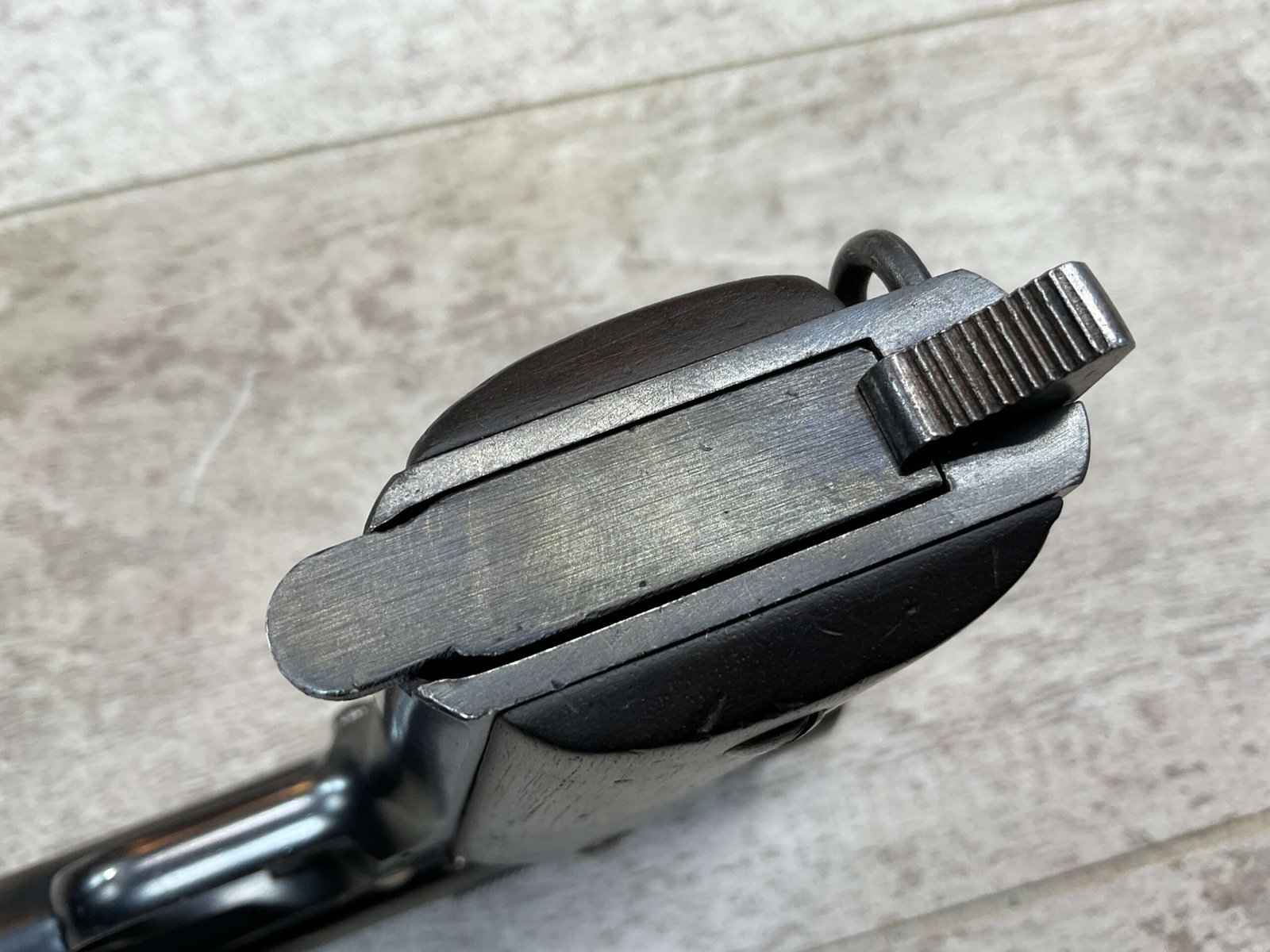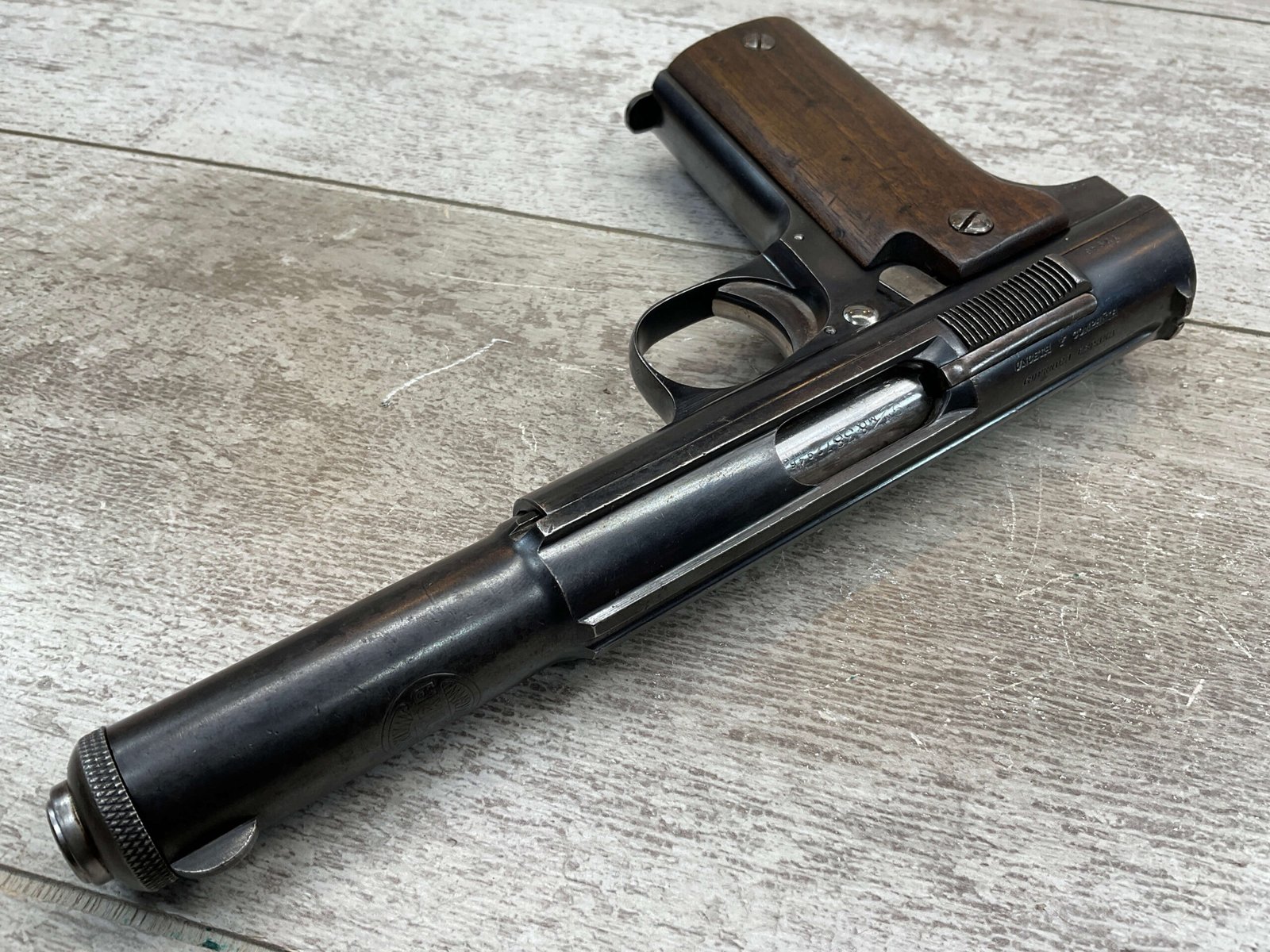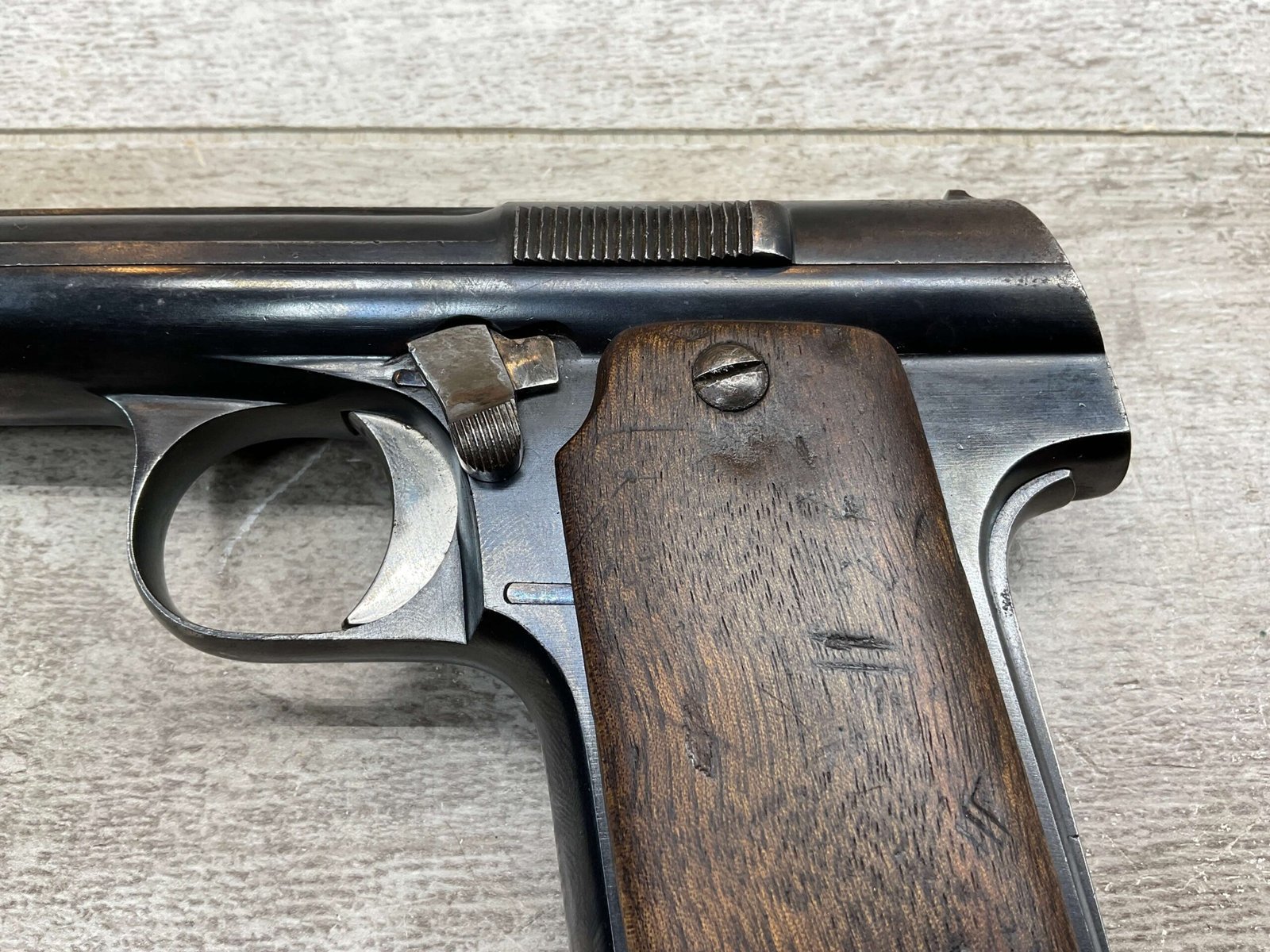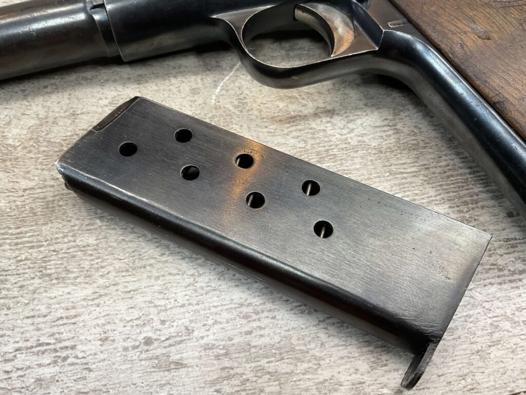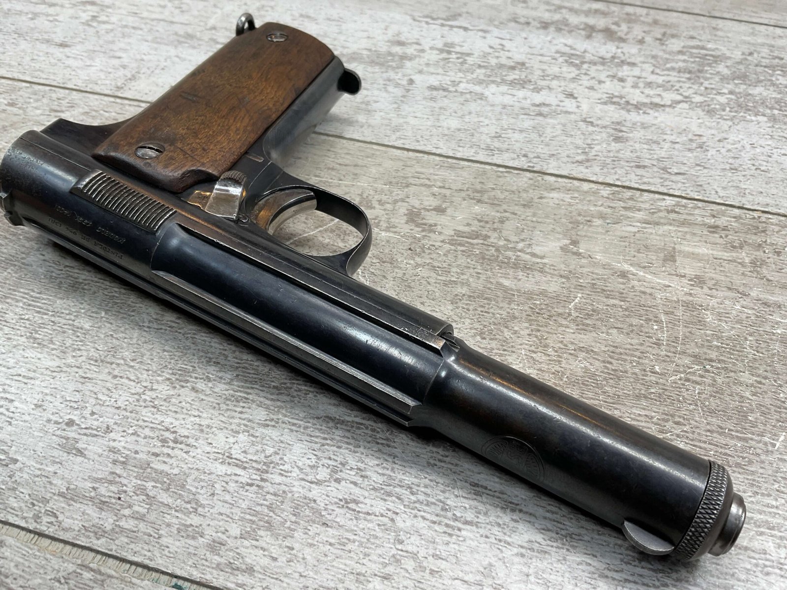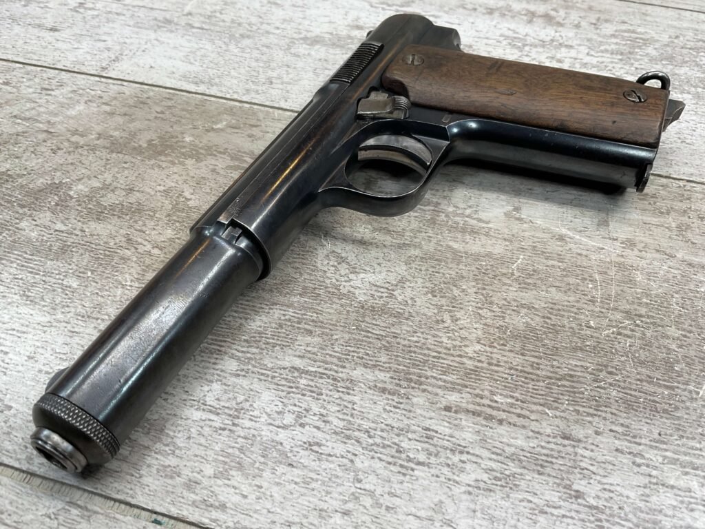 ASTRA MODELO 1921 (400) SEMI-AUTO PISTOL #72946, 1937-38 MFR, 1 OF 15,350 THAT WENT TO VARIOUS SPANISH ARMORIES, 9MM & 38 MARKED BBL (.38ACP), VG SMOOTH WALNUT GRIPS, NORMAL WEAR AND W/VERY LIGHT OXIDATION AROUND REAR SIGHT, LIGHT HIGH EDGE WEAR, DARKER BORE W/GOOD RIFLING & FROSTING THROUGHOUT, ALL MATCHING, 1 UNMARKED MAGAZINE, OVERALL 80+%