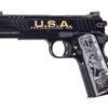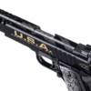 This exclusive design features “USA Stand Unitedâ€, 47th Potus, his historic wounded image, “God Bless Americaâ€, and his call to “FIGHT†in bold text engraved on the slide sides. The top of the slide features the American flag. Each grip depicts images of President Trump rising to his feet after being wounded, standing strong before the American flag. The stainless steel pistol is coated with a Cerakote Graphite Black, Gold, and USMC Red.