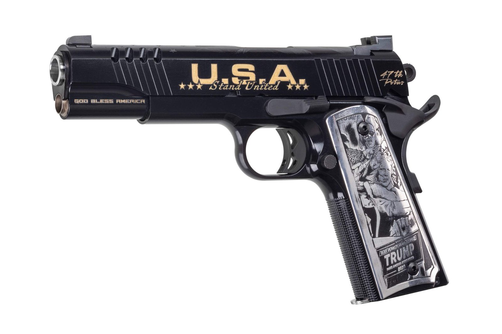This exclusive design features “USA Stand Unitedâ€, 47th Potus, his historic wounded image, “God Bless Americaâ€, and his call to “FIGHT†in bold text engraved on the slide sides. The top of the slide features the American flag. Each grip depicts images of President Trump rising to his feet after being wounded, standing strong before the American flag. The stainless steel pistol is coated with a Cerakote Graphite Black, Gold, and USMC Red.
