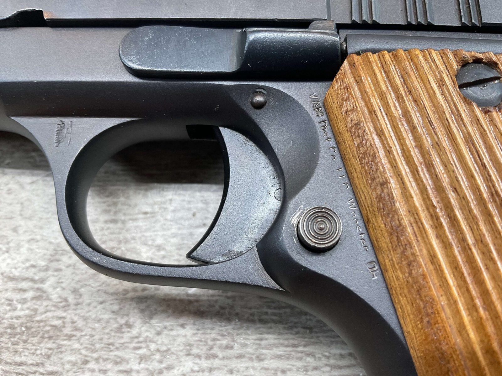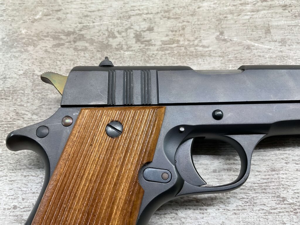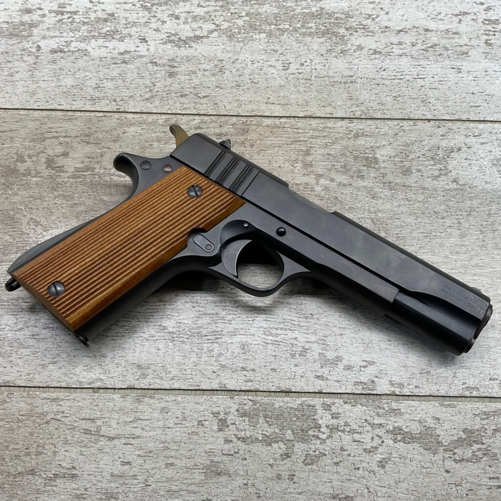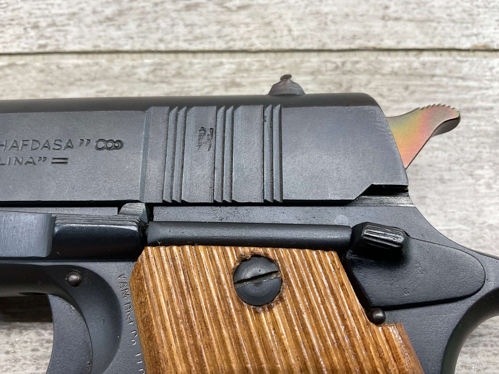 The Ballester-Molina, also known as the Hafdasa, is a semi-automatic pistol from Argentina, chambered in .45 ACP (11.25mm). Renowned for its robust construction and similarity to the Colt M1911, it is a desirable collectible. Here’s a detailed description of the Ballester-Molina with a phosphate finish and light import mark: