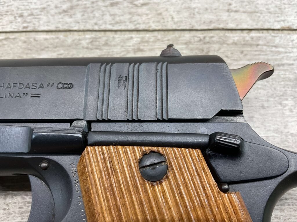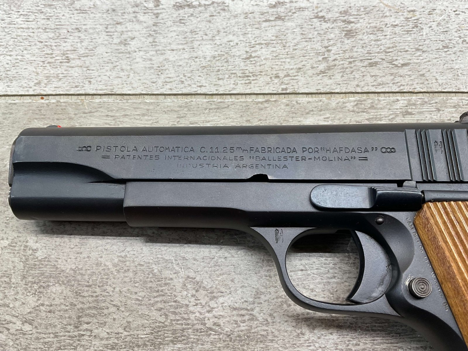 - Slide: “PISTOLA AUTOMATICA C.11.25MM FABRICADA POR “HAFDASA”/PETENTES INTERNACIONALES “BALLISTER-MOLINA”/INDUSTRIA ARGENTINA”