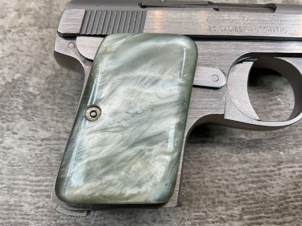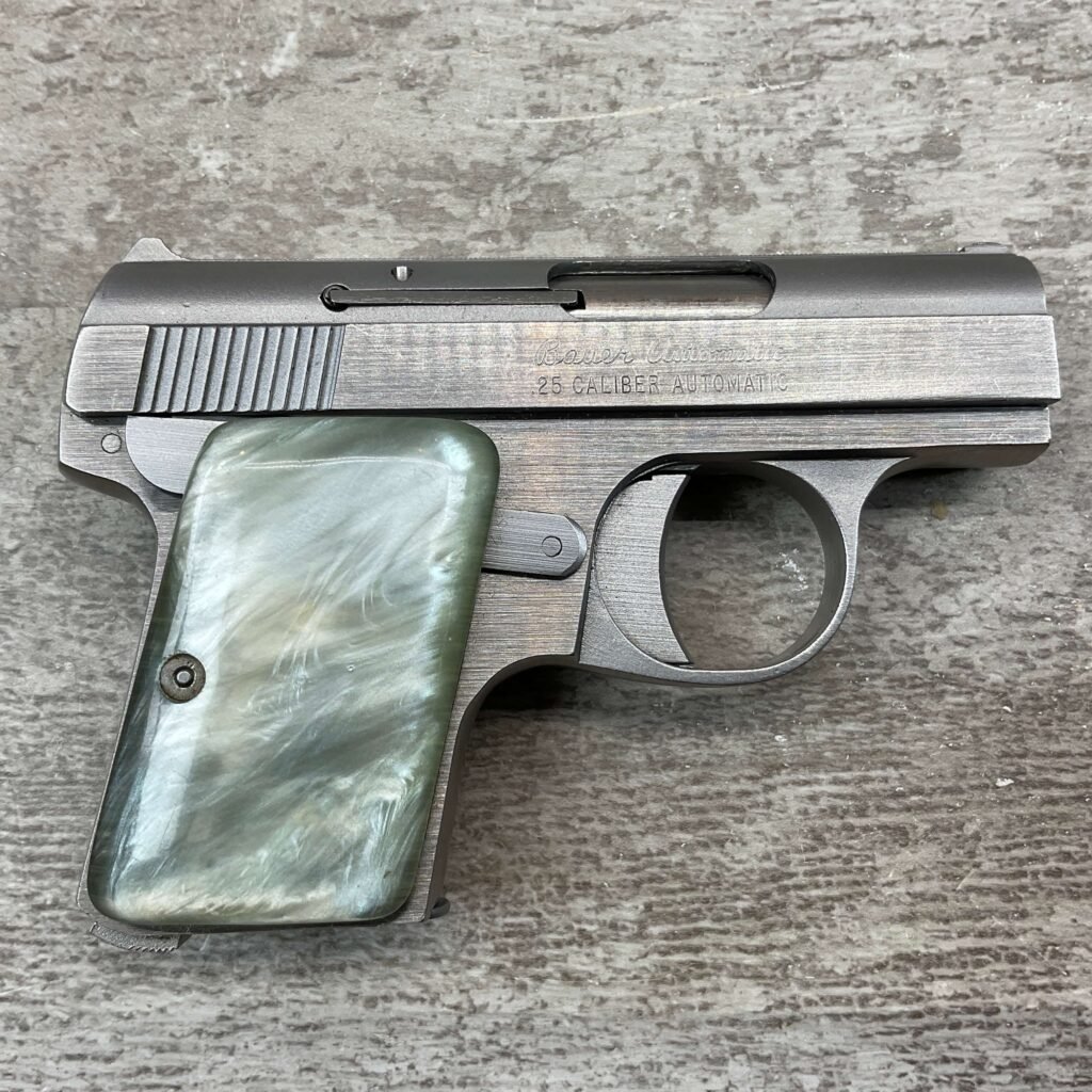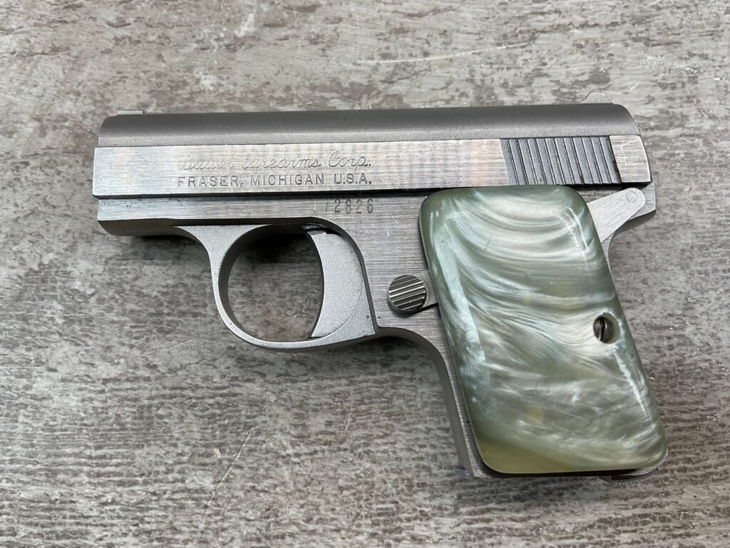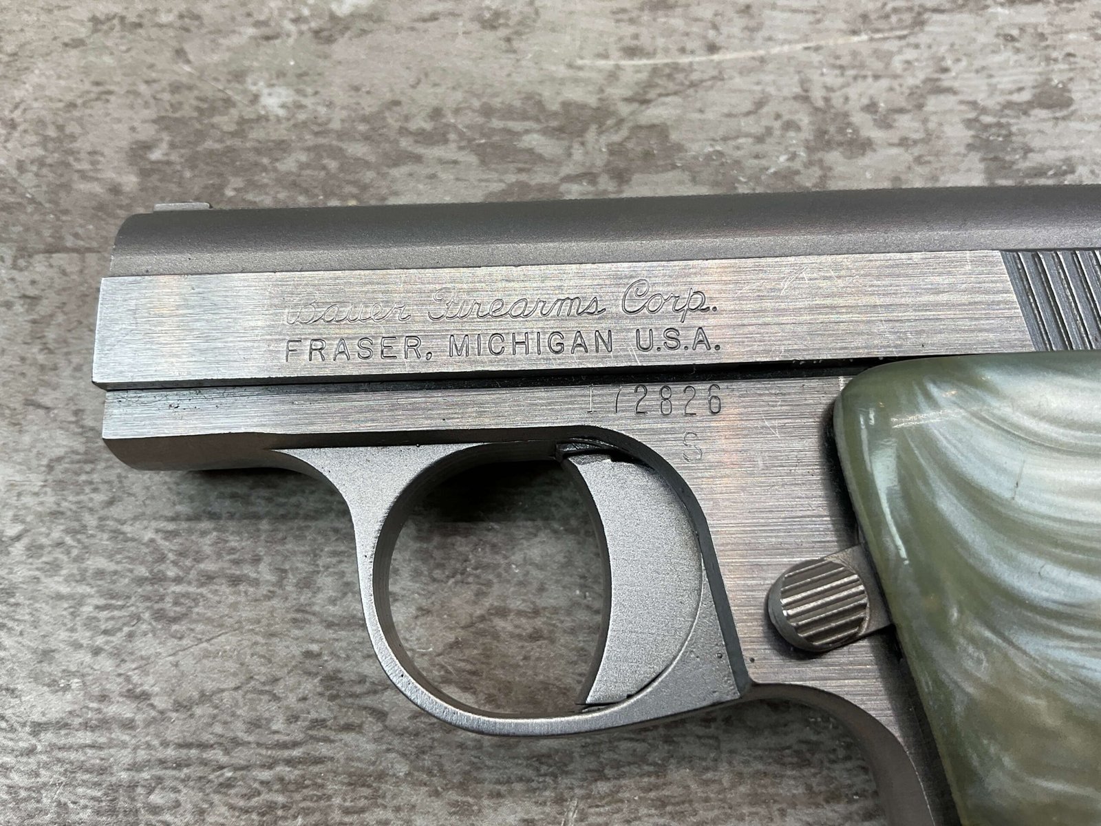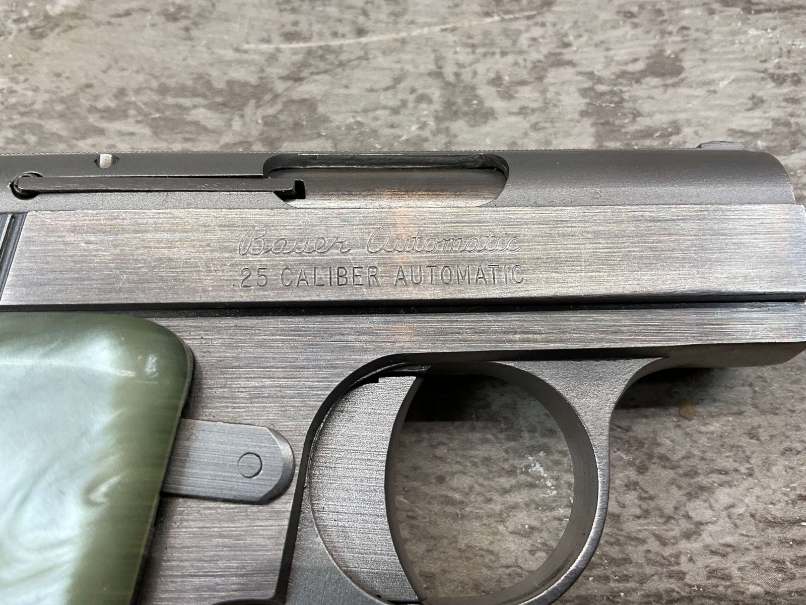 BAUER “BABY” .25 ACP STAINLESS SEMI AUTO POCKET PISTOL, BROWNING CLONE, #172826, 2.5″ BARREL, 6-ROUND MAGAZINE, EXC MOTHER OF PEARL GRIPS, EXC POLISHED STAINLESS STEEL FRAME & SLIDE, LOADED CHAMBER INDICATOR, FIXED FRONT & REAR SIGHTS, LEFT SLIDE MARKED “BAUER FIREARMS CORP. / FRASER, MICHIGAN U.S.A.”, LEFT SIDE ABOVE TRIGGER GUARD MARKED WITH SERIAL “172826 / S”, RIGHT SLIDE MARKED “BAUER AUTOMATIC / .25 CALIBER AUTOMATIC”, MAG FOOT MARKED “.25 CAL. AUTO”, EXC OVERALL CONDITION!