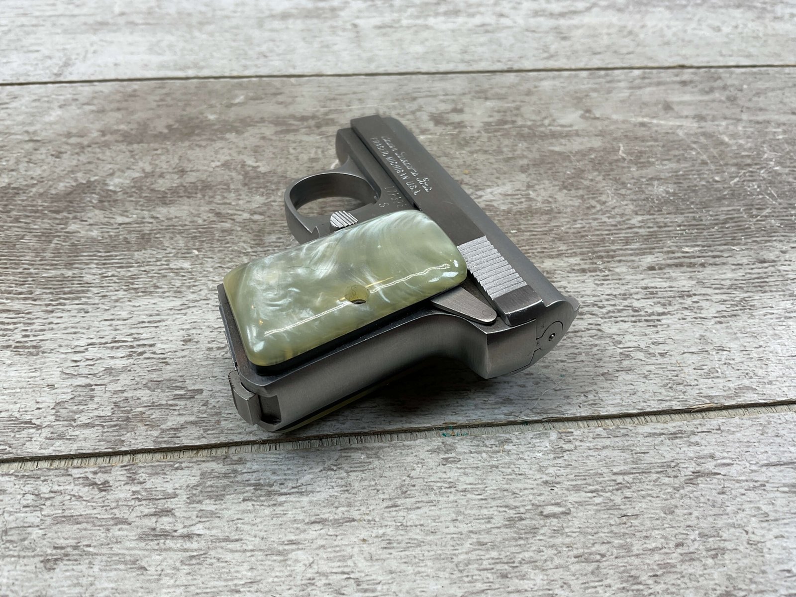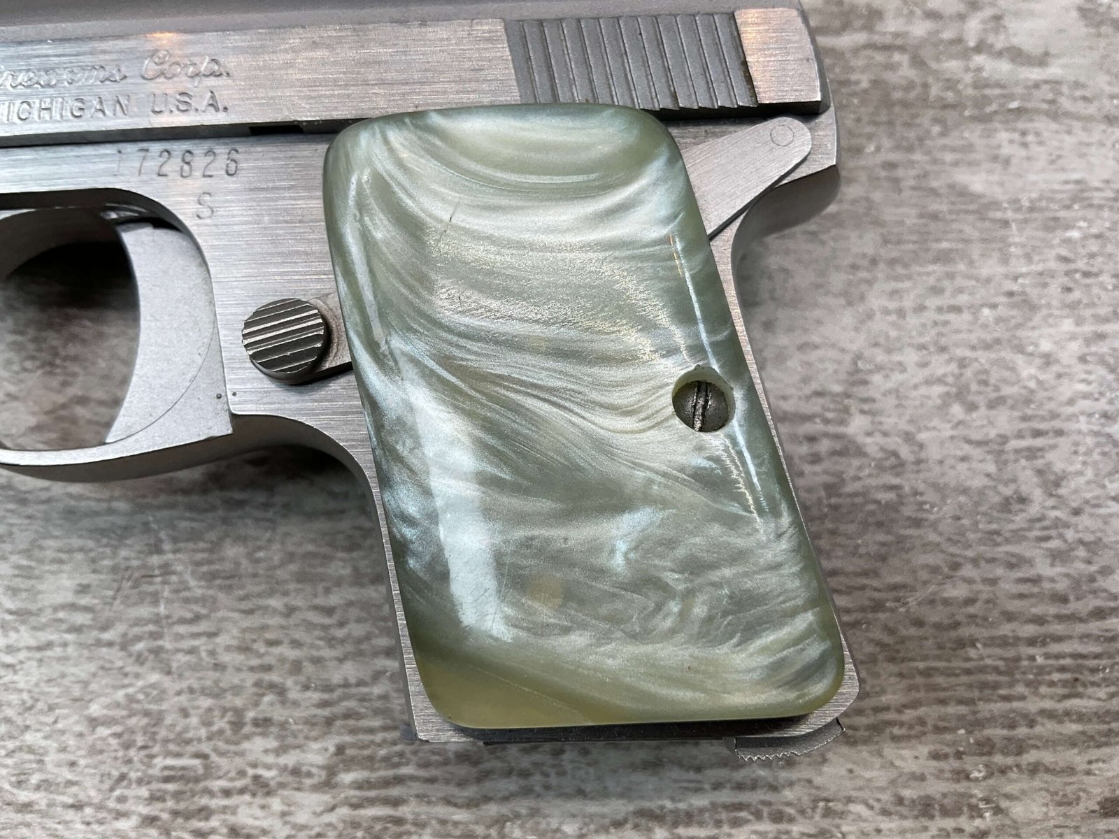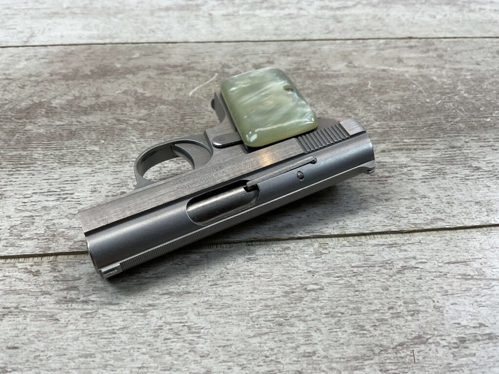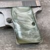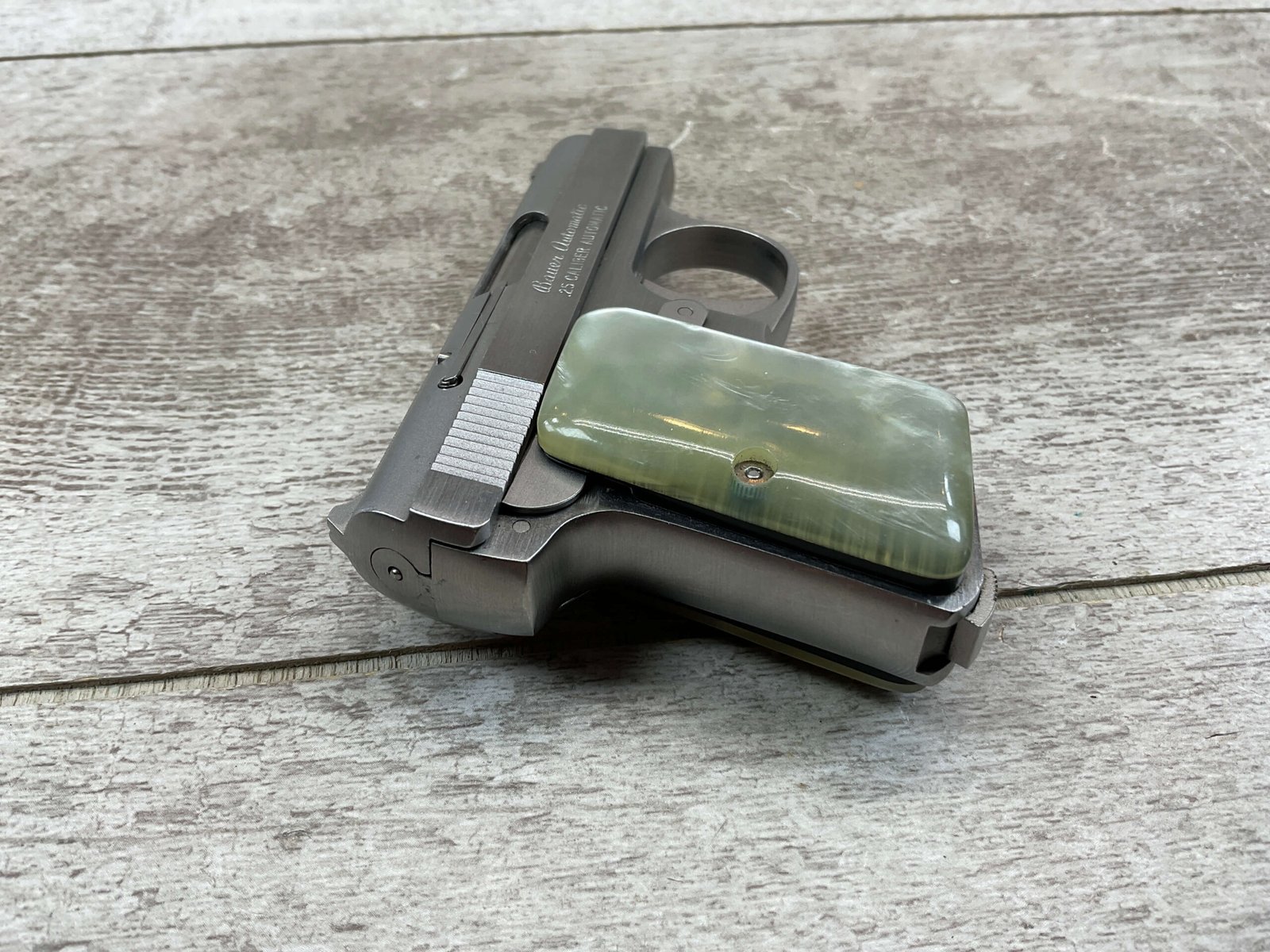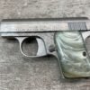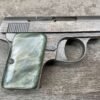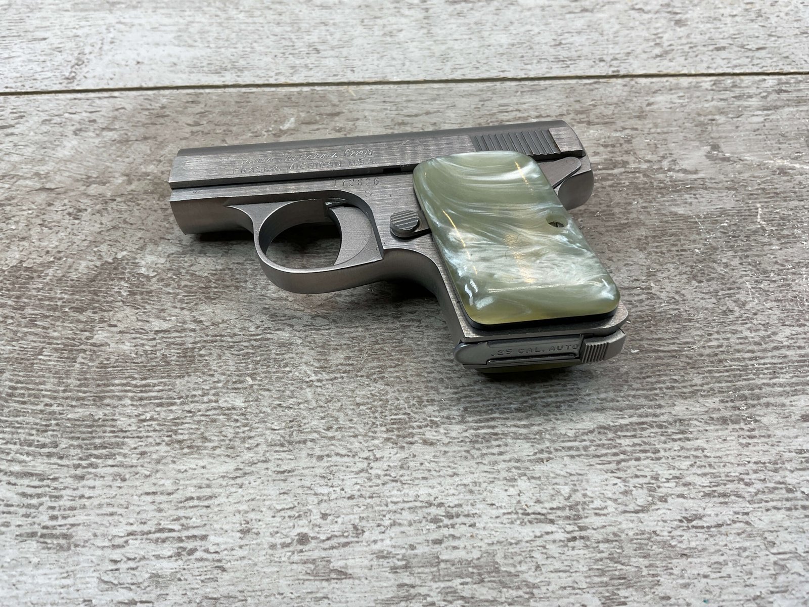 BAUER “BABY” .25 ACP STAINLESS SEMI AUTO POCKET PISTOL, BROWNING CLONE, #172826, 2.5″ BARREL, 6-ROUND MAGAZINE, EXC MOTHER OF PEARL GRIPS, EXC POLISHED STAINLESS STEEL FRAME & SLIDE, LOADED CHAMBER INDICATOR, FIXED FRONT & REAR SIGHTS, LEFT SLIDE MARKED “BAUER FIREARMS CORP. / FRASER, MICHIGAN U.S.A.”, LEFT SIDE ABOVE TRIGGER GUARD MARKED WITH SERIAL “172826 / S”, RIGHT SLIDE MARKED “BAUER AUTOMATIC / .25 CALIBER AUTOMATIC”, MAG FOOT MARKED “.25 CAL. AUTO”, EXC OVERALL CONDITION!