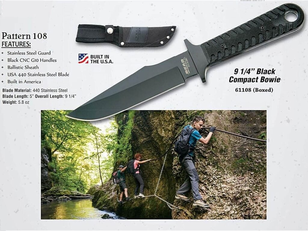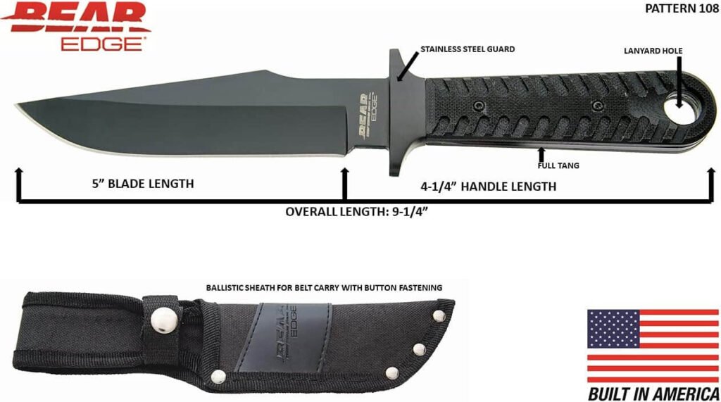 Pattern 108 is a USA built 9-1/4” Black Compact Bowie knife that is part of the Bear Edge® line and weighs 5.8 ounces. The 5” hollow ground blade is made with 440 High Carbon Stainless Steel with a black coating to help prevent rust and is easy to sharpen. This fixed compact Bowie is designed with a stainless-steel guard and the Bear Edge® logo is engraved on the blade. The handle is made with a rugged Black G10 style for a secure grip and comes with a ballistic sheath for belt carry. A lanyard hole is also present on the back of the handle for secure fastening and storage.
