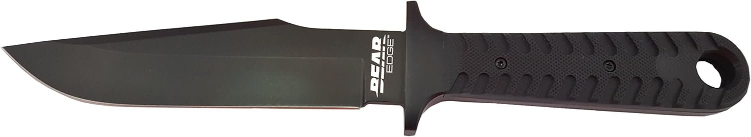 Pattern 108 is a USA built 9-1/4” Black Compact Bowie knife that is part of the Bear Edge® line and weighs 5.8 ounces. The 5” hollow ground blade is made with 440 High Carbon Stainless Steel with a black coating to help prevent rust and is easy to sharpen. This fixed compact Bowie is designed with a stainless-steel guard and the Bear Edge® logo is engraved on the blade. The handle is made with a rugged Black G10 style for a secure grip and comes with a ballistic sheath for belt carry. A lanyard hole is also present on the back of the handle for secure fastening and storage.