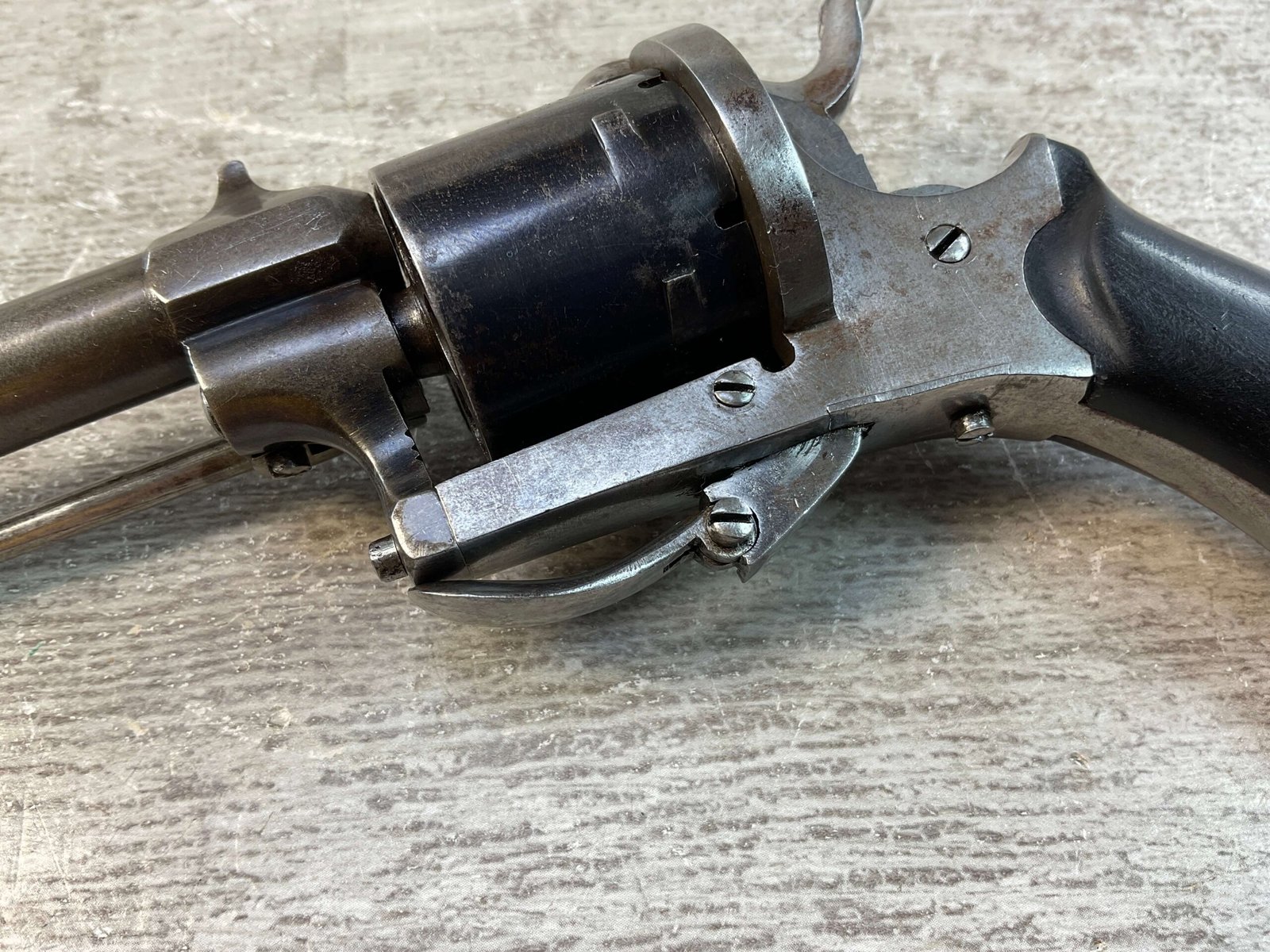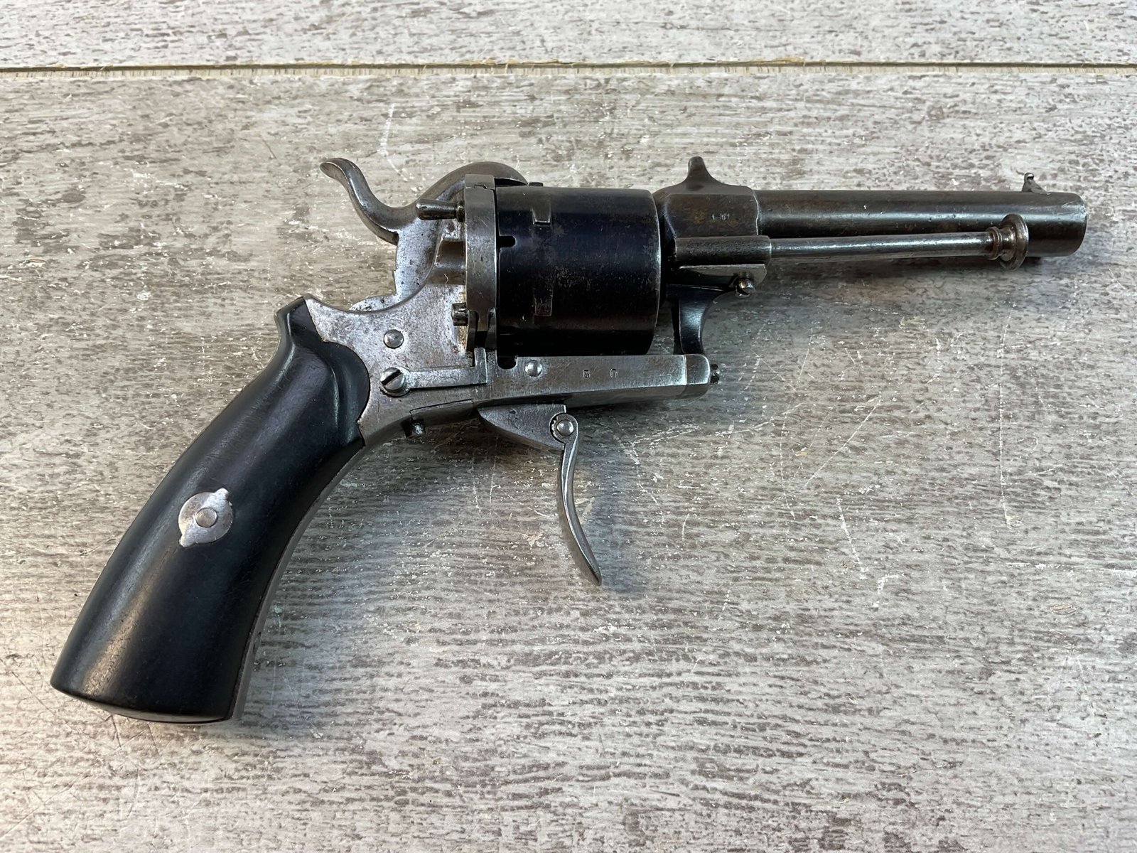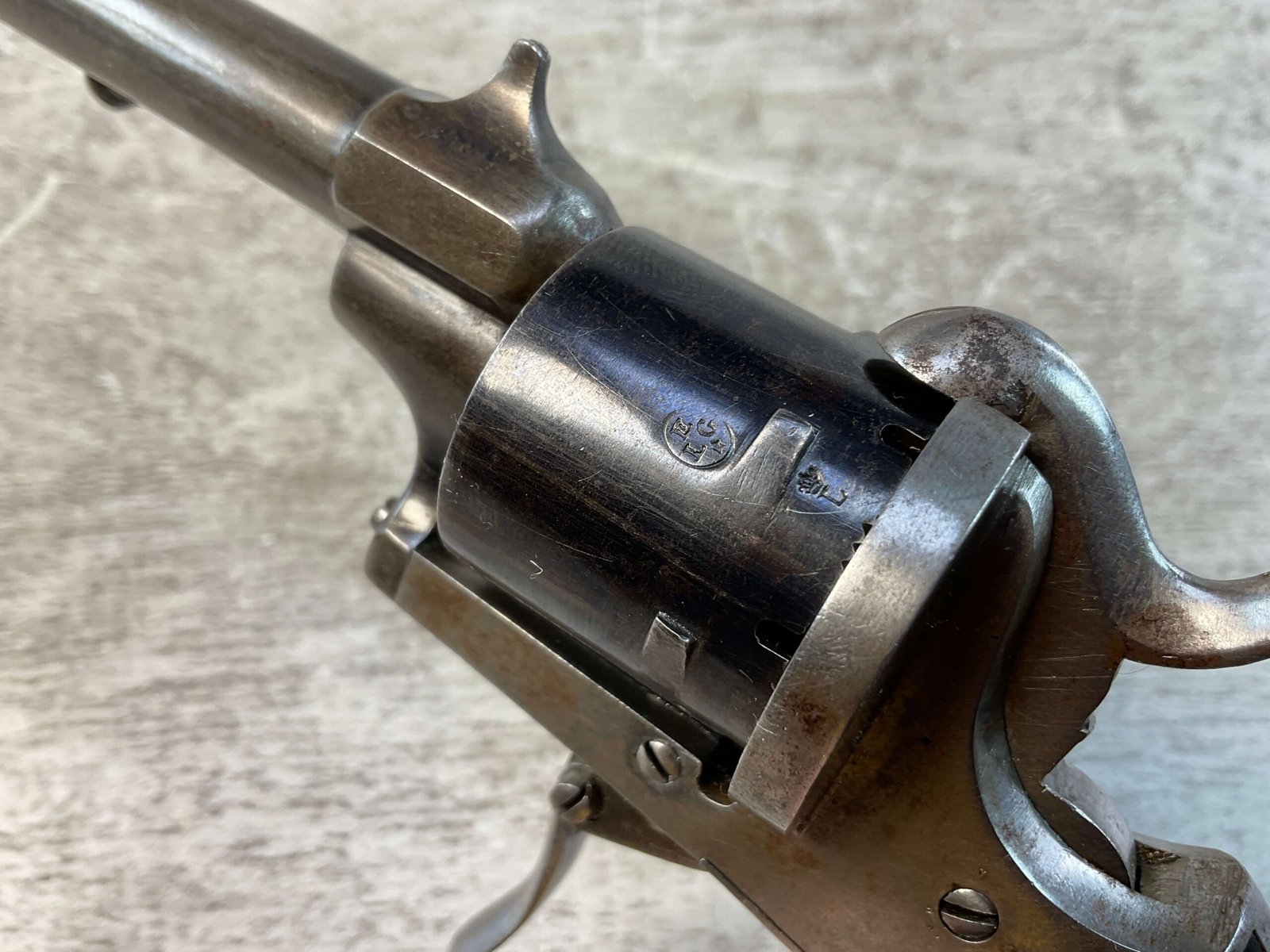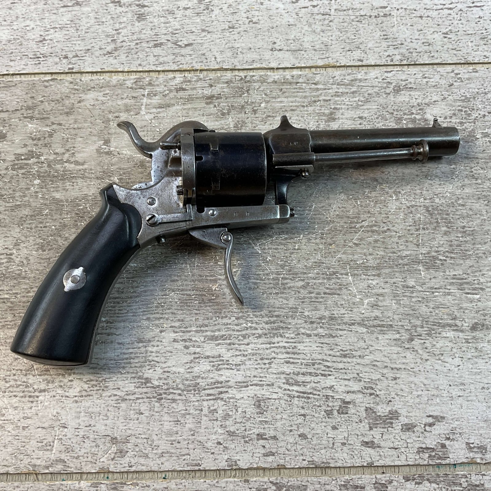 BELGIAN .32 PINFIRE REVOLVER, JAMES EARL JONES COLLECTION #80, 3 1/4″ BARREL, EXC SMOOTH WALNUT GRIPS, FRAME IS IN THE WHITE, BARREL STILL HAS BLUE FINISH & BARREL HAS TURNED LIGHT BROWN PATINA, FOLDING TRIGGER, AS SHOWN IN PICTURES, FROM THE JAMES EARL JONES “FAVORITES” COLLECTION W/ CERTIFICATE OF AUTHENTICITY.
