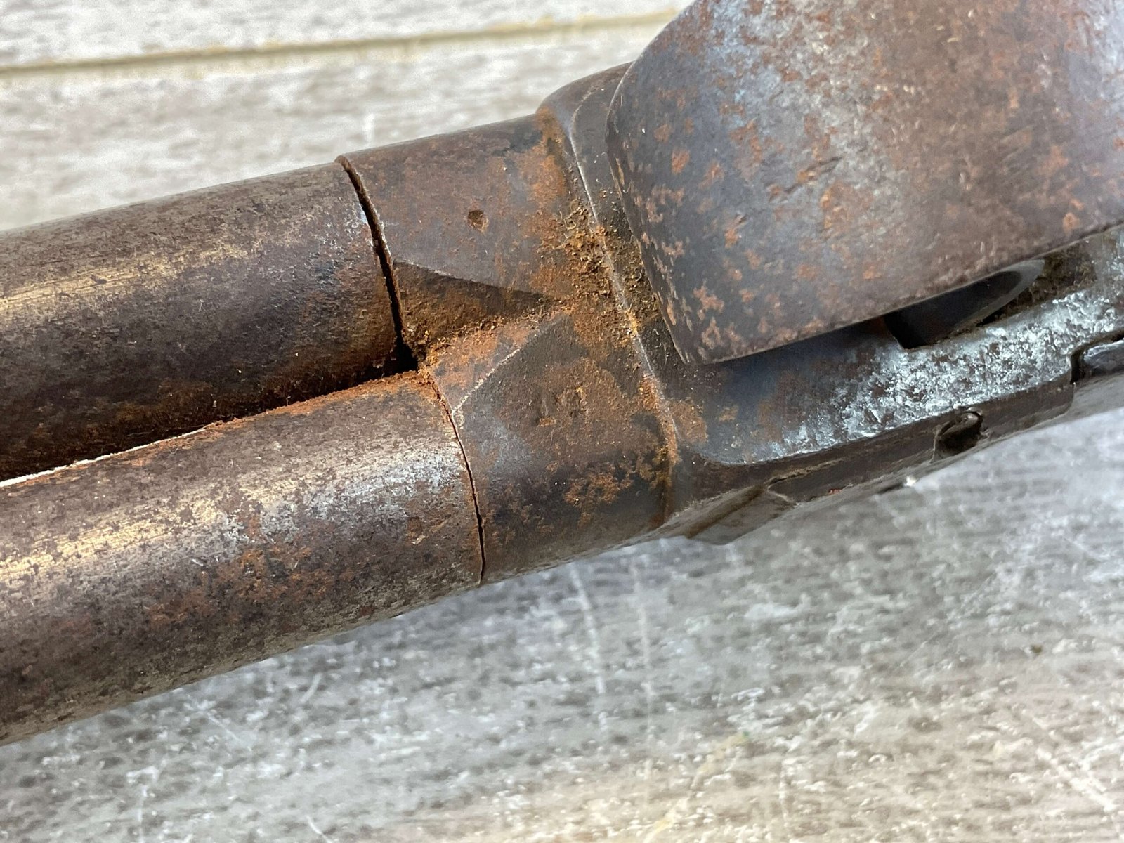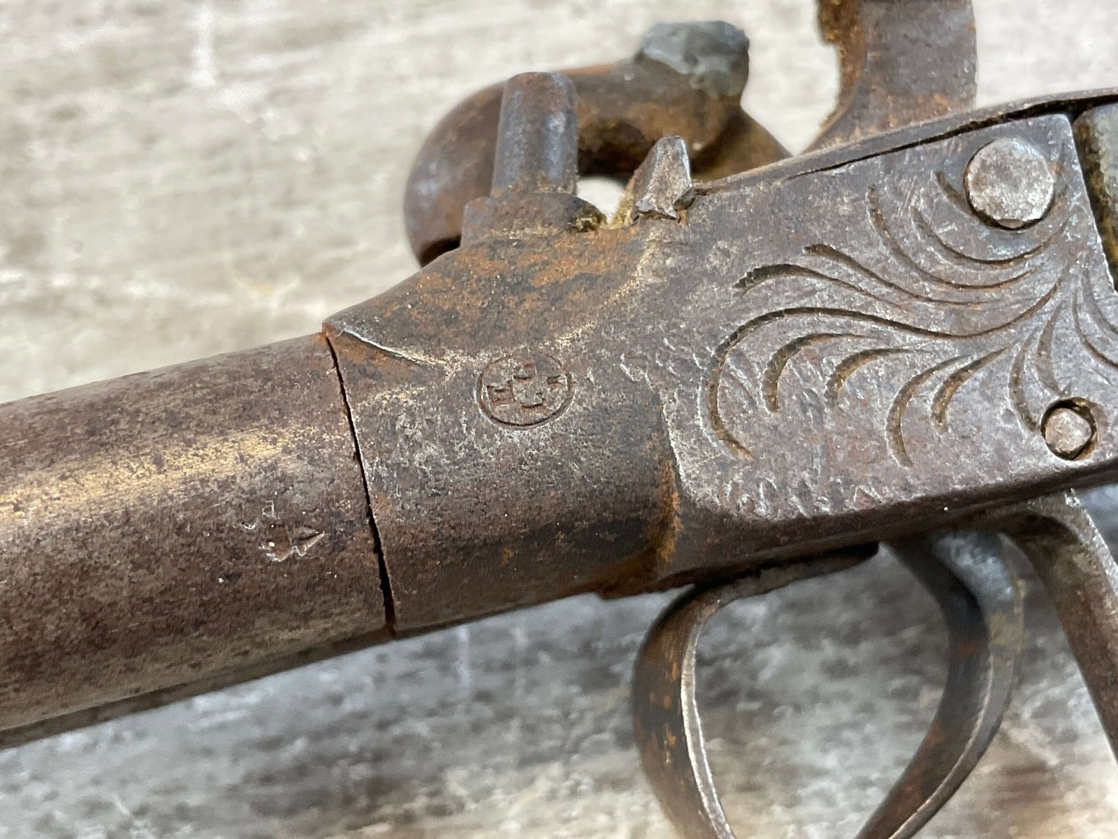 BELGIAN .36 CAL DOUBLE BARREL PERCUSSION PISTOL #NSN, .36 CAL, 3.5″ DOUBLE BARREL, RUSTY BORE, FINISH W/PITTING & LIGHT RUST, SMOOTH HARDWOOD GRIP WHICH IS LOOSE, ONE HAMMER BROKEN, DOUBLE TRIGGER, NEED SOME TLC, CONDITION AS SHOWN IN PICTURES, FROM THE JAMES EARL JONES “FAVORITES” COLLECTION W/ CERTIFICATE OF AUTHENTICITY.