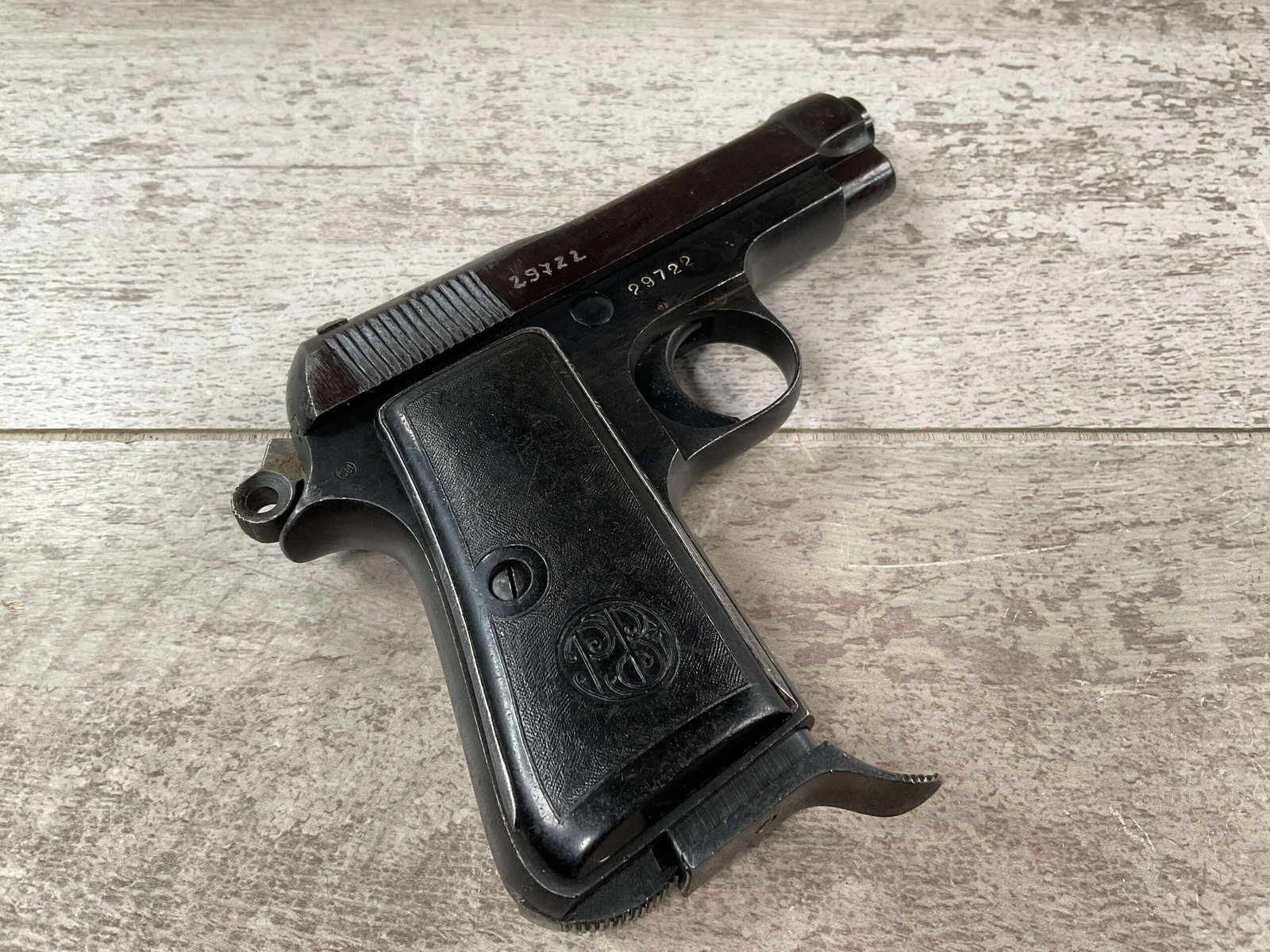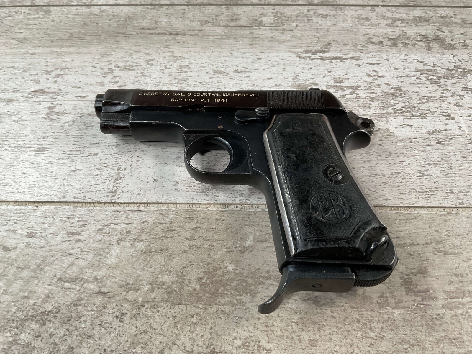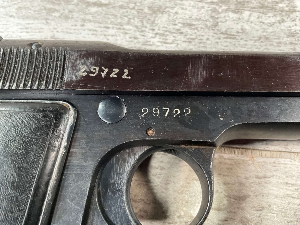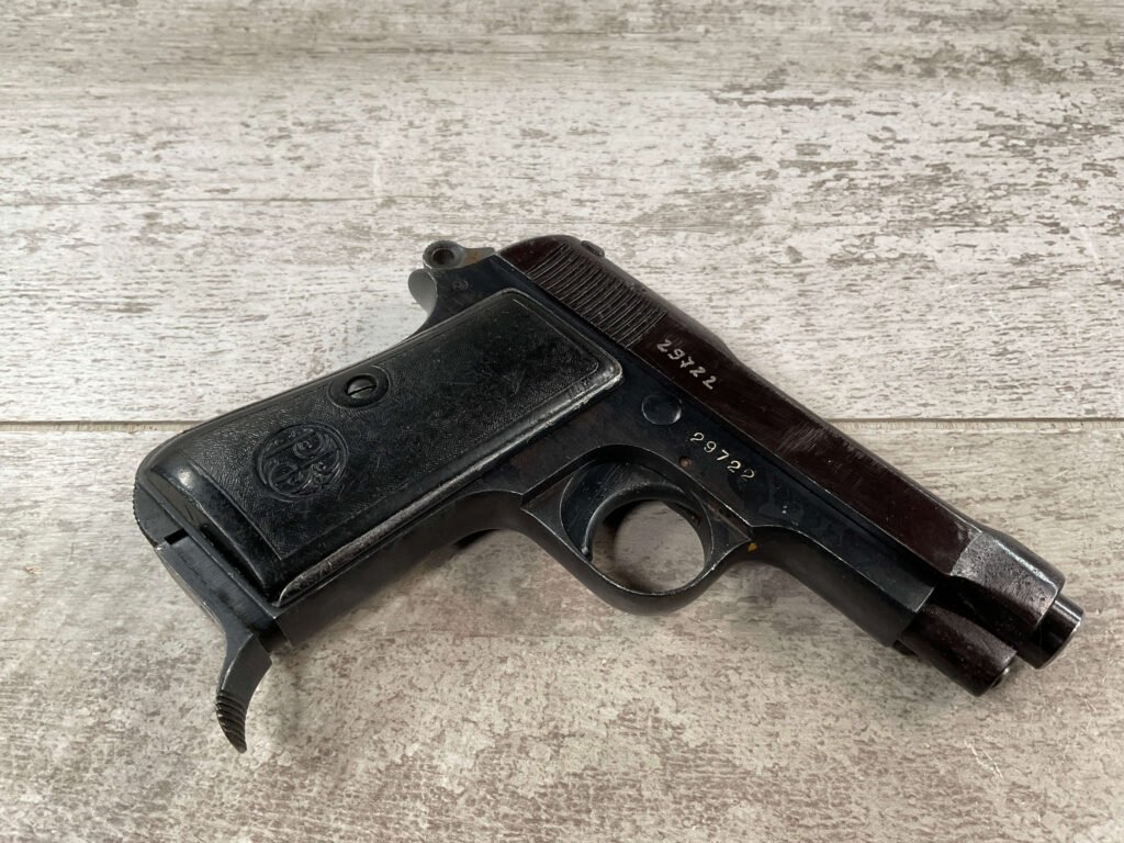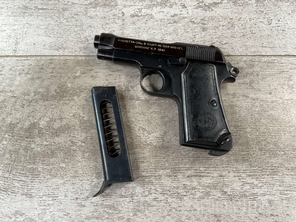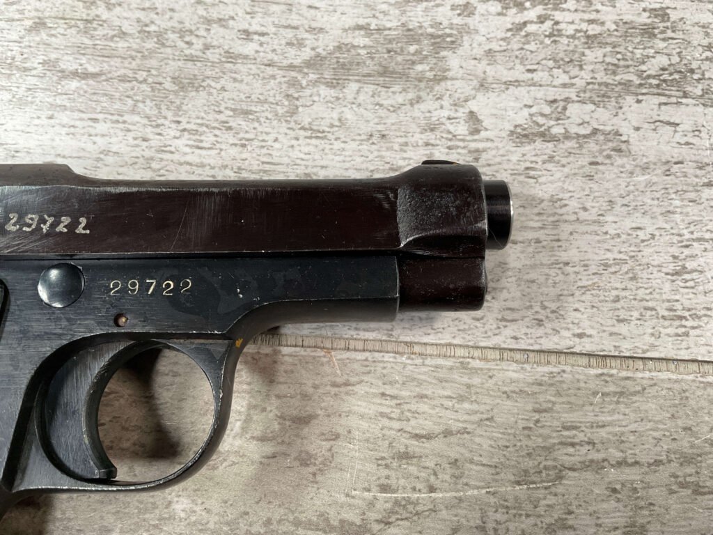 BERETTA 1934 380 ACP SEMI AUTO PISTOL #29722, REBLUE OVER SOME LIGHT PITTIN, VG ORIGINAL PLASTIC GRIPS, POST WAR MARKED MAGAZINE, 3.25″ BARREL, 1941 DATED, MECHANICALLY FINE, MATCHING SERIAL ON FRAME & SLIDE, PRICED TO SELL!!