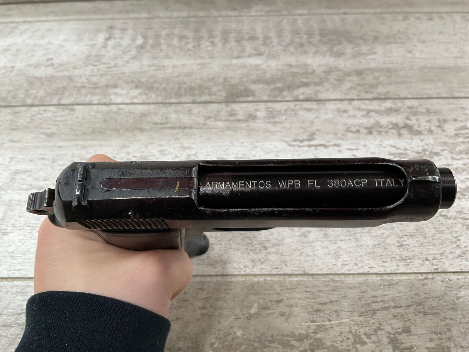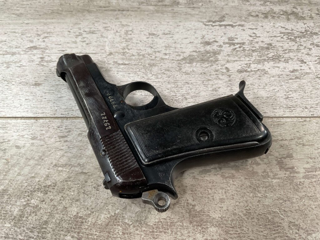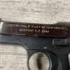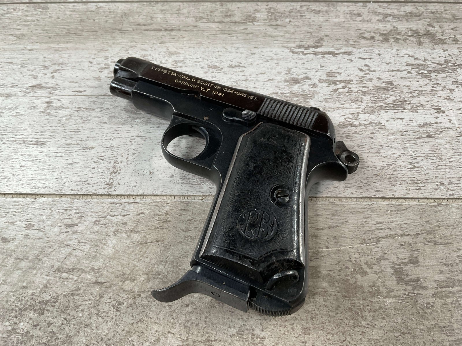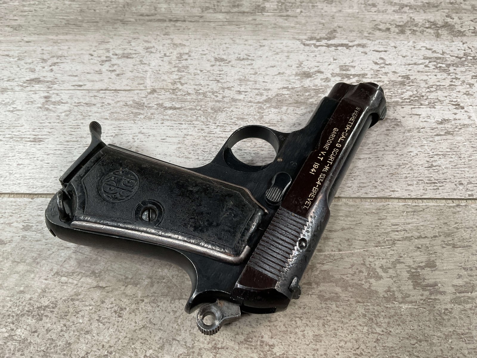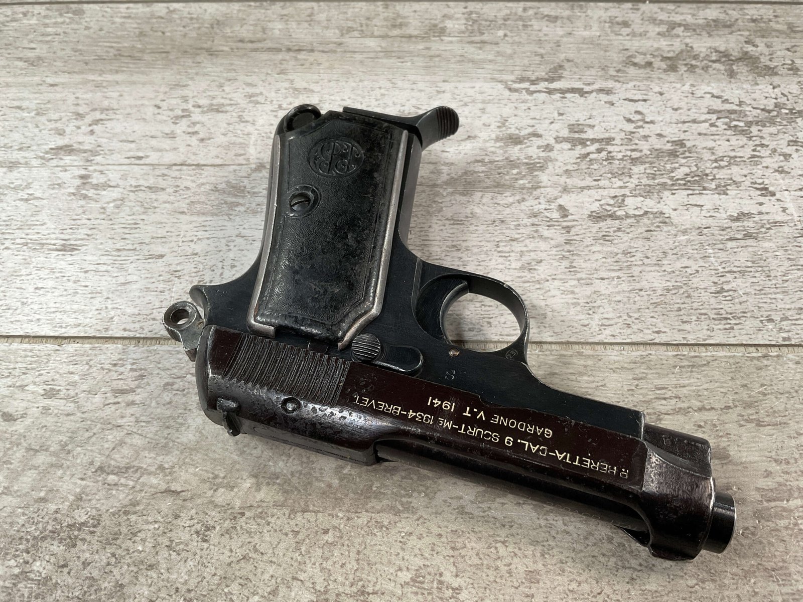 BERETTA 1934 380 ACP SEMI AUTO PISTOL #29722, REBLUE OVER SOME LIGHT PITTIN, VG ORIGINAL PLASTIC GRIPS, POST WAR MARKED MAGAZINE, 3.25″ BARREL, 1941 DATED, MECHANICALLY FINE, MATCHING SERIAL ON FRAME & SLIDE, PRICED TO SELL!!