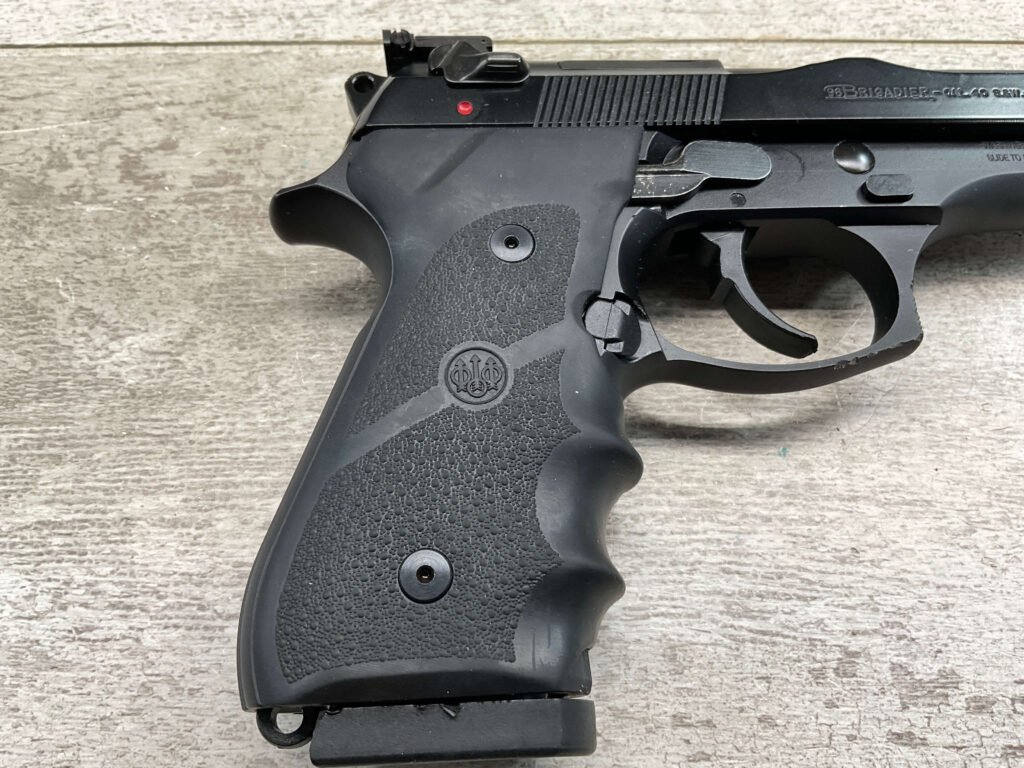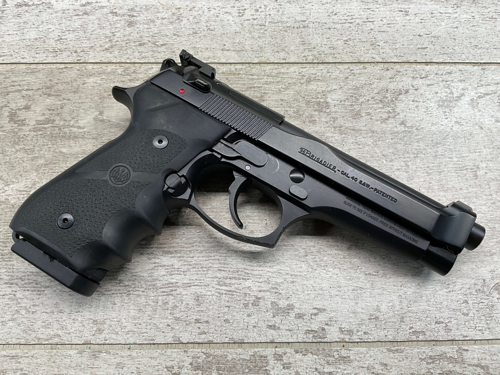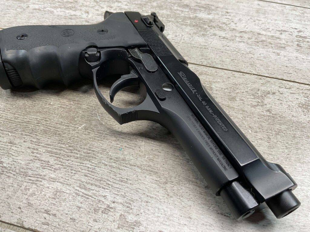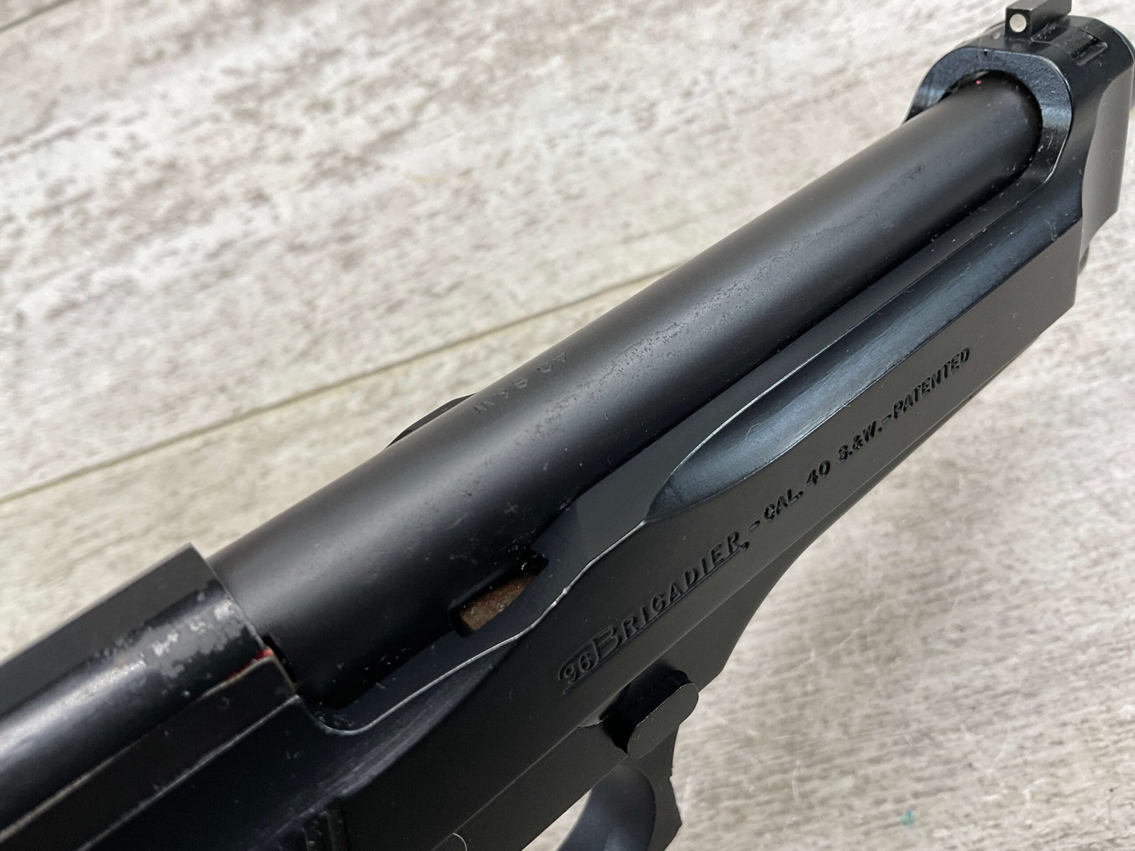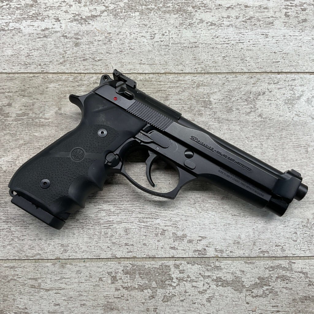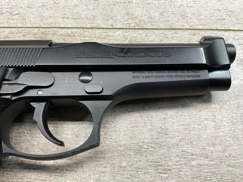 BERETTA 96 BRIGADIER .40 S&W SEMI AUTO PISTOL #BER435561, 4.9″ BARREL, WRAPAROUND RUBBER GRIPS, 3-DOT SIGHTS, BRUNITON MATTE BLACK FINISH, SAFETY DE-COCKER, 1-11 ROUND MAGAZINE W/DISCOLORATION AREAS, LIGHT SPOTS ON RIGHT SIDE OF BARREL, A COUPLE OF “USE MARKS” ON TRIGGER GUARD,