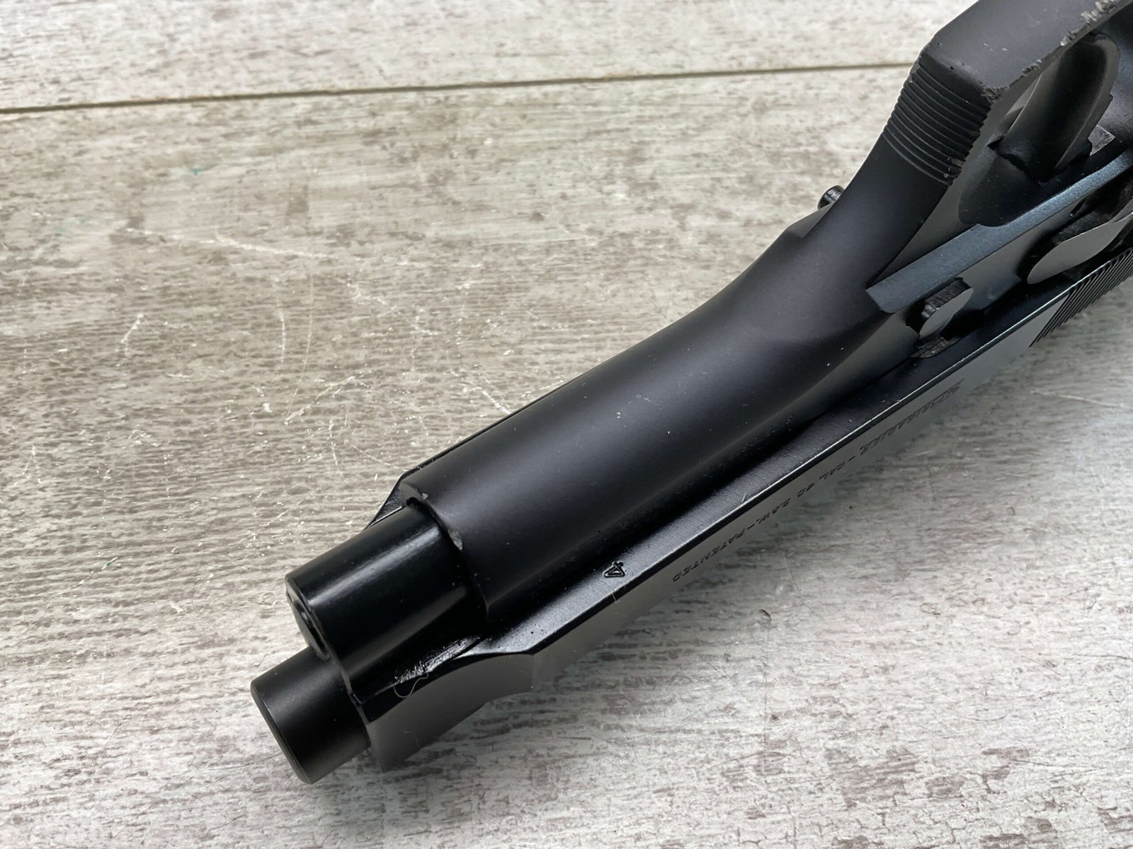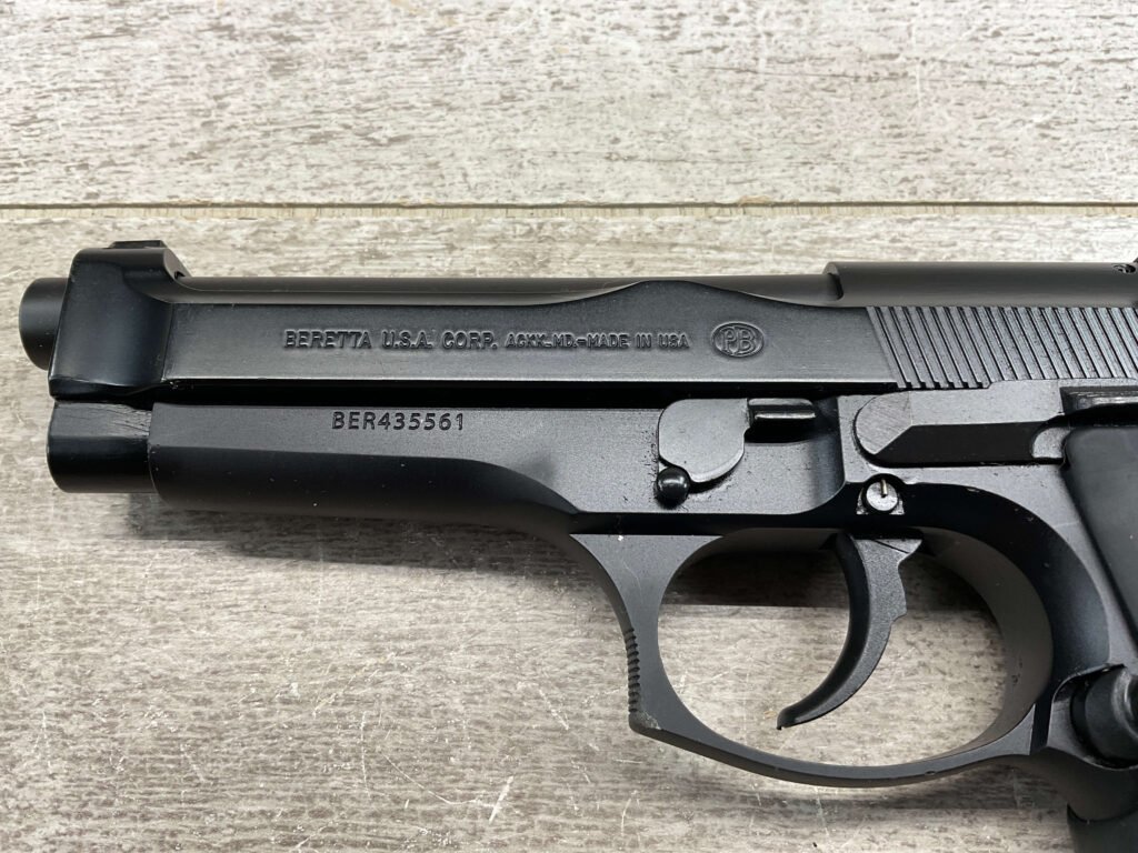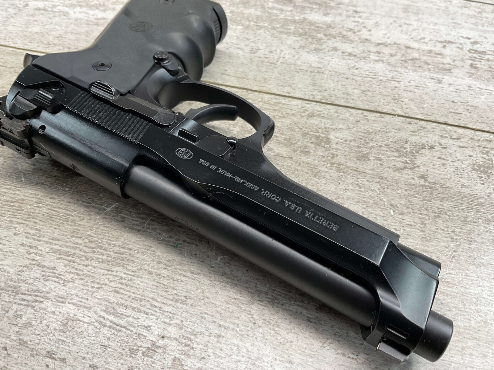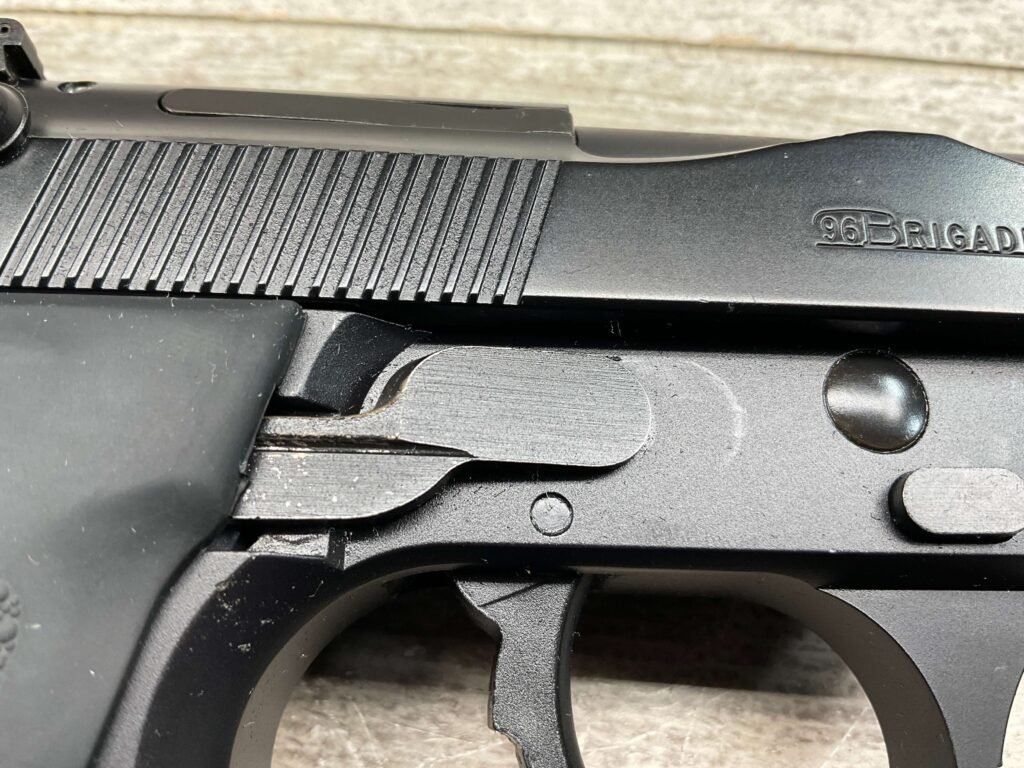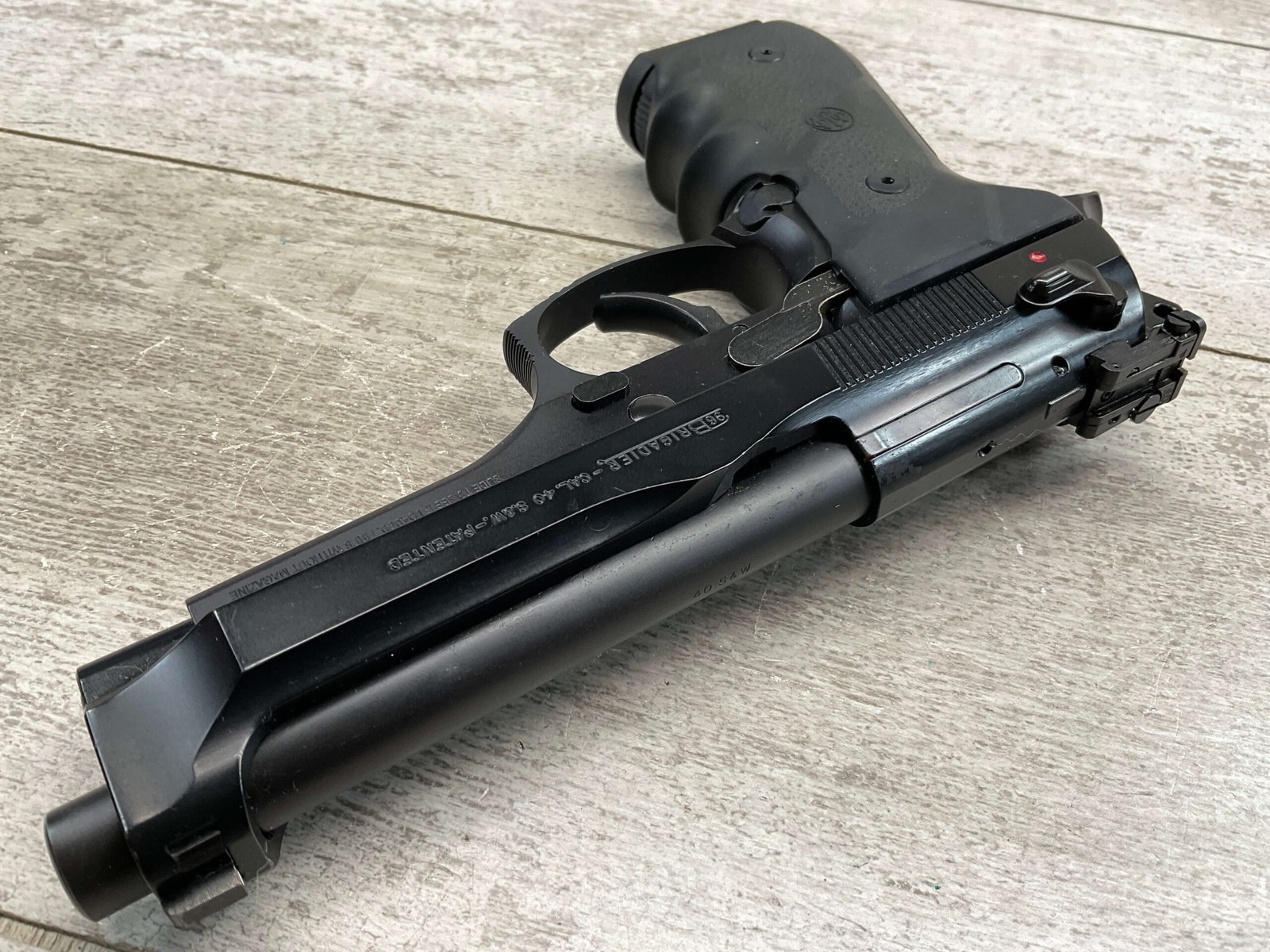 BERETTA 96 BRIGADIER .40 S&W SEMI AUTO PISTOL #BER435561, 4.9″ BARREL, WRAPAROUND RUBBER GRIPS, 3-DOT SIGHTS, BRUNITON MATTE BLACK FINISH, SAFETY DE-COCKER, 1-11 ROUND MAGAZINE W/DISCOLORATION AREAS, LIGHT SPOTS ON RIGHT SIDE OF BARREL, A COUPLE OF “USE MARKS” ON TRIGGER GUARD,