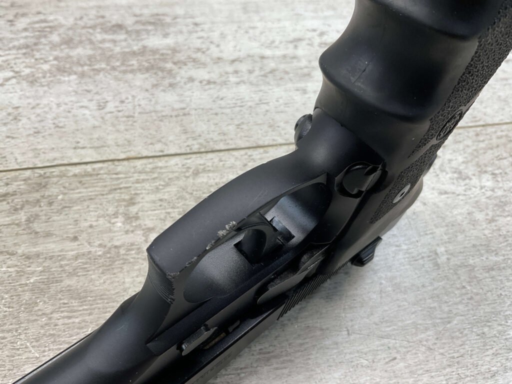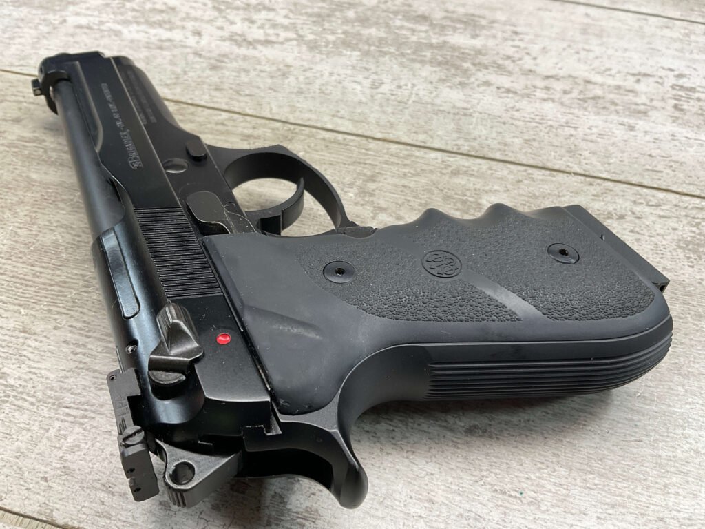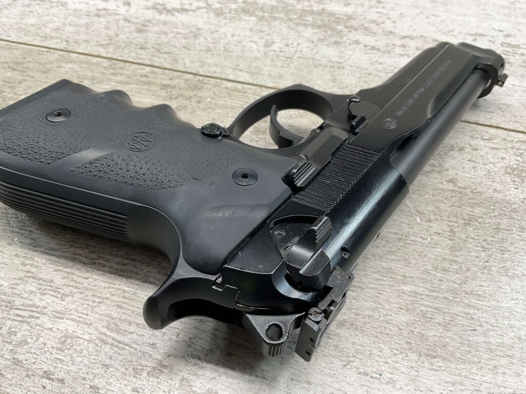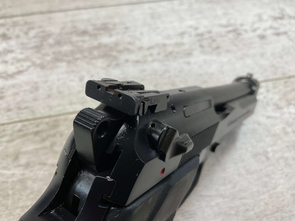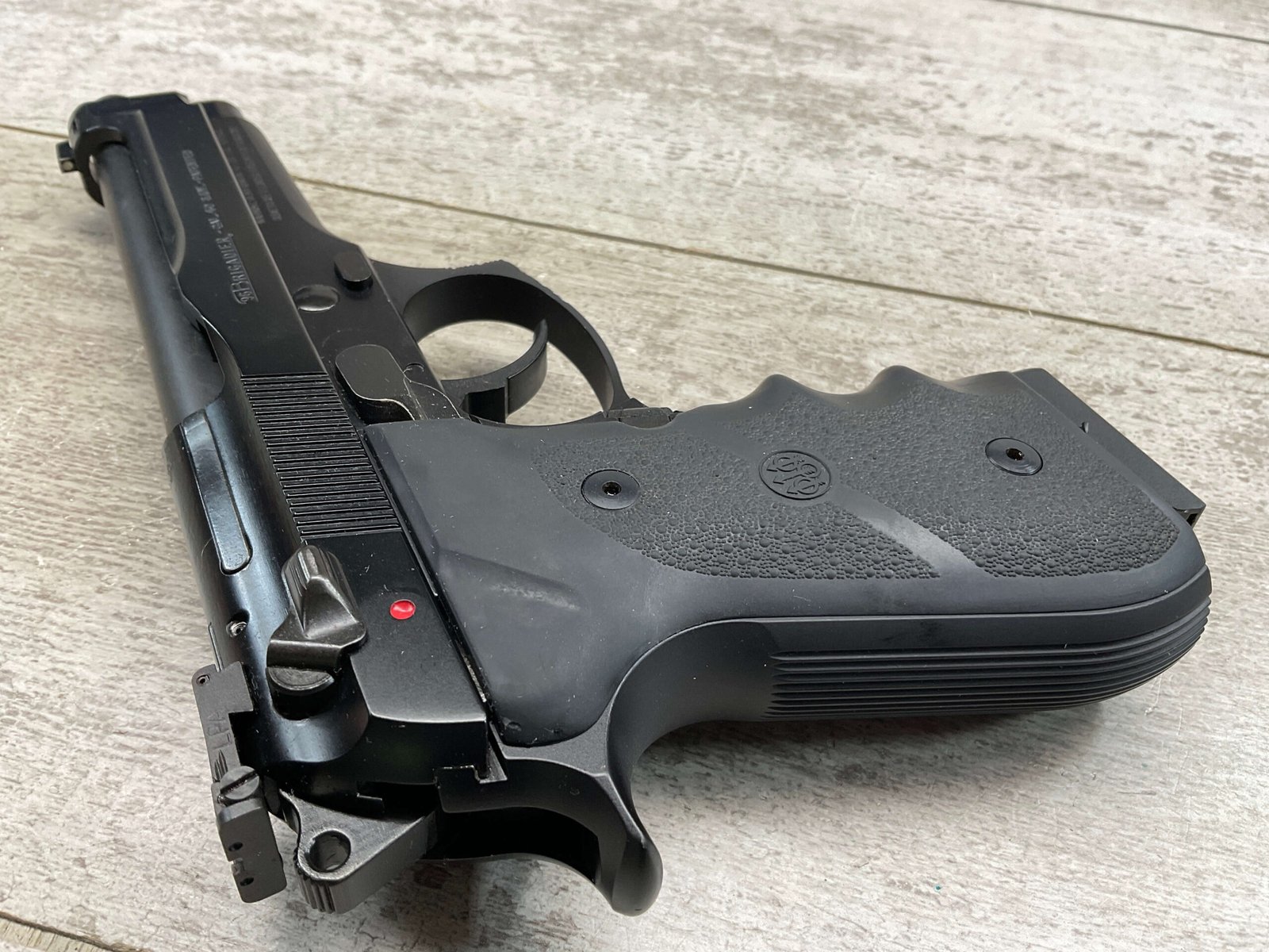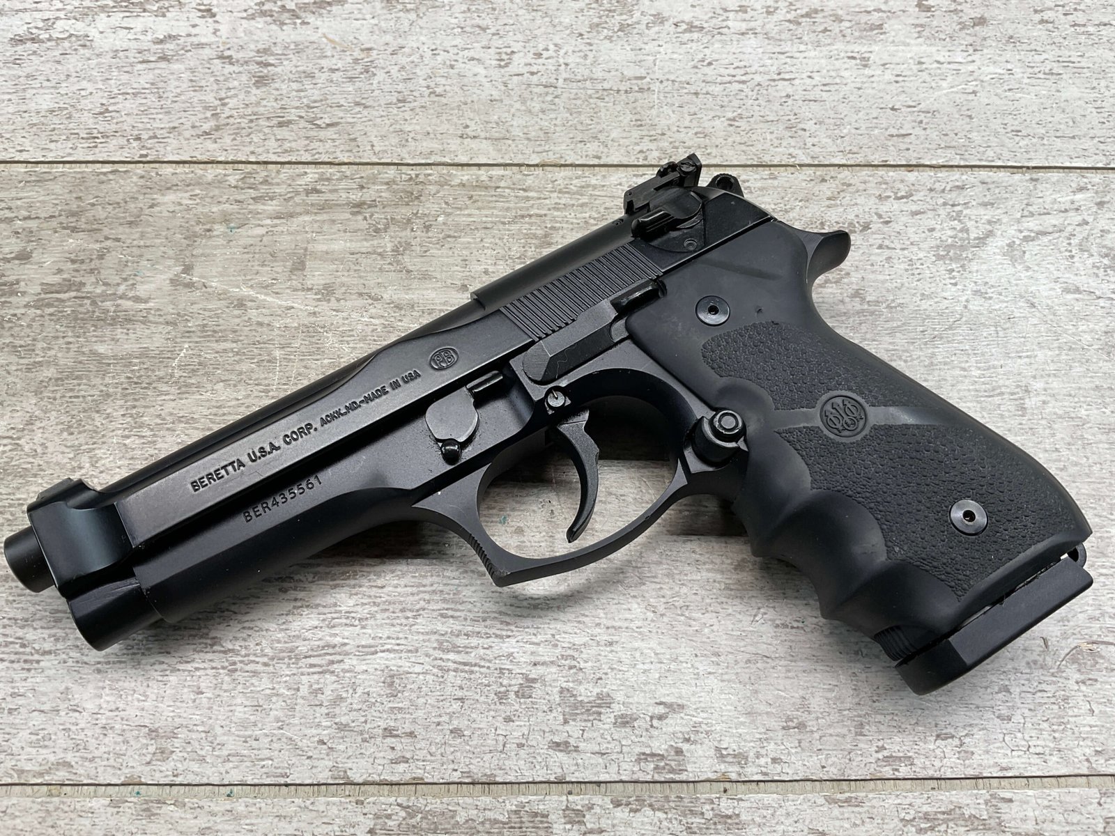 BERETTA 96 BRIGADIER .40 S&W SEMI AUTO PISTOL #BER435561, 4.9″ BARREL, WRAPAROUND RUBBER GRIPS, 3-DOT SIGHTS, BRUNITON MATTE BLACK FINISH, SAFETY DE-COCKER, 1-11 ROUND MAGAZINE W/DISCOLORATION AREAS, LIGHT SPOTS ON RIGHT SIDE OF BARREL, A COUPLE OF “USE MARKS” ON TRIGGER GUARD,