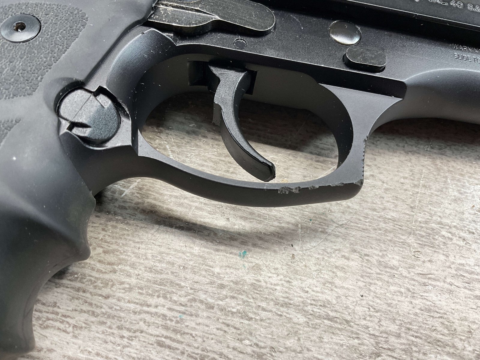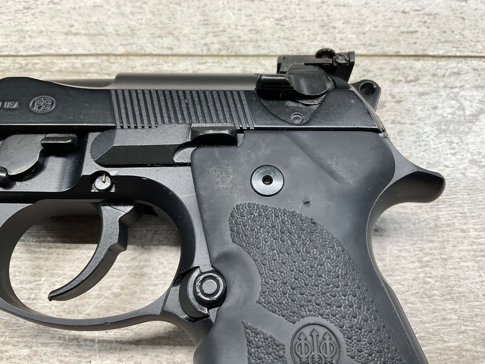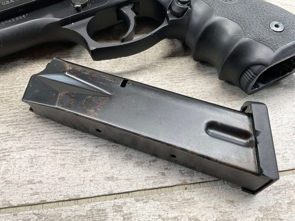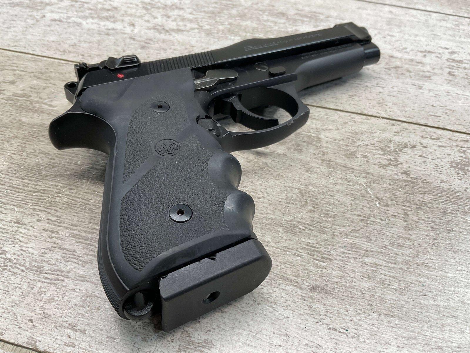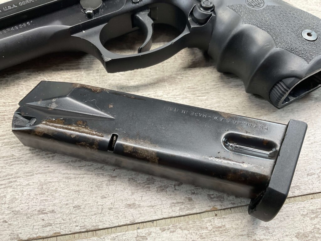 BERETTA 96 BRIGADIER .40 S&W SEMI AUTO PISTOL #BER435561, 4.9″ BARREL, WRAPAROUND RUBBER GRIPS, 3-DOT SIGHTS, BRUNITON MATTE BLACK FINISH, SAFETY DE-COCKER, 1-11 ROUND MAGAZINE W/DISCOLORATION AREAS, LIGHT SPOTS ON RIGHT SIDE OF BARREL, A COUPLE OF “USE MARKS” ON TRIGGER GUARD,