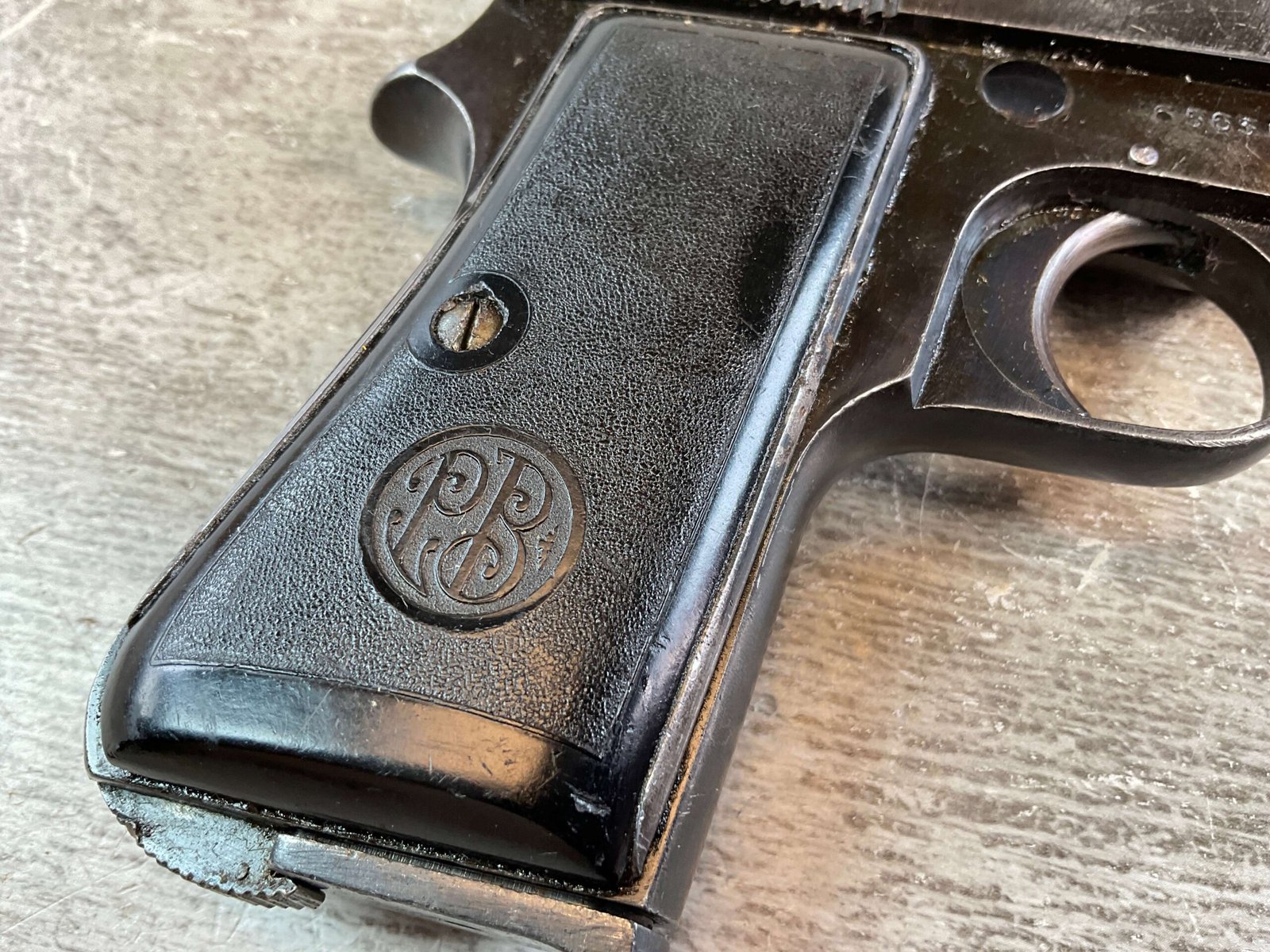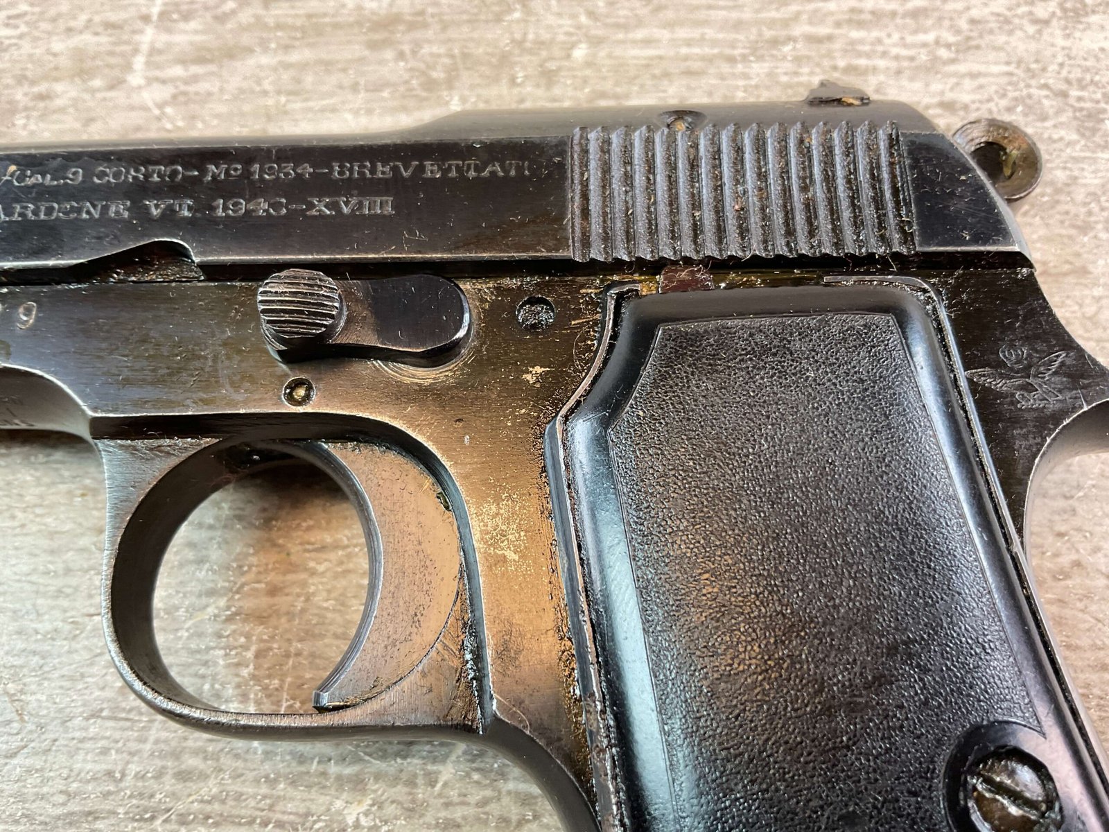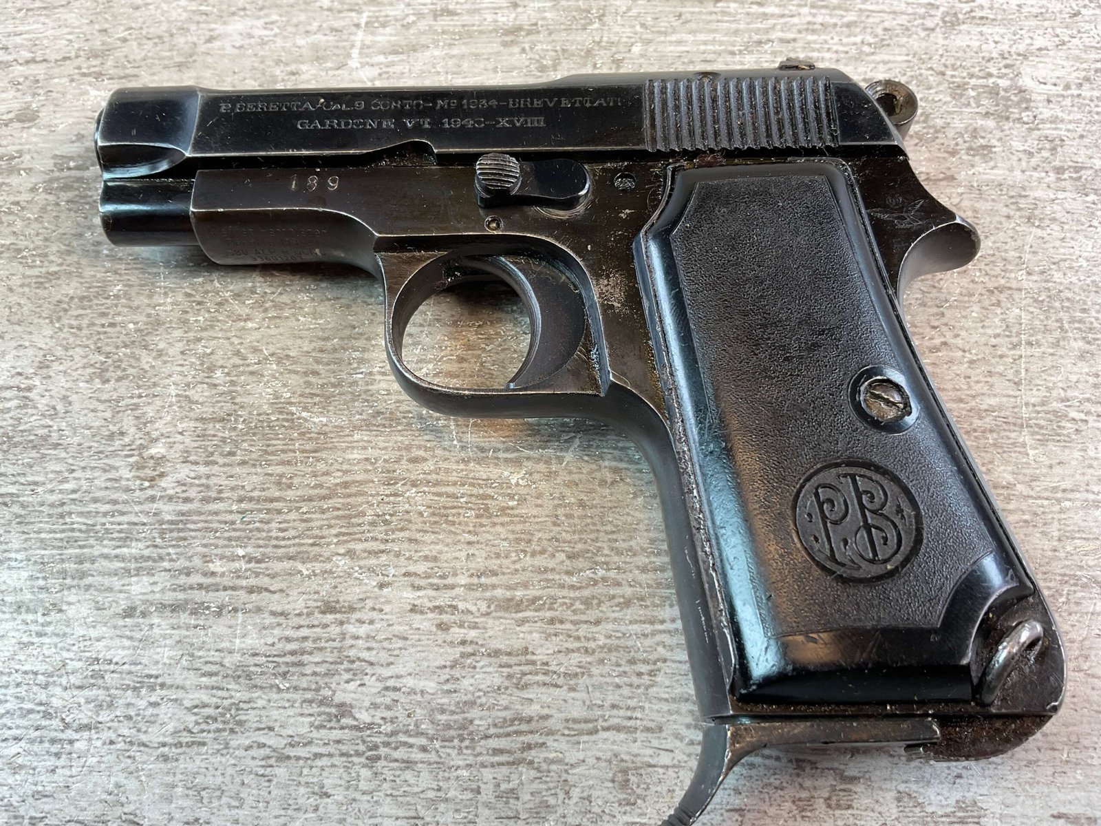 BERETTA M1934 .380 SEMI AUTO PISTOL, #656366, 3 1/8″ BBL, VG-EXC CONDITION, 1940 DATED, EAGLE/AM (AIR FORCE MARKED) STAMPED ON LEFT REAR FRAME, VG-EXC BLACK PLASTIC GRIPS, “R GUN” IMPORT ON UNDERSIDE OF FRAME IN FRONT OF TRIGGER GUARD, 1 ORIGINAL MAGAZINE, STRONG BORE, MECHANICALLY FINE.