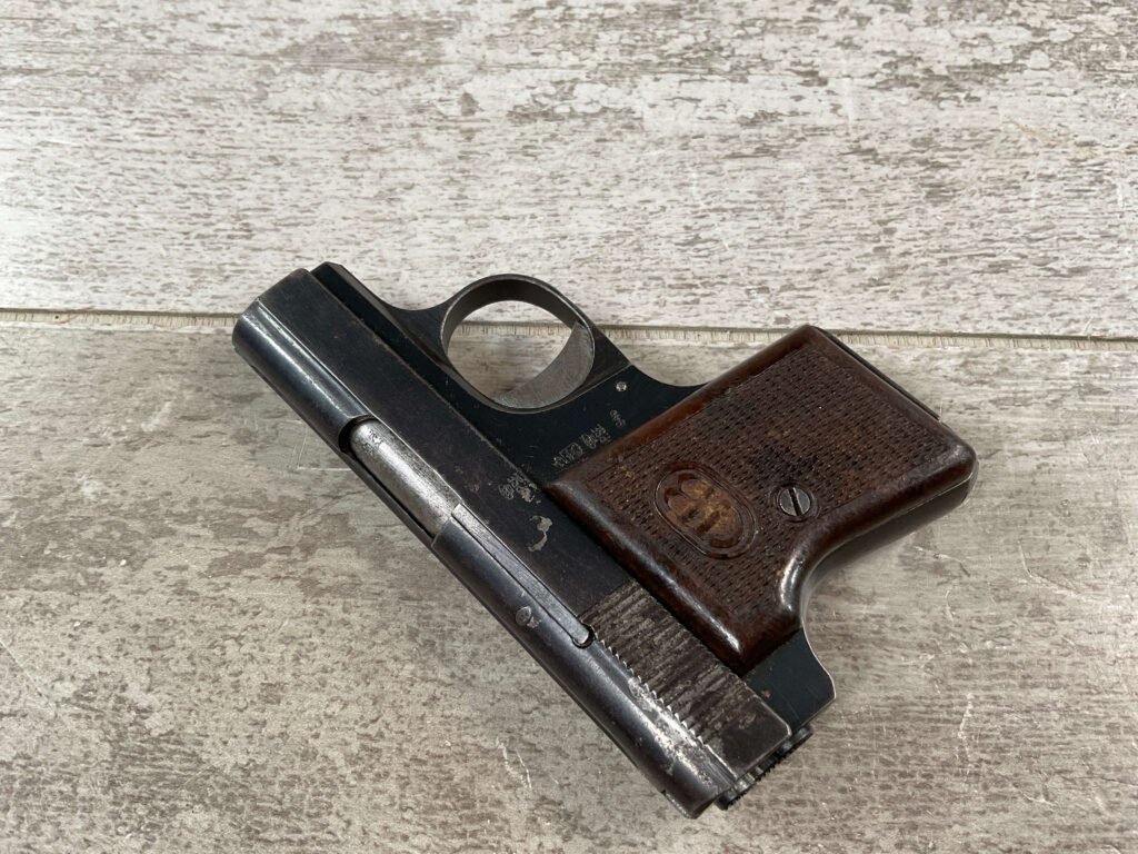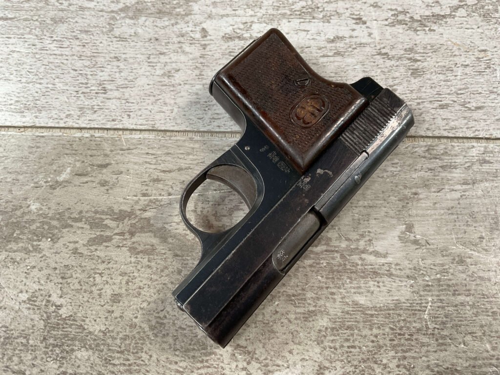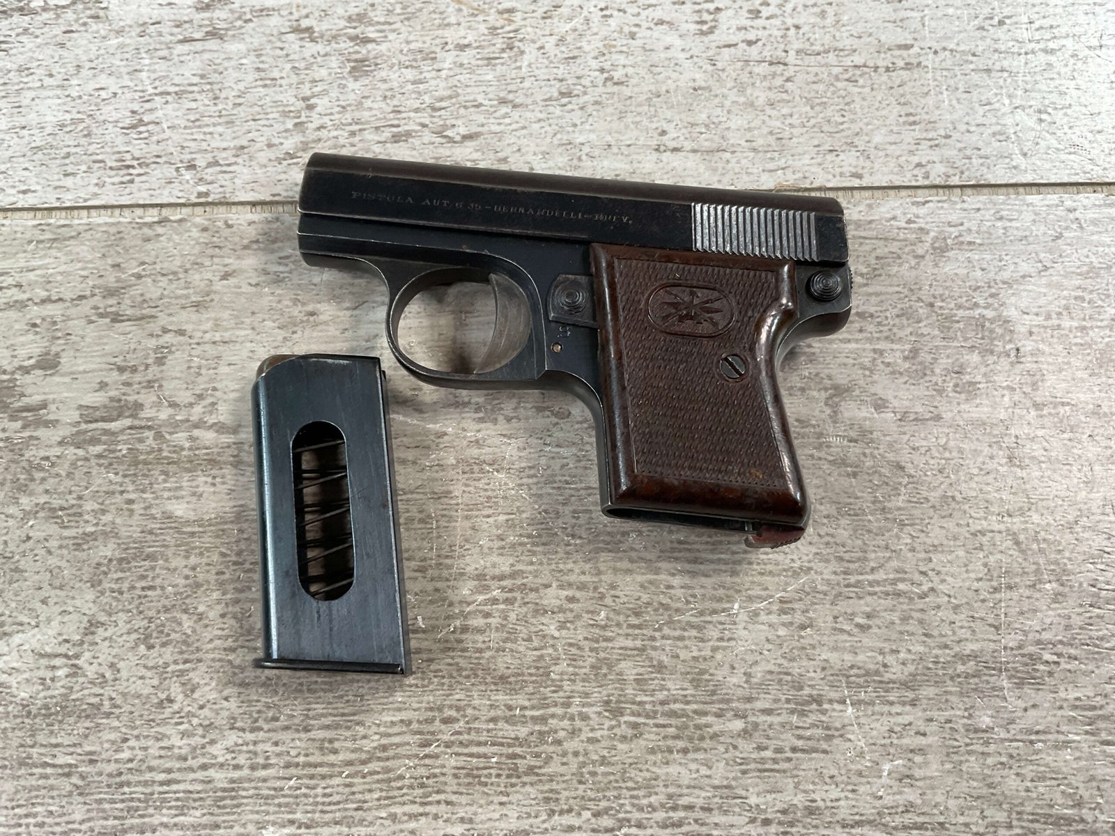 The Italian Bernardelli Vest Pocket Pistol is a compact, semi-automatic firearm chambered in .25 ACP, manufactured in 1946. Here’s a detailed and simplified description focusing on its features and condition: