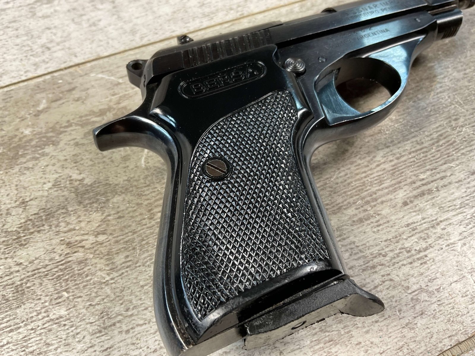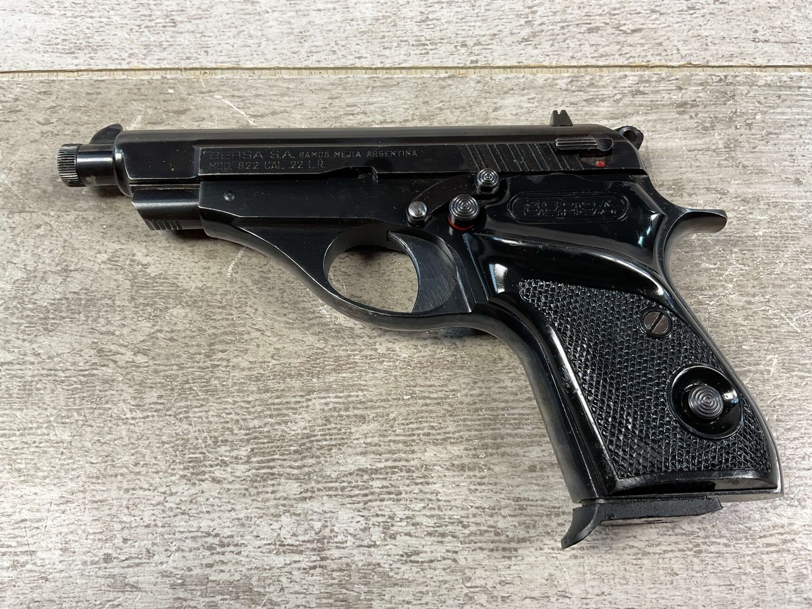 BERSA MODEL 622 .22LR SEMI AUTO PISTOL, FFLÂ #C58462, VG-EXC BLUE FINISH W/VERY LIGHTS USE MARKS, EXC BORE & RIFLING, 2-10 ROUND MAGAZINE, EXC BLACK PLASTIC CHECKERED GRIPS, SMOOTH ACTION, KNOWN AS AN ACCURATE SHOOTER, CONDITION AS SHOWN IN PICTURES