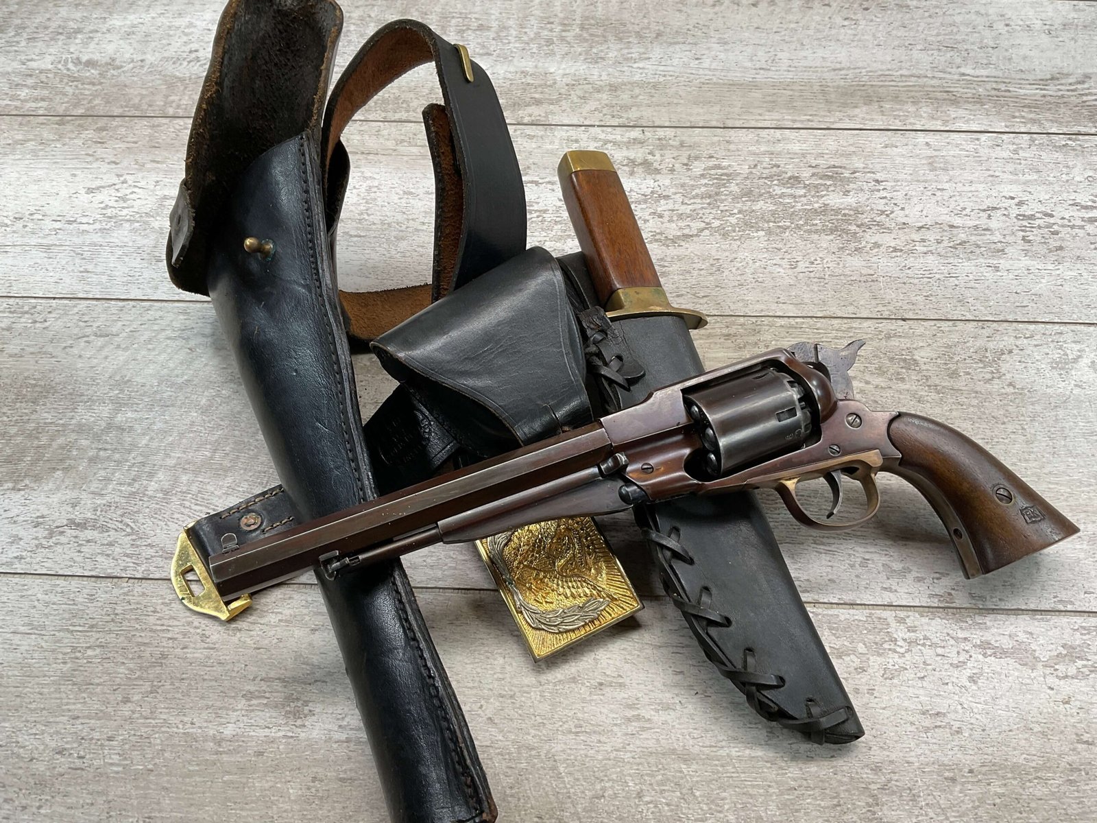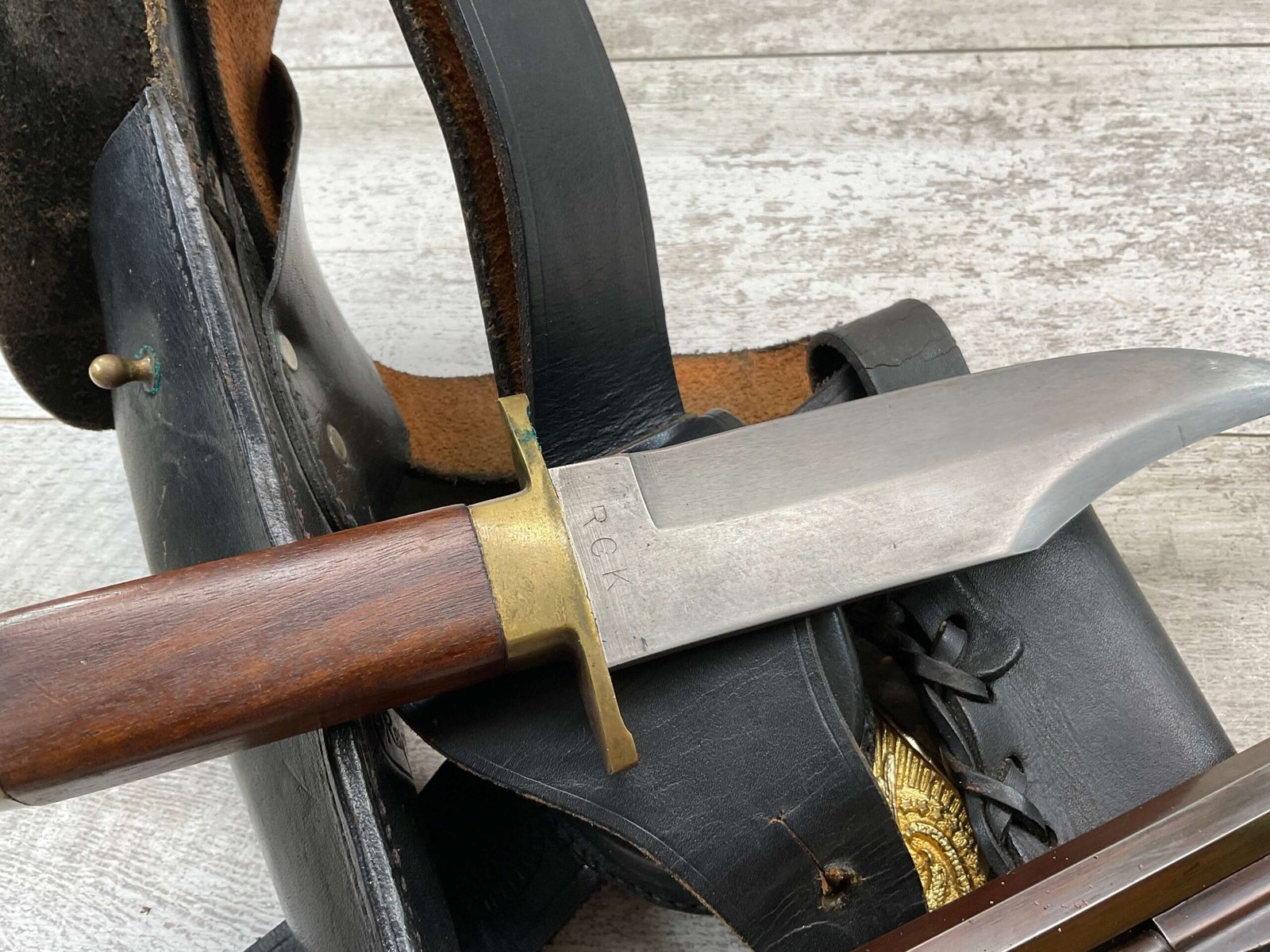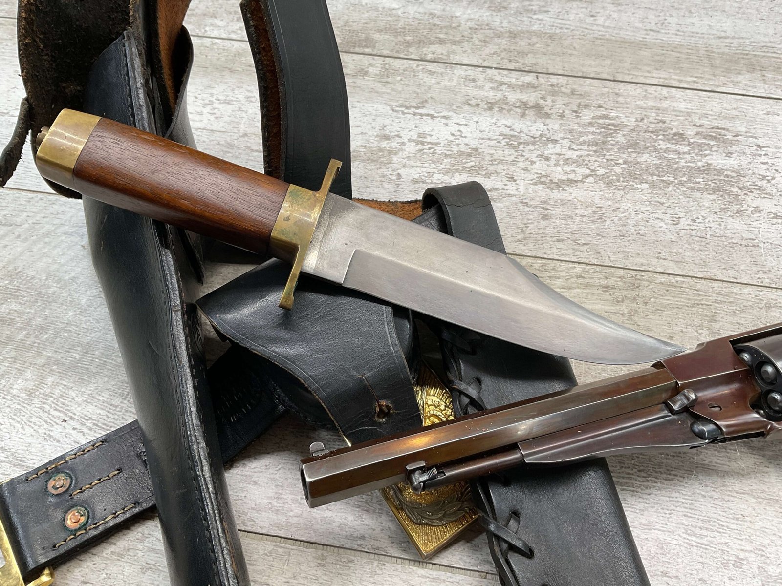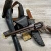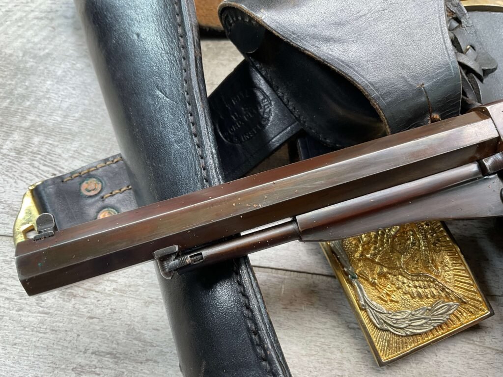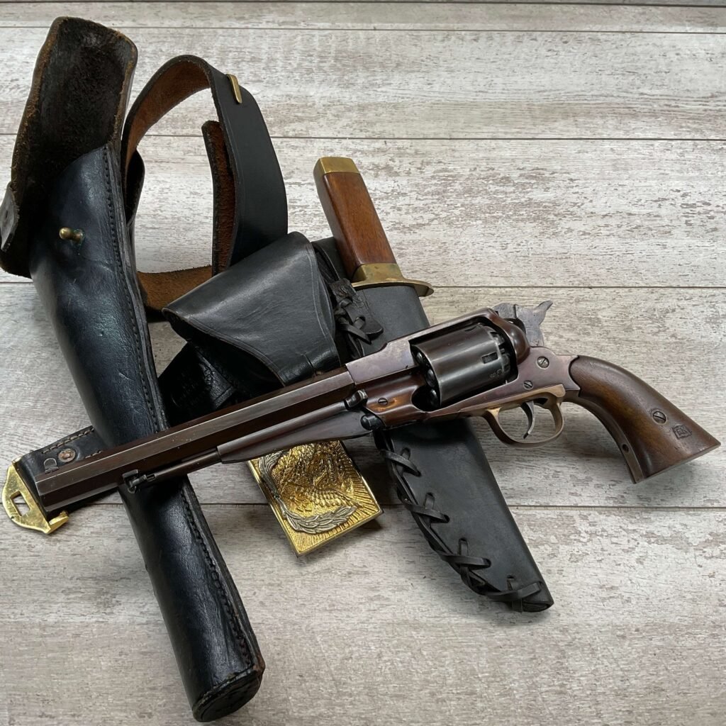 BLACK POWDER .45 CAL REVOLVER RIG #075659, 8″ BBL, BRITISH PROOFS, LEFT HANDED/CROSS DRAW BLACK REYES 7 1/2 HOLSTER, S.H. YOUNG & CO BLACK LEATHER BELT, CUSTOM HUNTING KNIFE & BLACK LEATHER SHEATH, RUST BROWN FINISH, EXC BORE & RIFLING, NO FFL NEEDED.