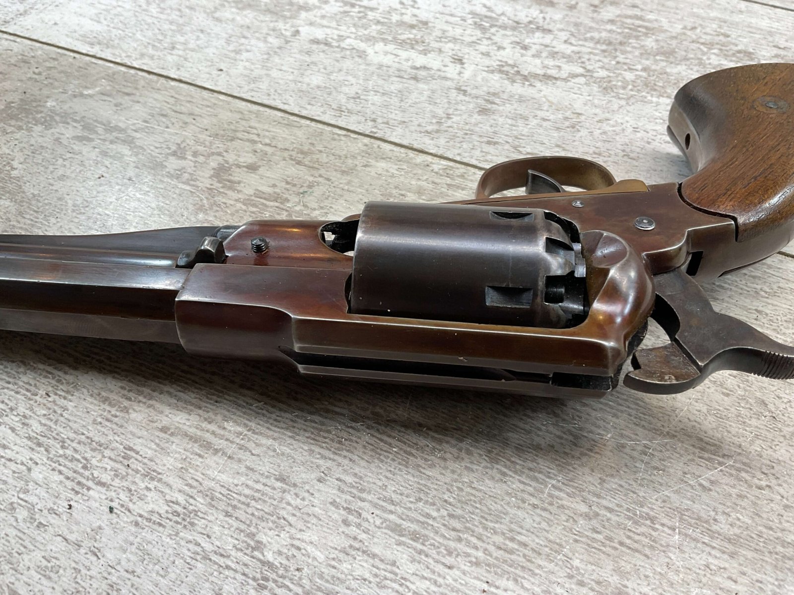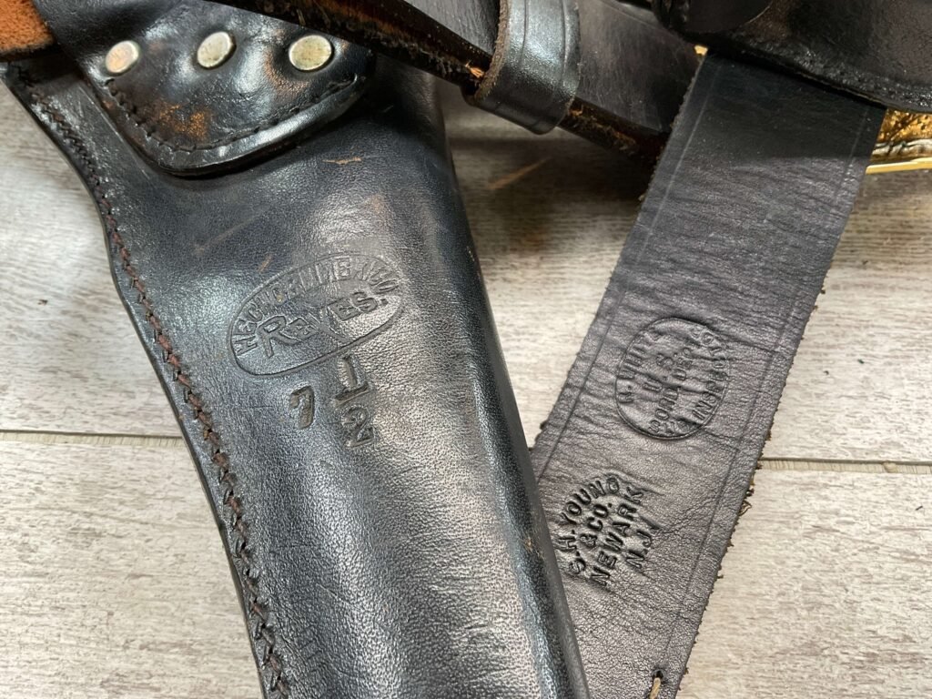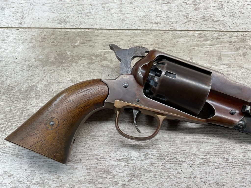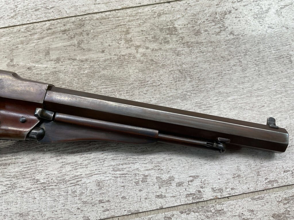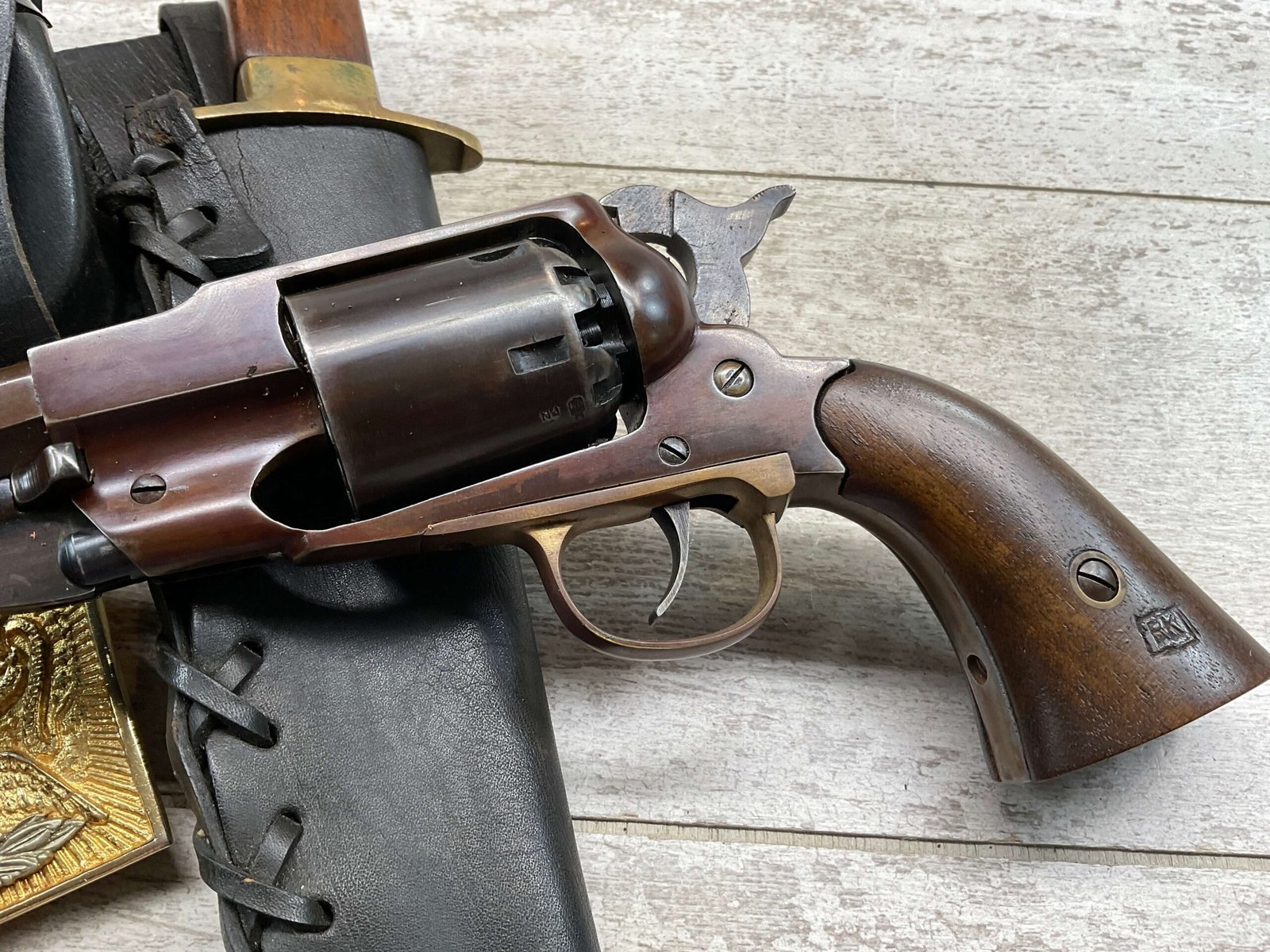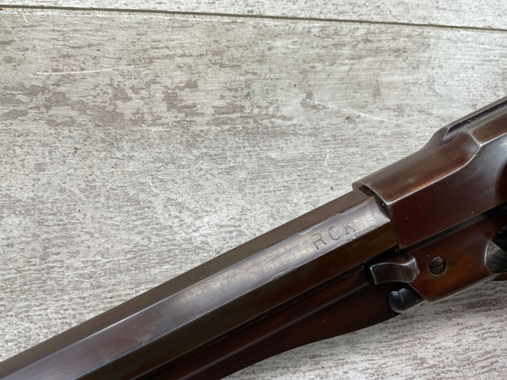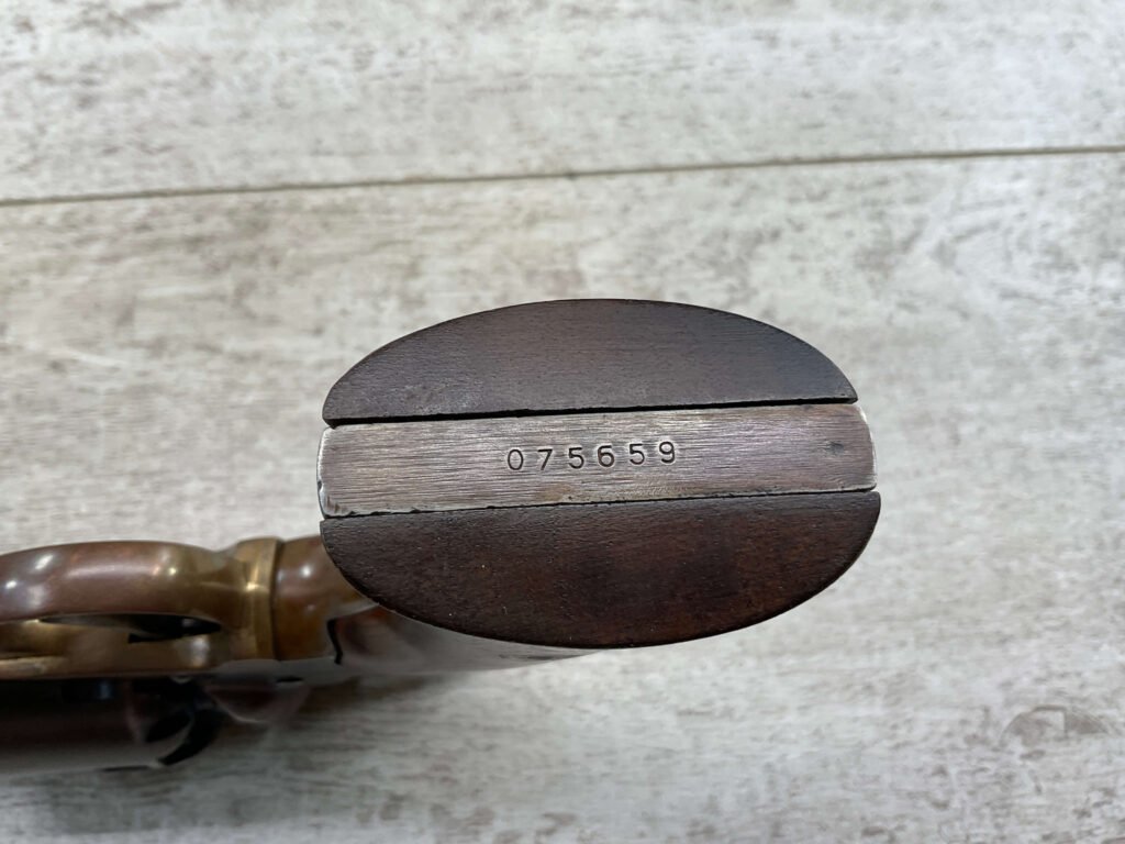 BLACK POWDER .45 CAL REVOLVER RIG #075659, 8″ BBL, BRITISH PROOFS, LEFT HANDED/CROSS DRAW BLACK REYES 7 1/2 HOLSTER, S.H. YOUNG & CO BLACK LEATHER BELT, CUSTOM HUNTING KNIFE & BLACK LEATHER SHEATH, RUST BROWN FINISH, EXC BORE & RIFLING, NO FFL NEEDED.