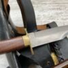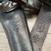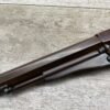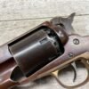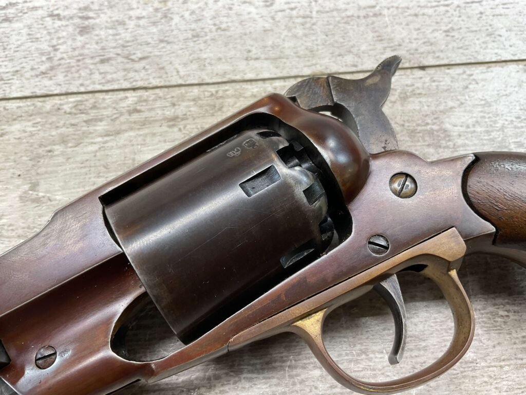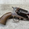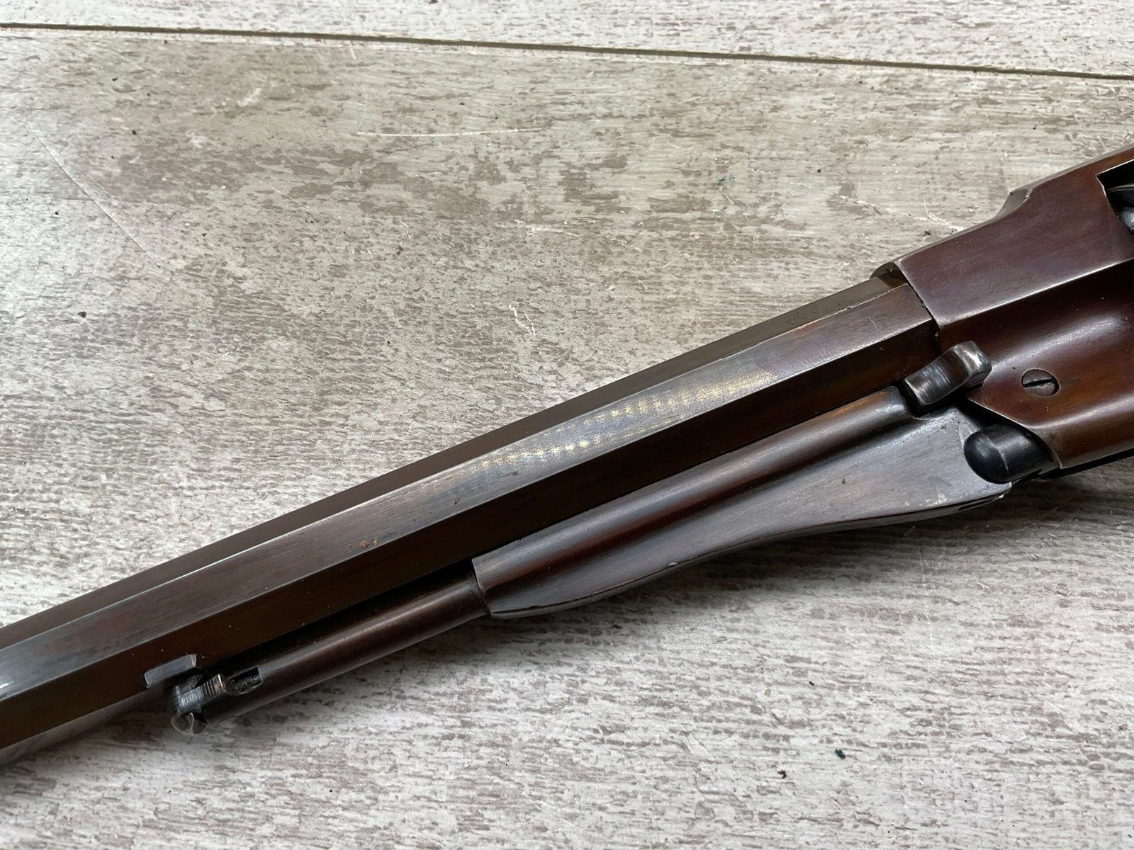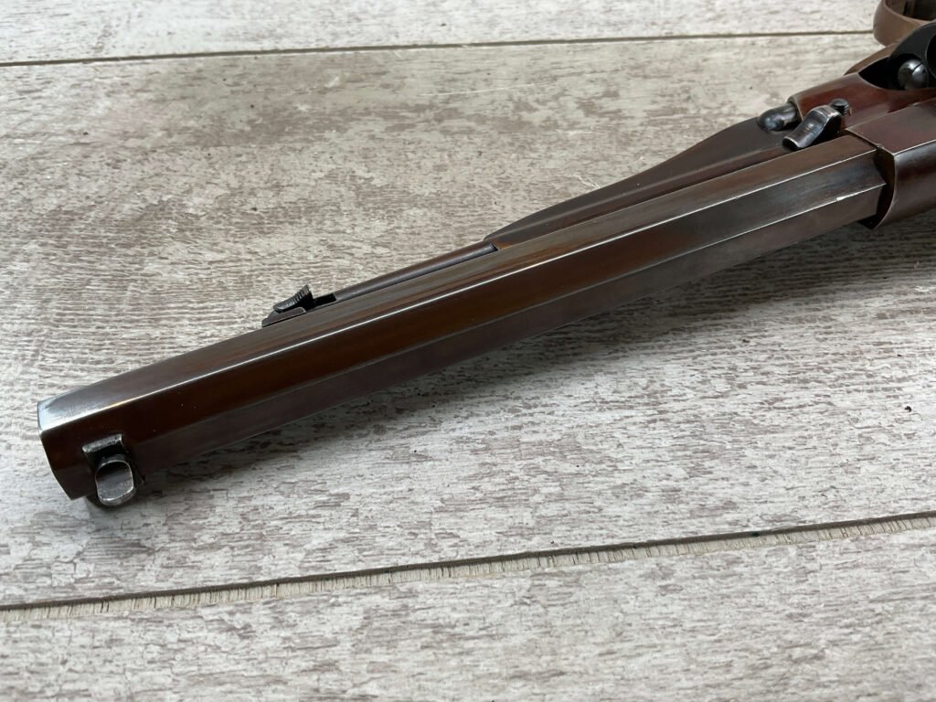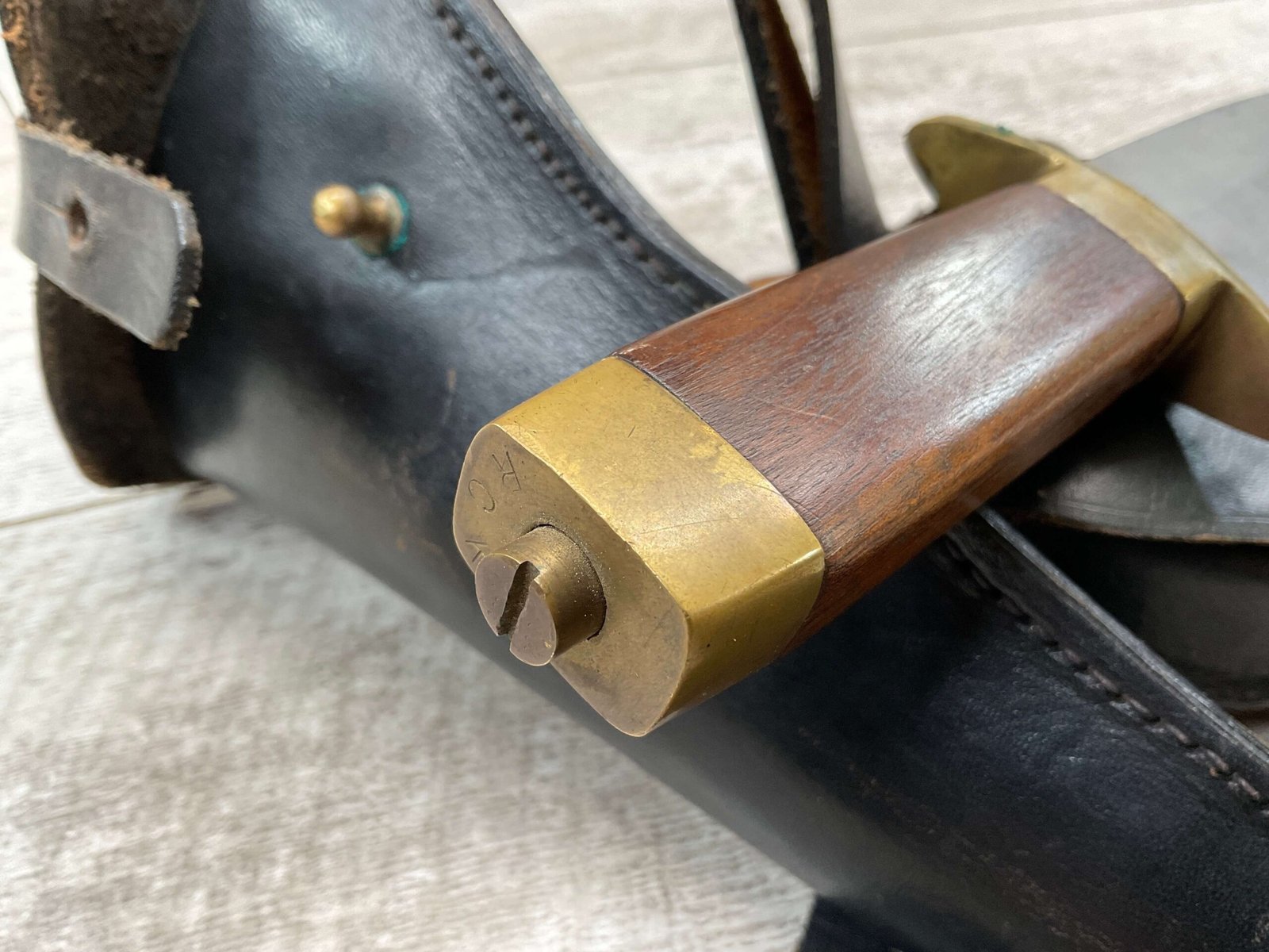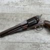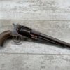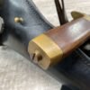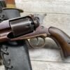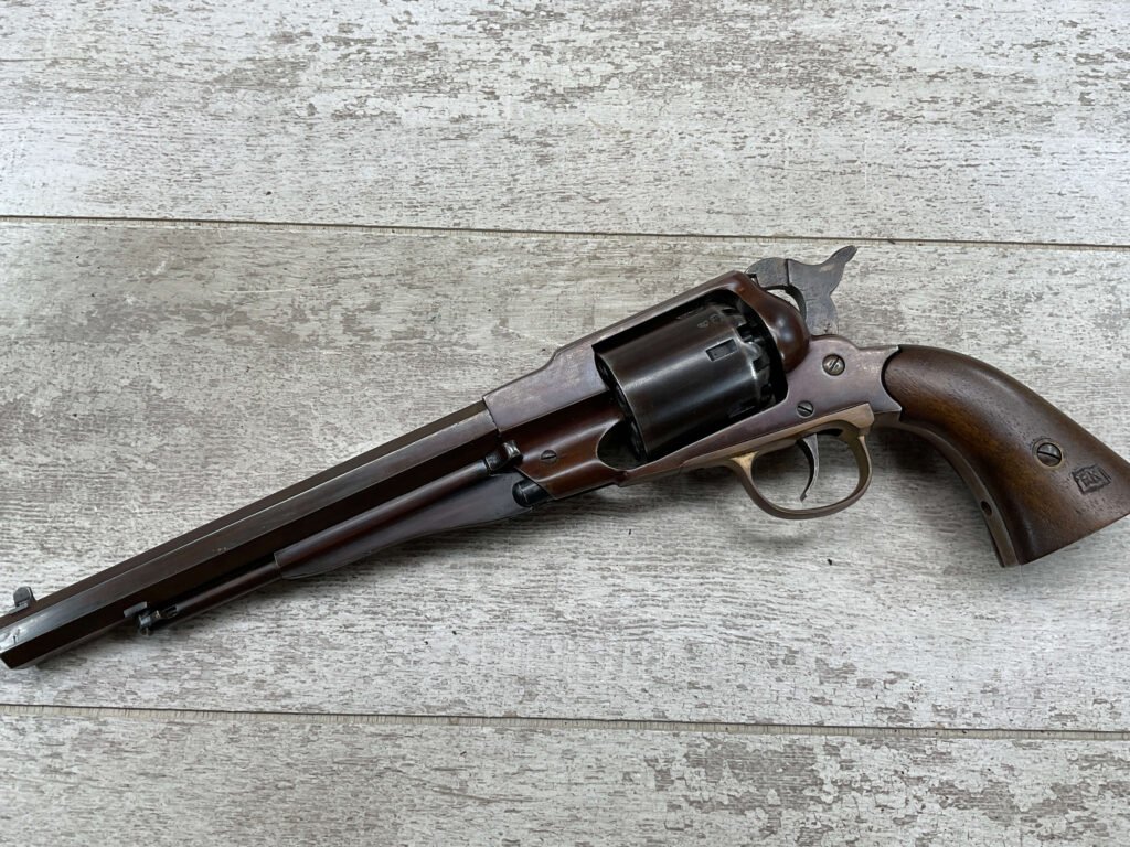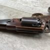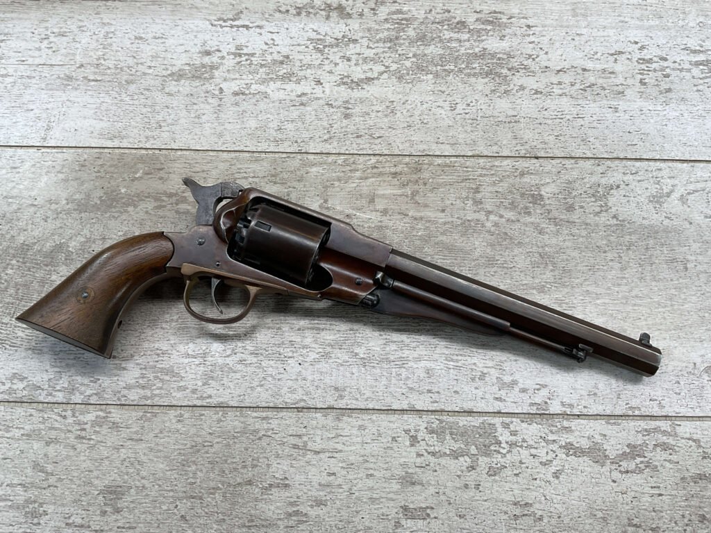 BLACK POWDER .45 CAL REVOLVER RIG #075659, 8″ BBL, BRITISH PROOFS, LEFT HANDED/CROSS DRAW BLACK REYES 7 1/2 HOLSTER, S.H. YOUNG & CO BLACK LEATHER BELT, CUSTOM HUNTING KNIFE & BLACK LEATHER SHEATH, RUST BROWN FINISH, EXC BORE & RIFLING, NO FFL NEEDED.