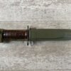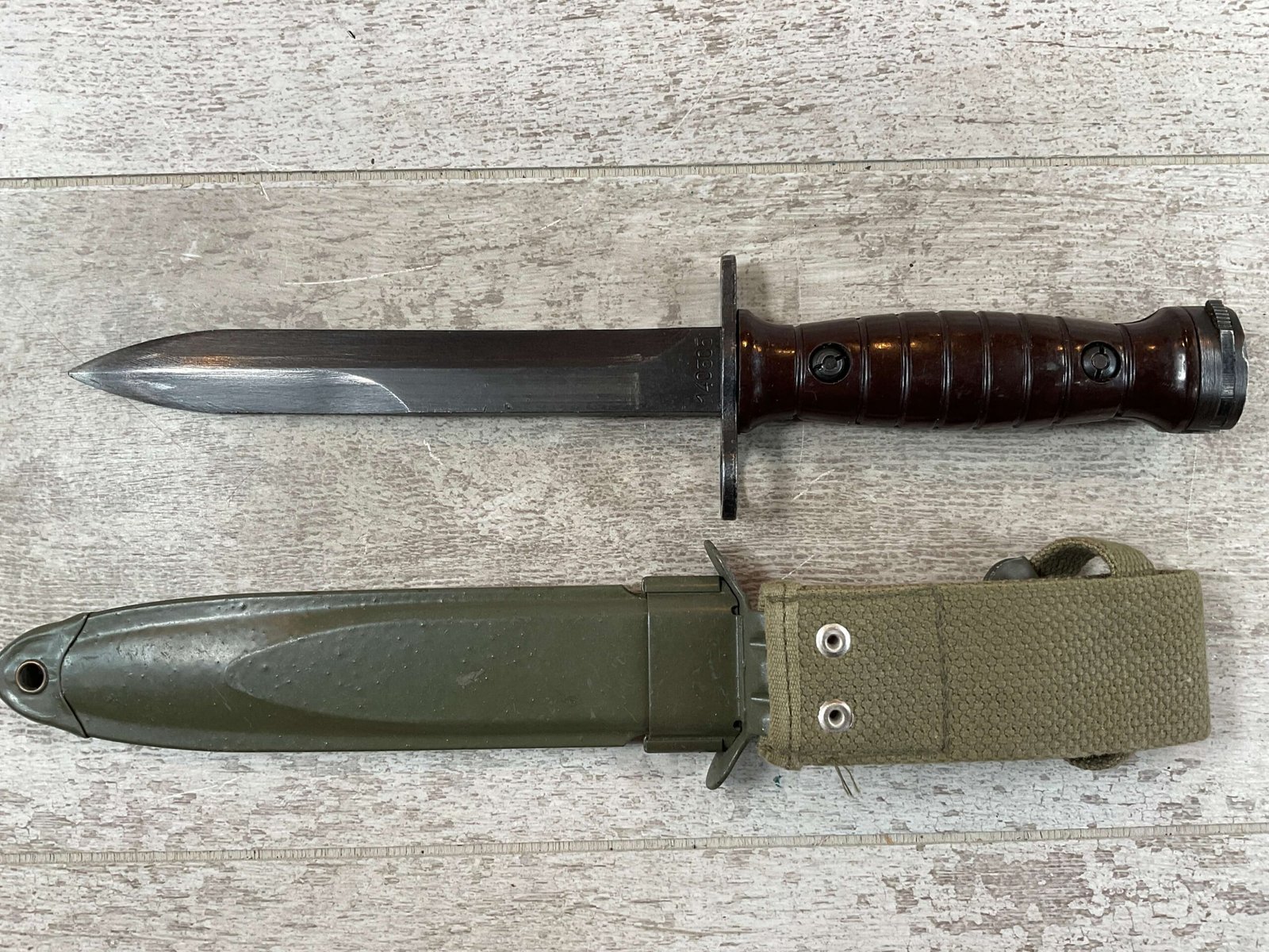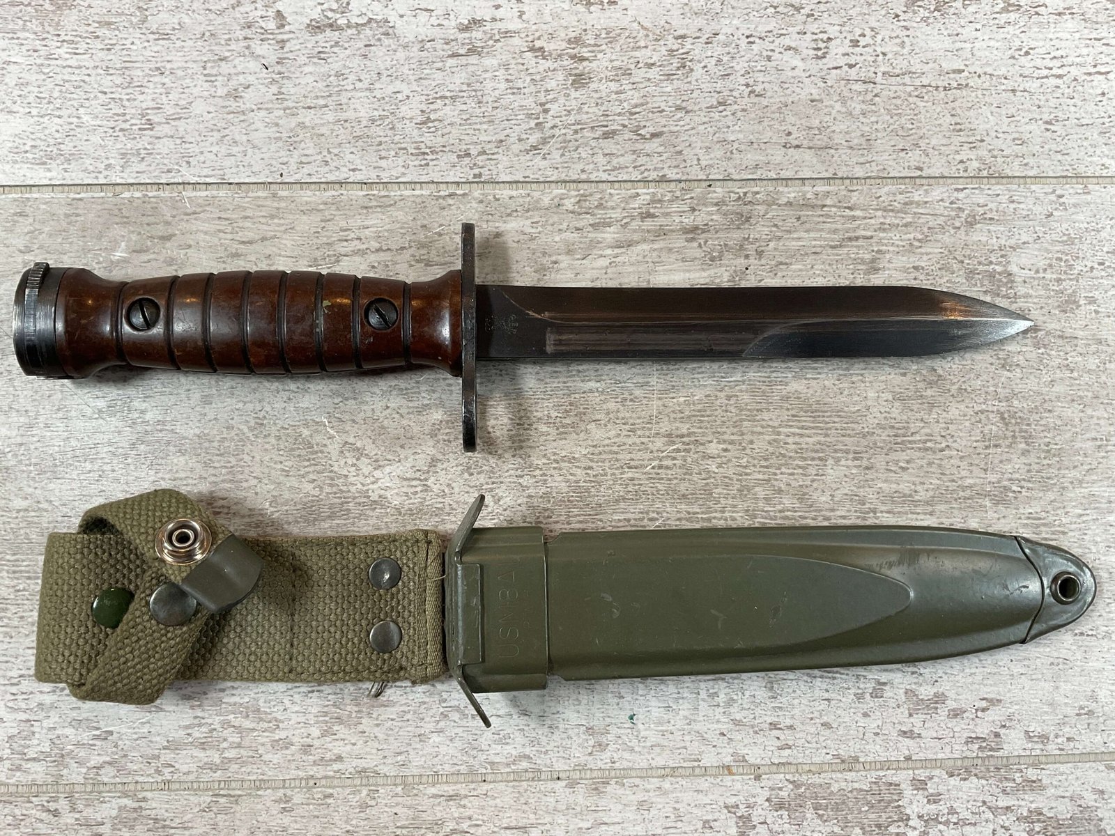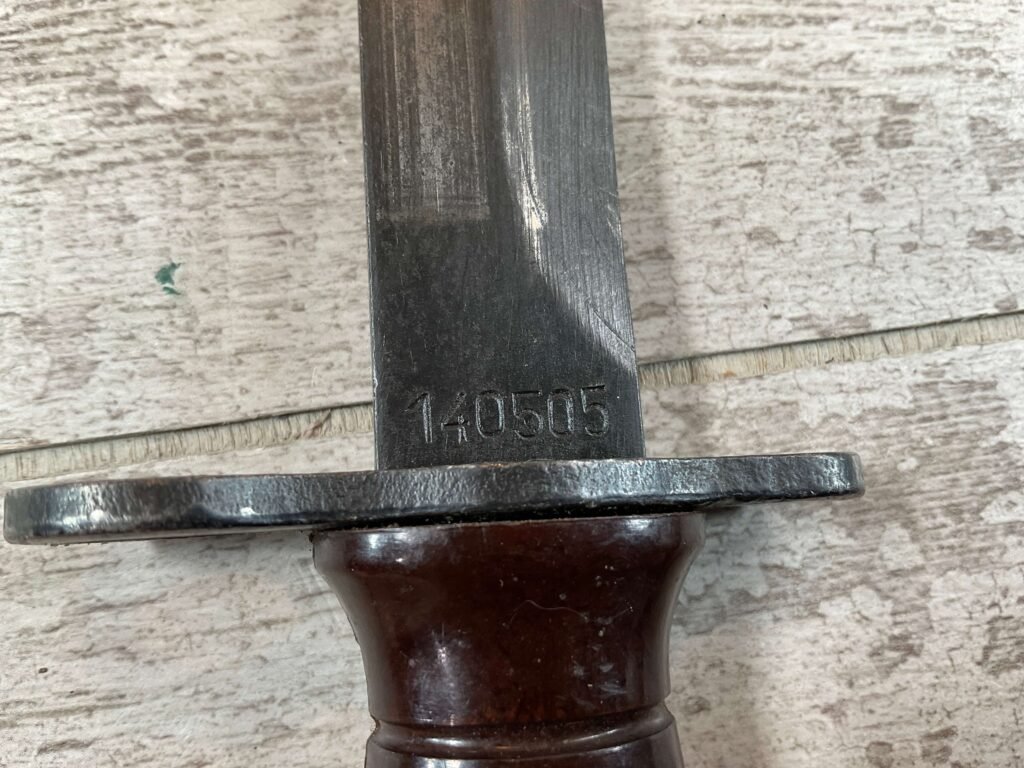 BM59 BM 59 ITALIAN BAYONET W/USM8A1 SCABBARD, SCABBARD IS MARKED “USM8A1/PWH” IN EXC CONDITION, BAYONET IS MARKED “A.E.T./FLAMING BOMB/CROSSED CANNONS/1960”, OTHERSIDE IS MARKED “140505”, MARBLE BROWN RUBBED PLASTIC HILT, EXC OVERALL CONDITION