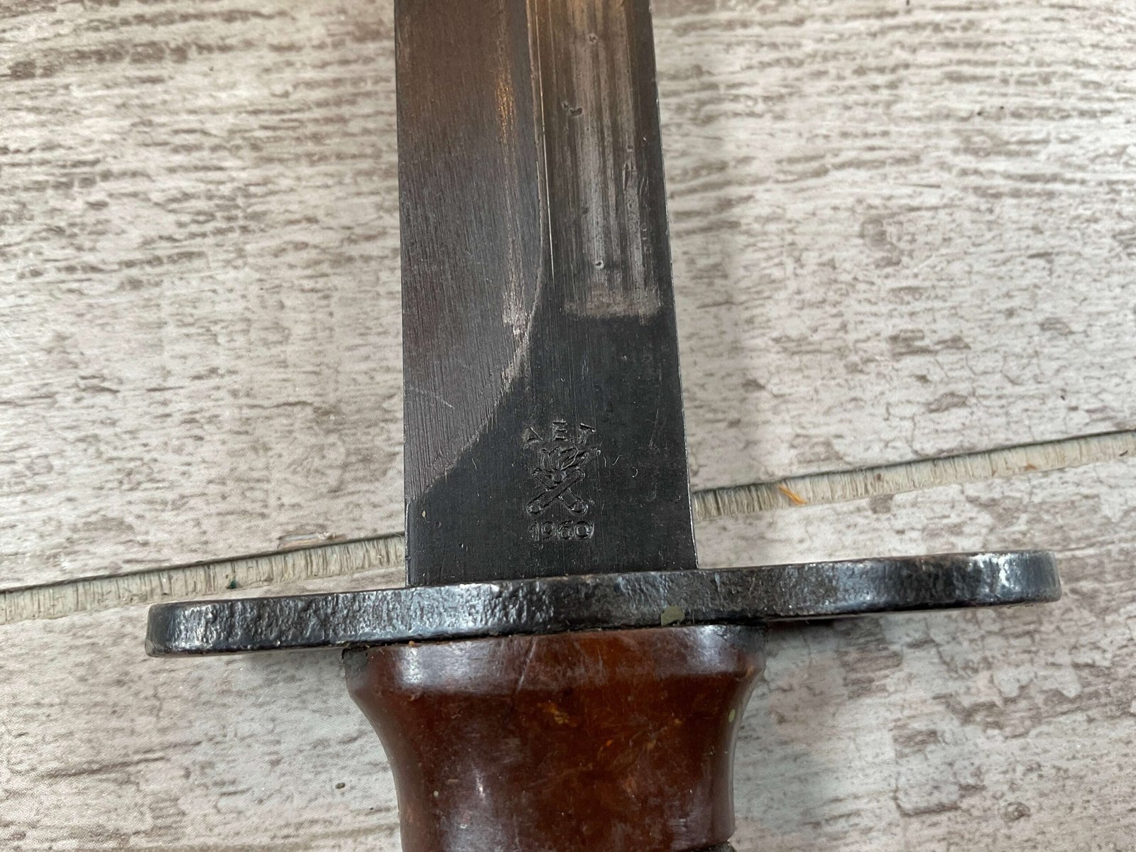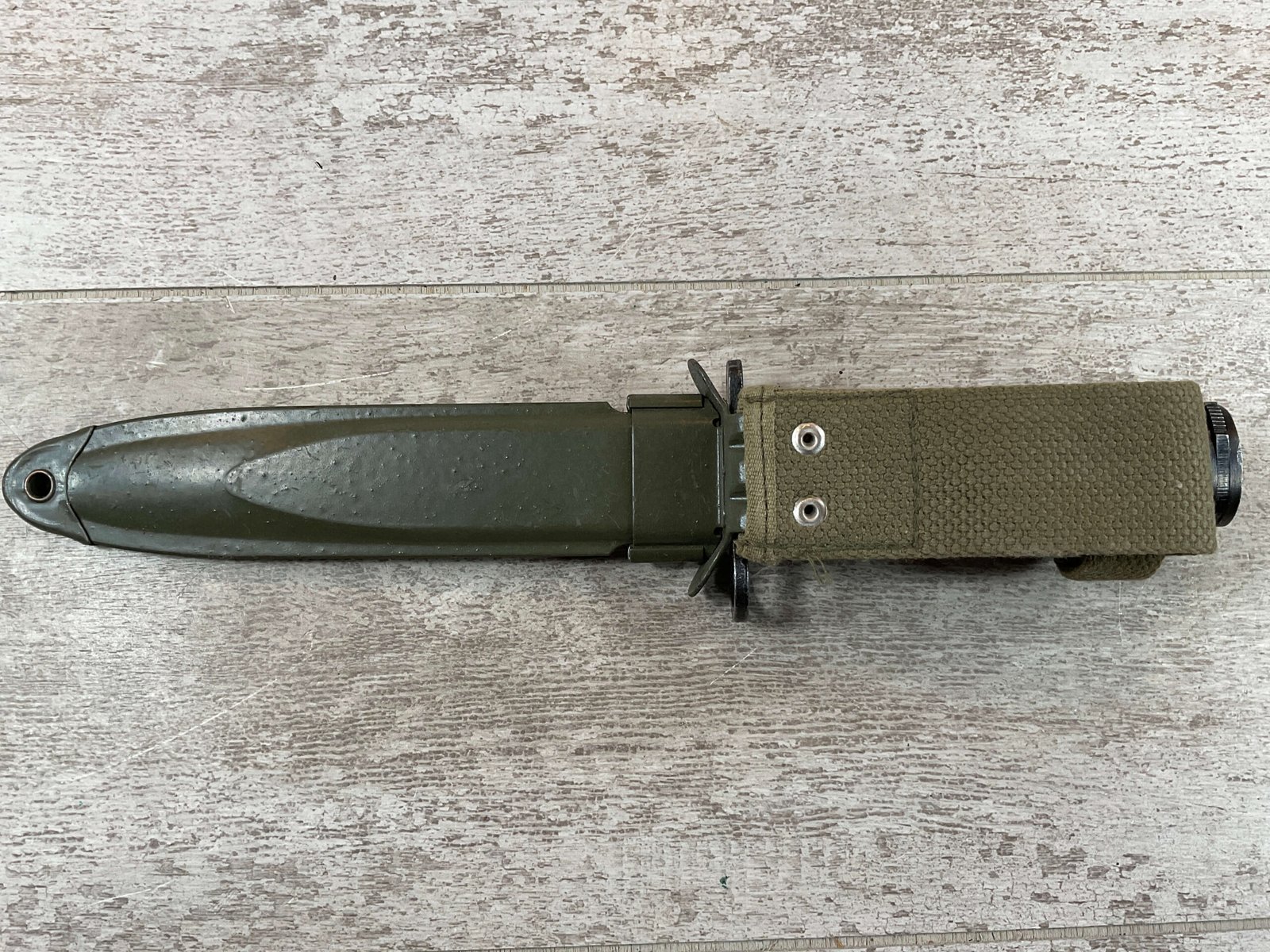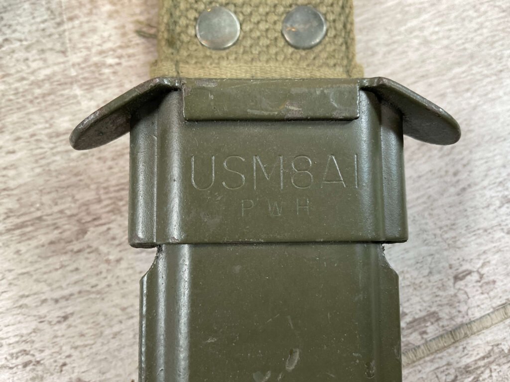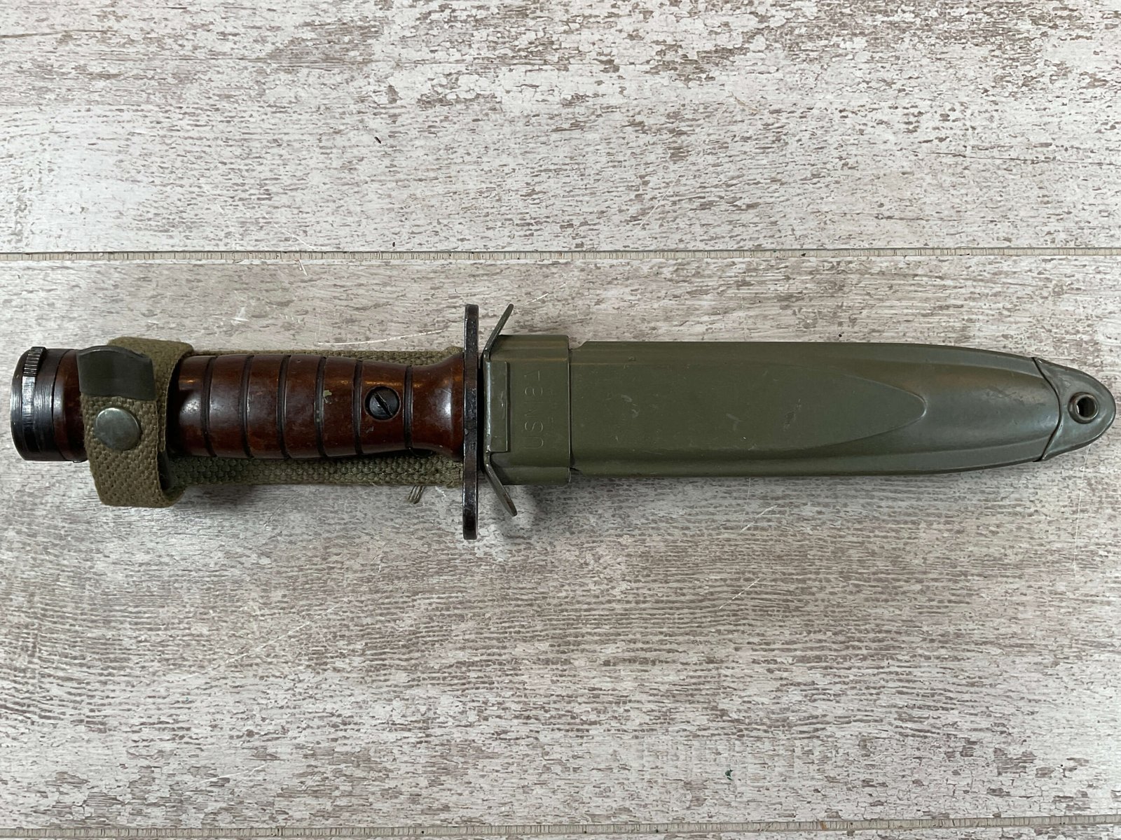 BM59 BM 59 ITALIAN BAYONET W/USM8A1 SCABBARD, SCABBARD IS MARKED “USM8A1/PWH” IN EXC CONDITION, BAYONET IS MARKED “A.E.T./FLAMING BOMB/CROSSED CANNONS/1960”, OTHERSIDE IS MARKED “140505”, MARBLE BROWN RUBBED PLASTIC HILT, EXC OVERALL CONDITION